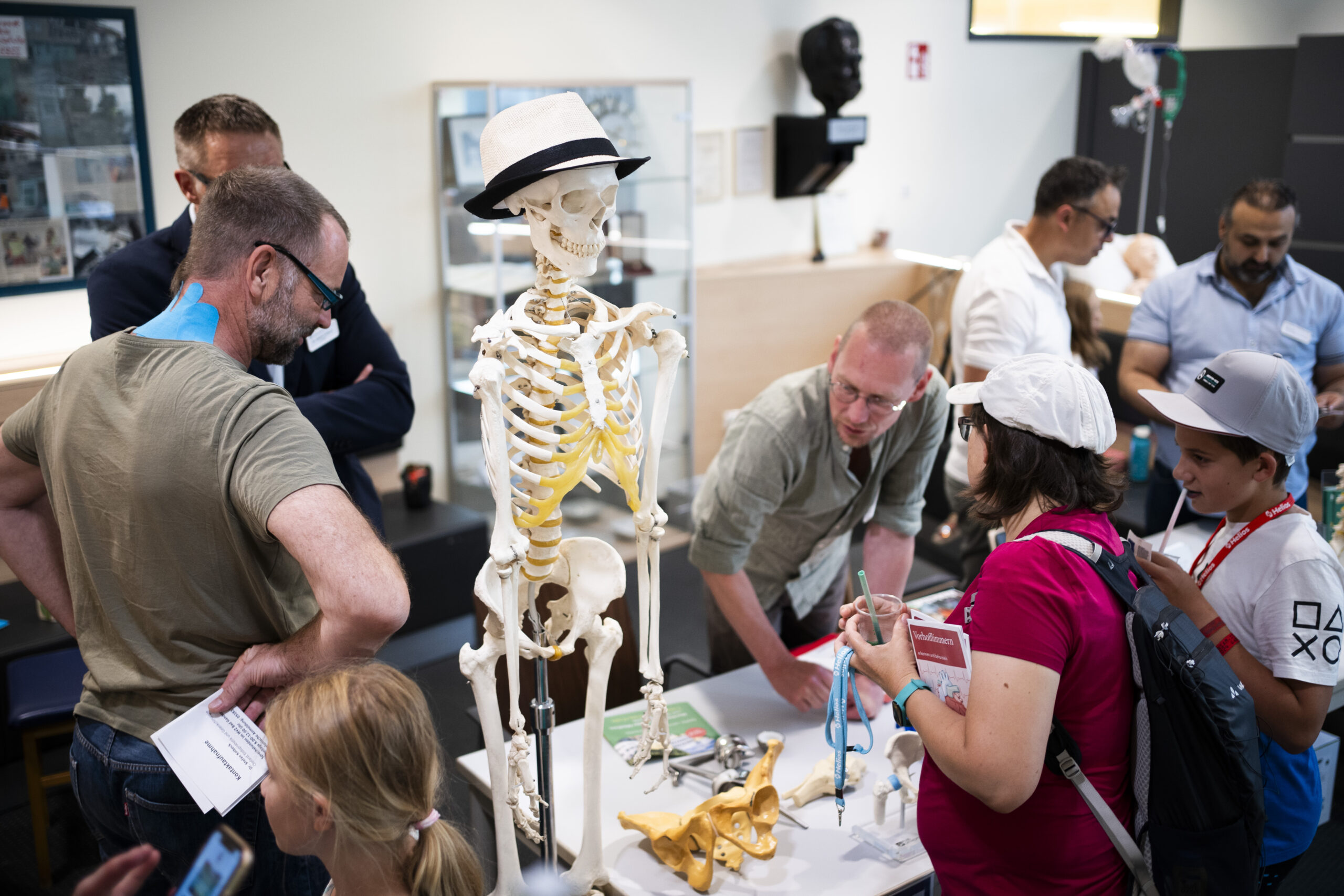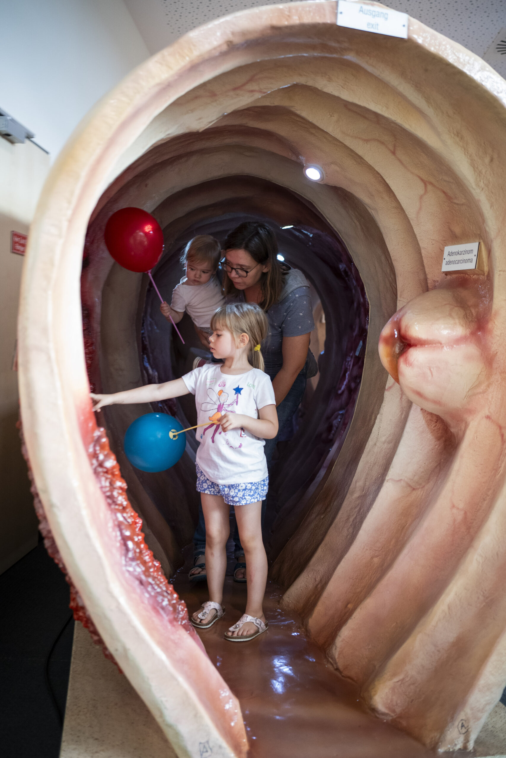 In zwei begehbaren Organmodellen konnten kleine und große Besucher nachvollziehen, wie Herz und Darm funktionieren. Nebenan haben Neugierige mit einem Endoskop am Kürbismodell erprobt, wie Urologen Nierensteine entfernen. Bei diesem „Eingriff“ wird das Kamerabild auf einen Monitor übertragen und der Nierenstein im Kürbis mit dem winzigen Steinfangkorbdraht gegriffen und entfernt. Ähnliches Geschick war am chirurgischen Operationstrainer im OP-Saal gefragt, wo es Gummibärchen zu zerteilen galt. Beim Stand der Geriatrie (Altersmedizin) konnte man in einen speziellen Anzug schlüpfen und erfahren, wie es sich anfühlt, mit altersbedingten körperlichen Einschränkungen Alltagshindernisse zu überwinden.