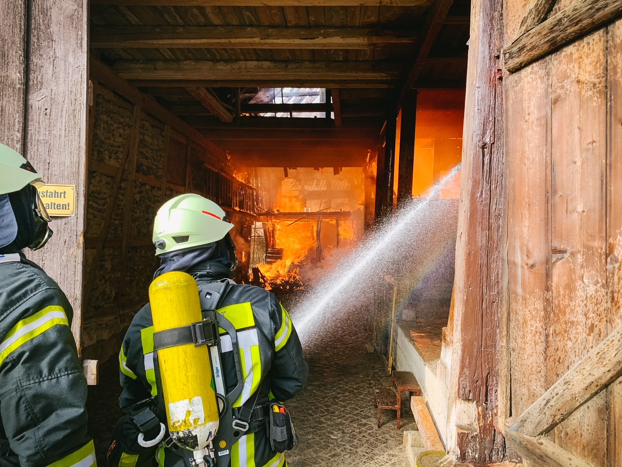 Unter anderem mit zwei Drehleitern konnte das Feuer schnell eingedämmt werden. Für die Wasserversorgung wurden über 1000 Meter Schlauchleitungen verlegt. Durch diesen massiven Löscheinsatz konnte verhindert werden, dass die umliegenden Gebäude Opfer der Flammen wurden.