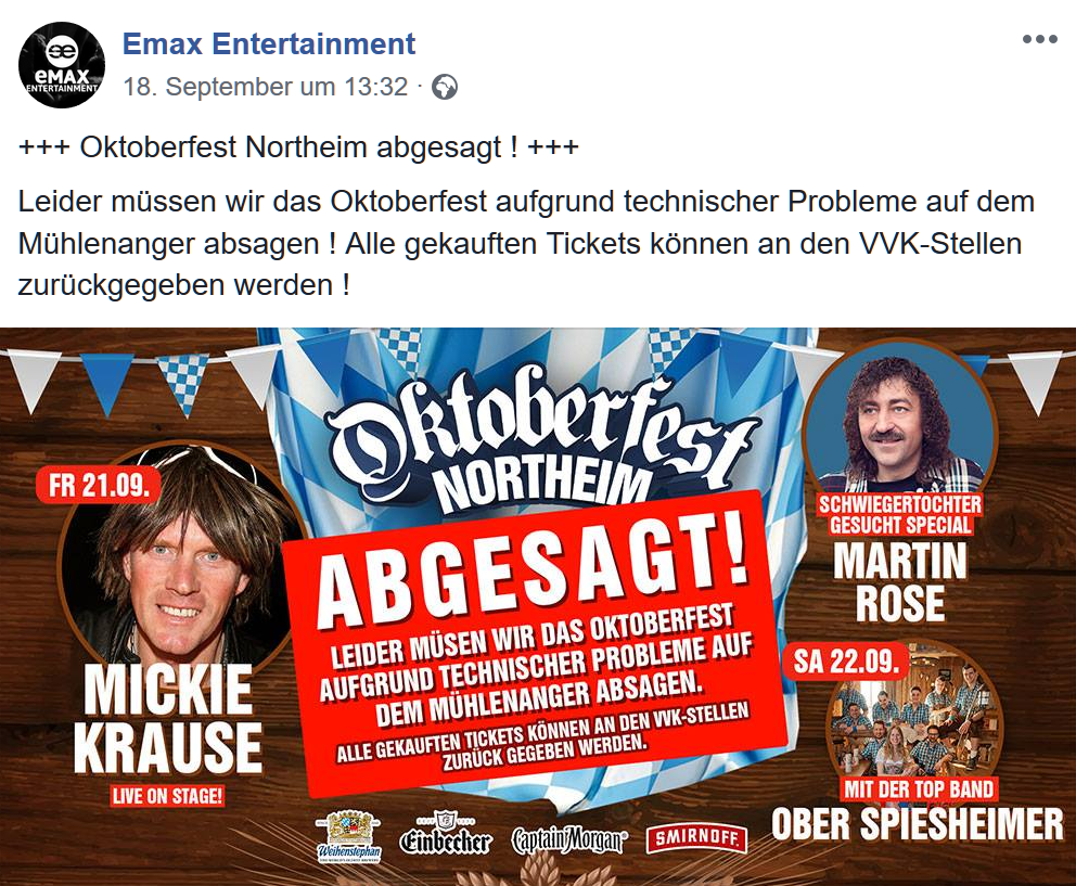 Die Stadt Northeim und eMax Entertainment bedauern außerordentlich, dass das für den 21./22.09.2019 auf dem Mühlenanger geplante Oktoberfest so kurzfristig abgesagt wurde. Die Veranstaltung hätte den örtlichen Veranstaltungskalender bereichert. Beidseitige Fehlinterpretationen in der Kommunikation über das zeitliche Veranstaltungsende haben den Veranstalter annehmen lassen, dass Anforderungen nicht erfüllt sind. Beide Partner sind nach einem klärenden Telefonat überzeugt, die in der Vergangenheit bestehende gute Zusammenarbeit auch künftig erfolgreich fortführen zu können. Erste Gedanken an ein Oktoberfest 2019 sind daher schon kommuniziert worden. Auch künftig wird eMax Entertainment mit der Mallorca Mania-Party am Freizeitsee ein verlässlicher Veranstalter sein. Für ein kommendes Projekt, für das voraussichtlich schon bald Verhandlungen aufgenommen werden können, bewirbt sich der Veranstalter mit seiner Kompetenz und Erfahrung.