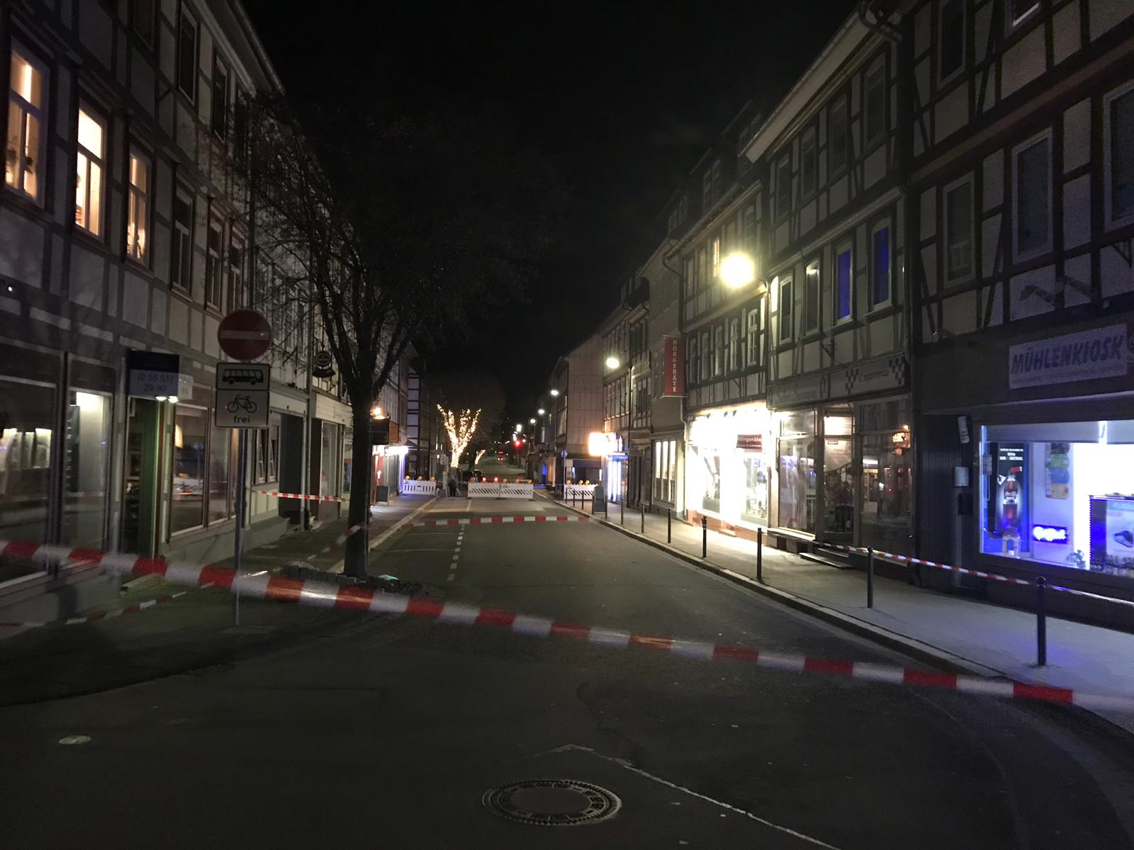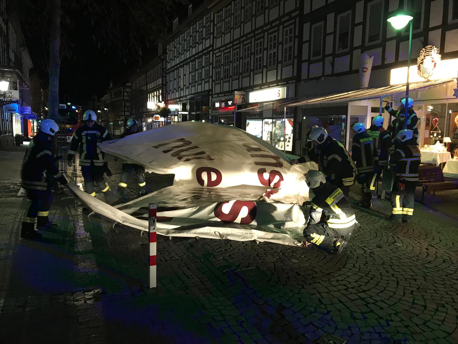 Entlang der Breiten Straße in Northeim musste die Feuerwehr eine größere Plane gegen den Sturm sichern. Die Mühlenstraße ist derzeit gesperrt: dort sind bereits Dachziegel auf die Straße gestürzt.