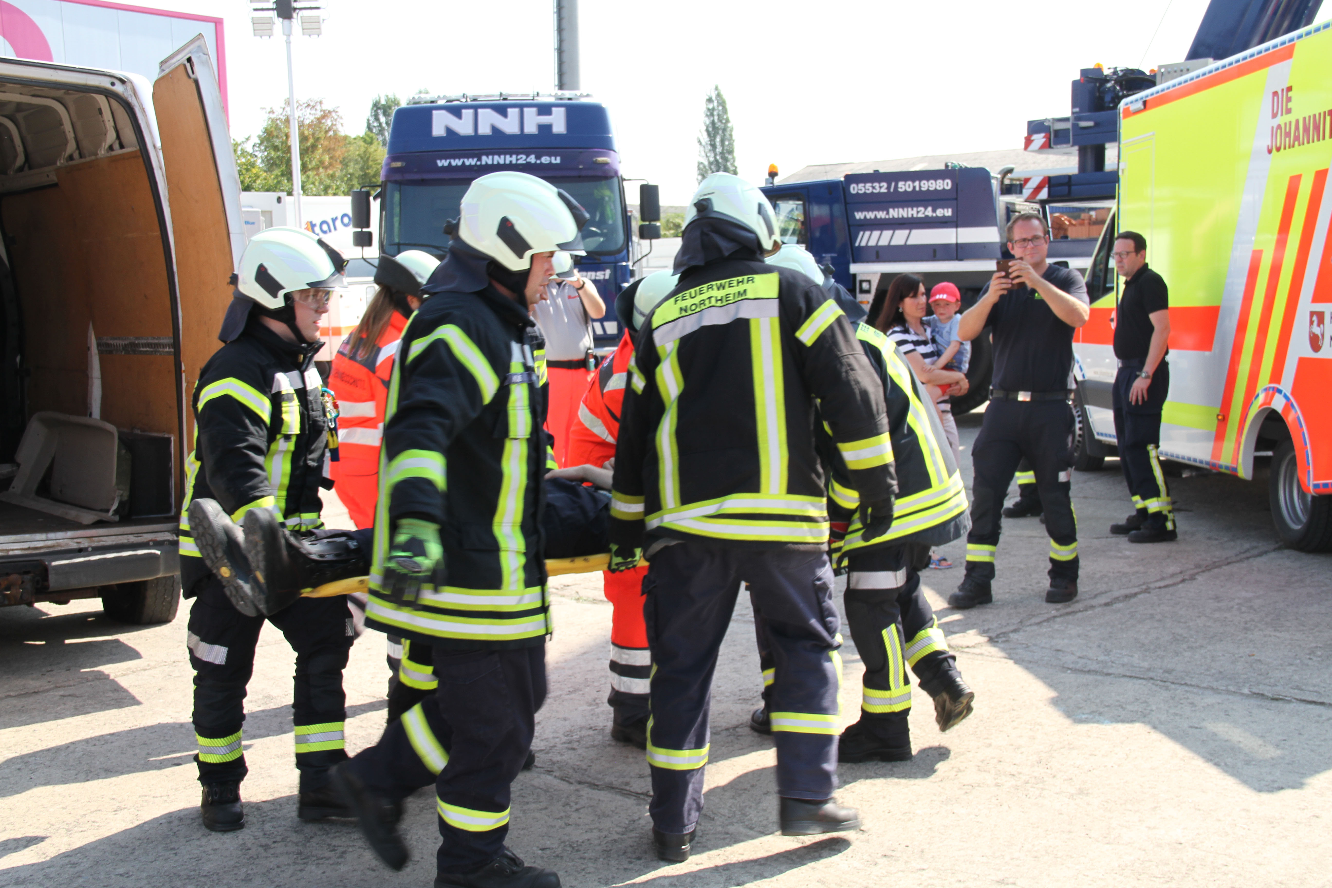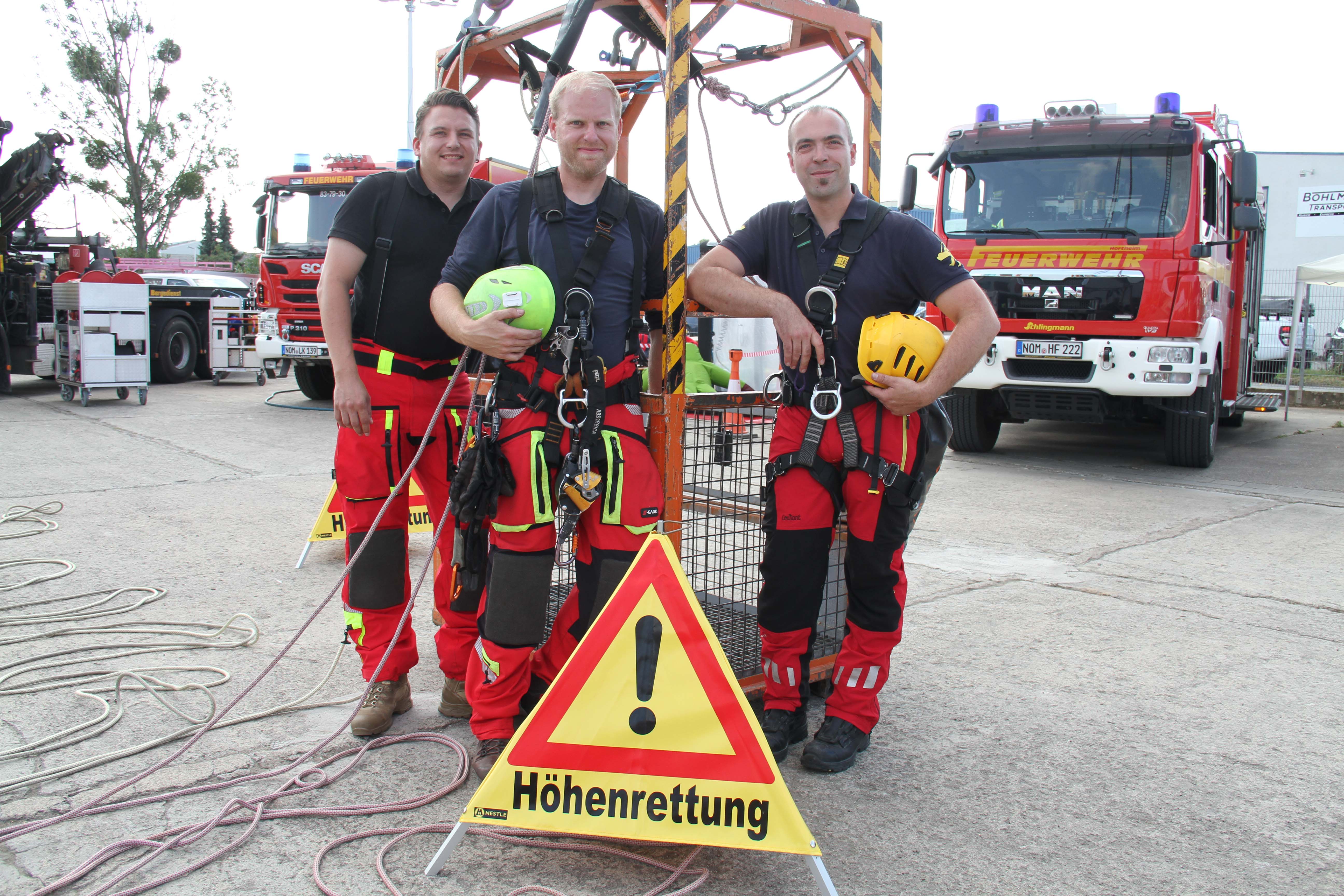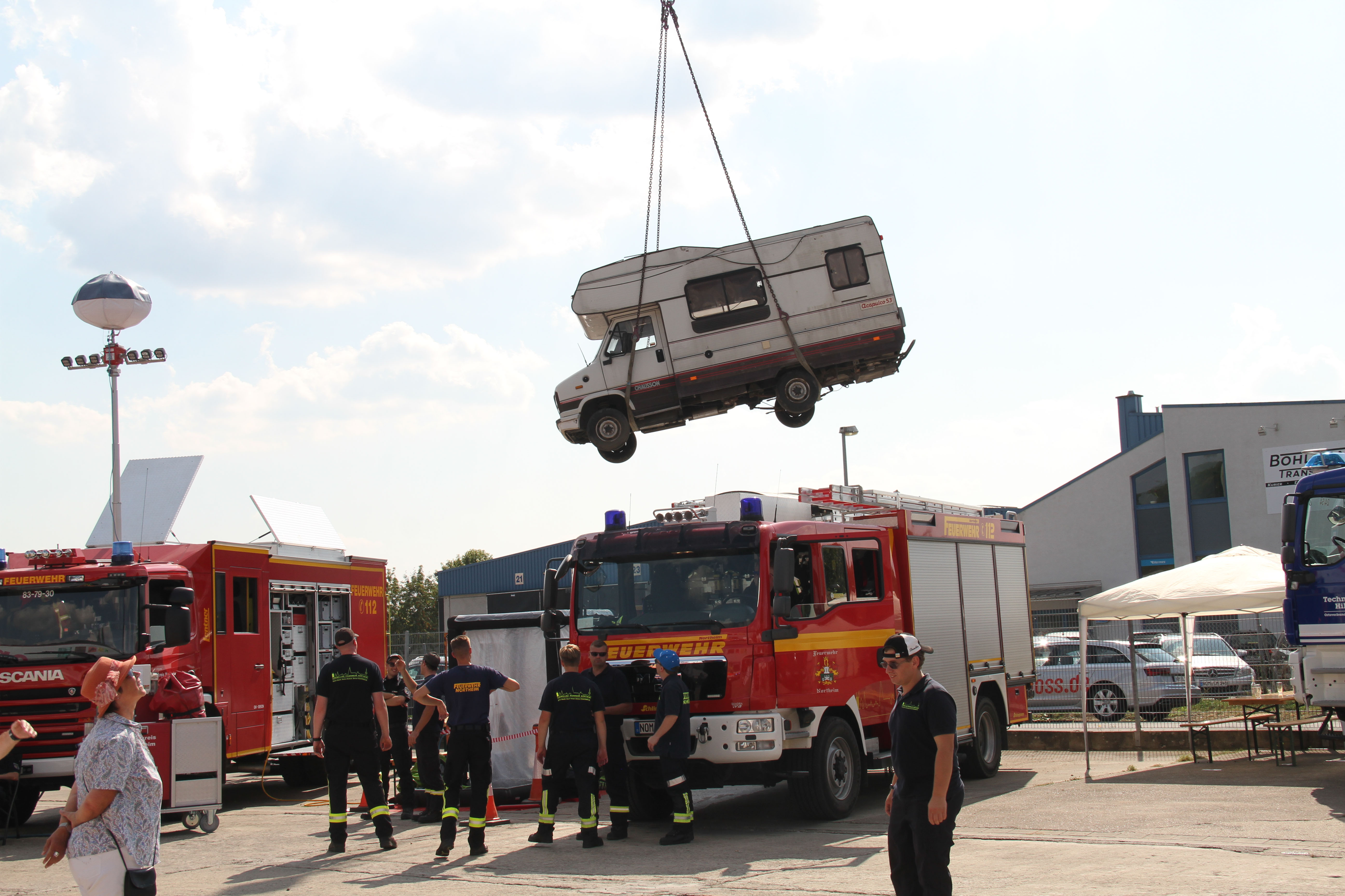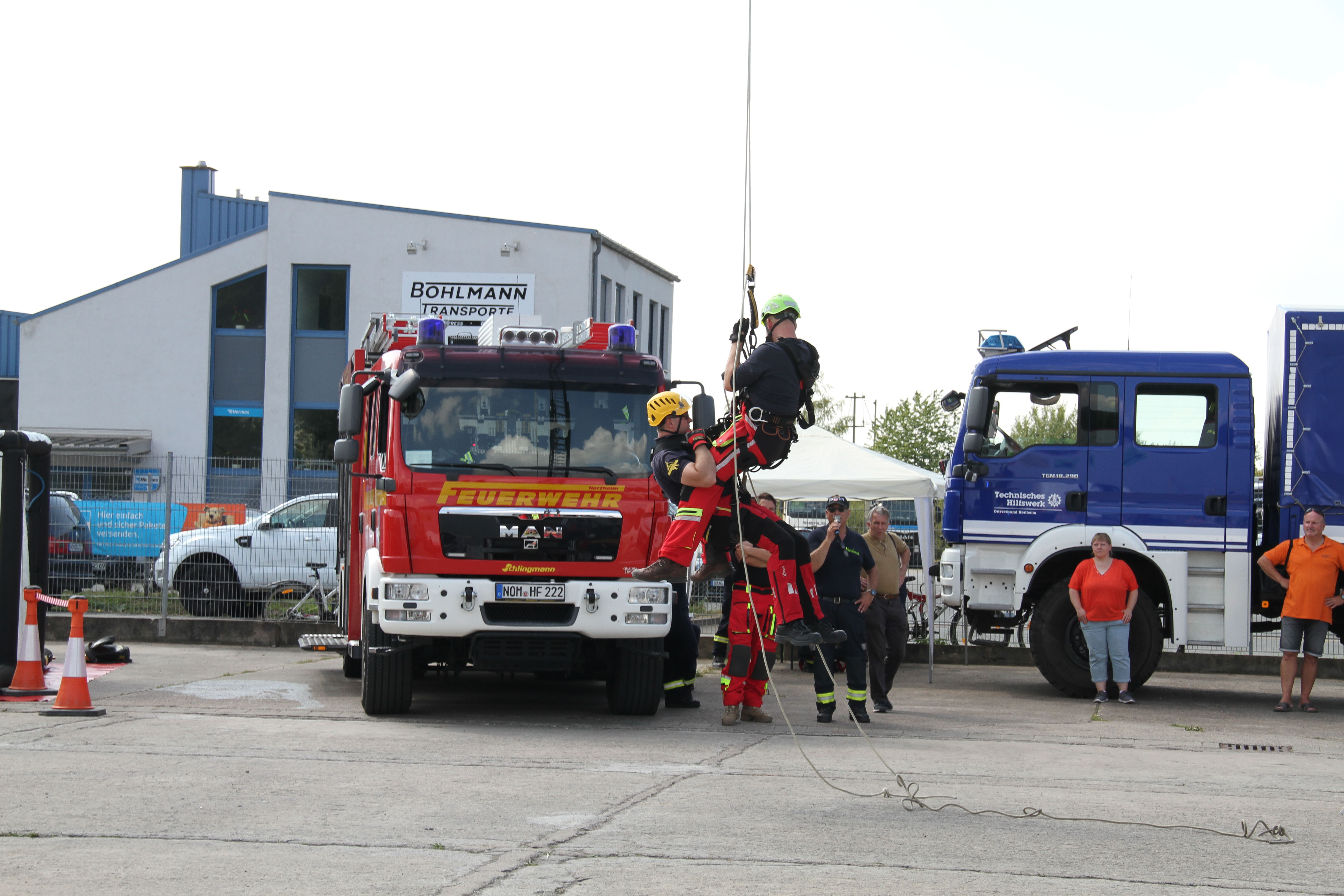 Partner wie die Freiwillige Feuerwehr und das BMW-Autohaus Leinetal zeigten sich ebenfalls. Die Feuerwehr präsentierte die technische Rettung aus einem Lieferwagen und einem Wohnmobil, die Spezialtruppe der Höhenretter seilte sich aus einem Kran ab. Highlight war für viele Besucher aber die Fahrt in der 50-Meter-Hubbühne. Dank des guten Wetters war der Blick nicht nur über das Fest, sondern über das komplette Stadtgebiet möglich.