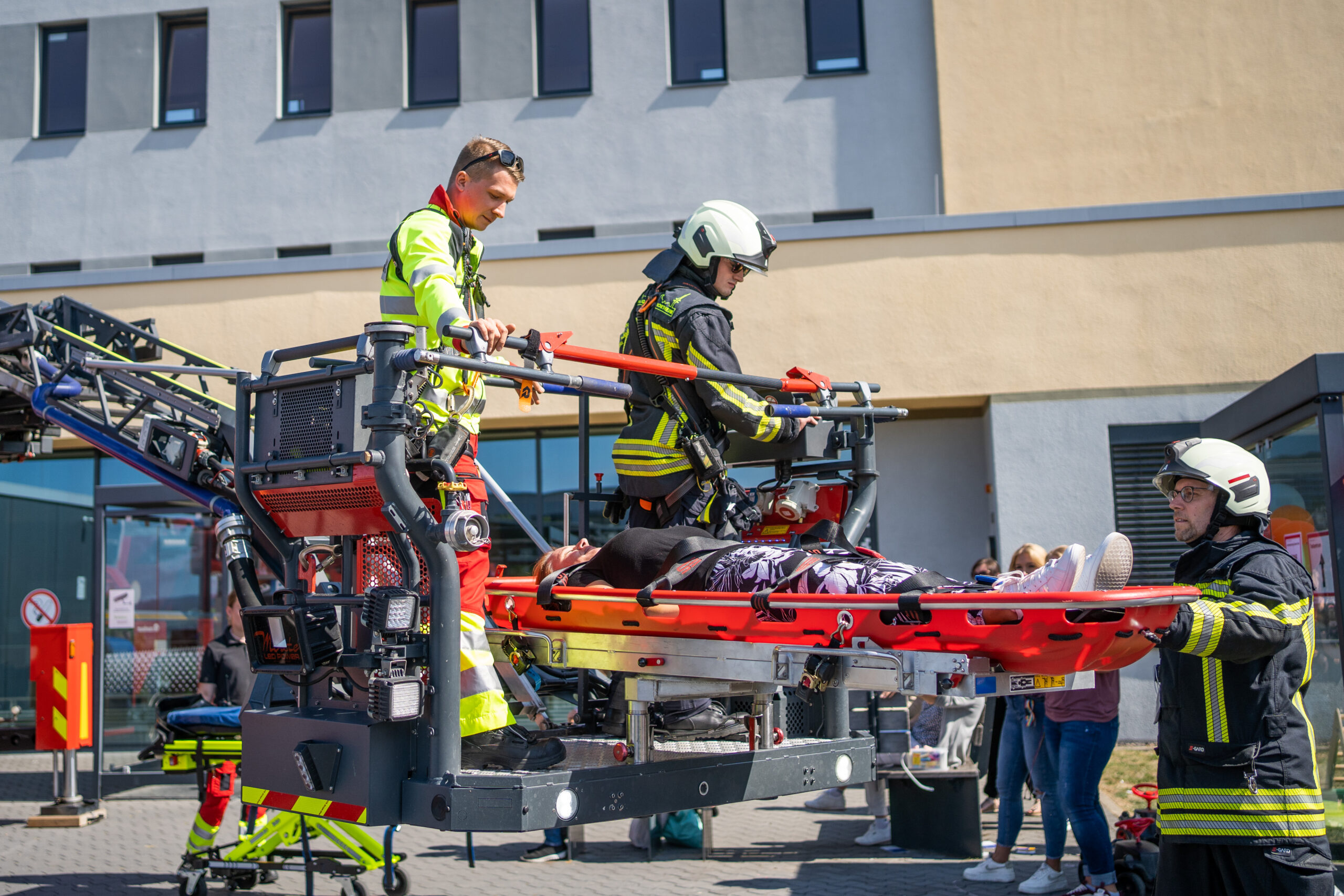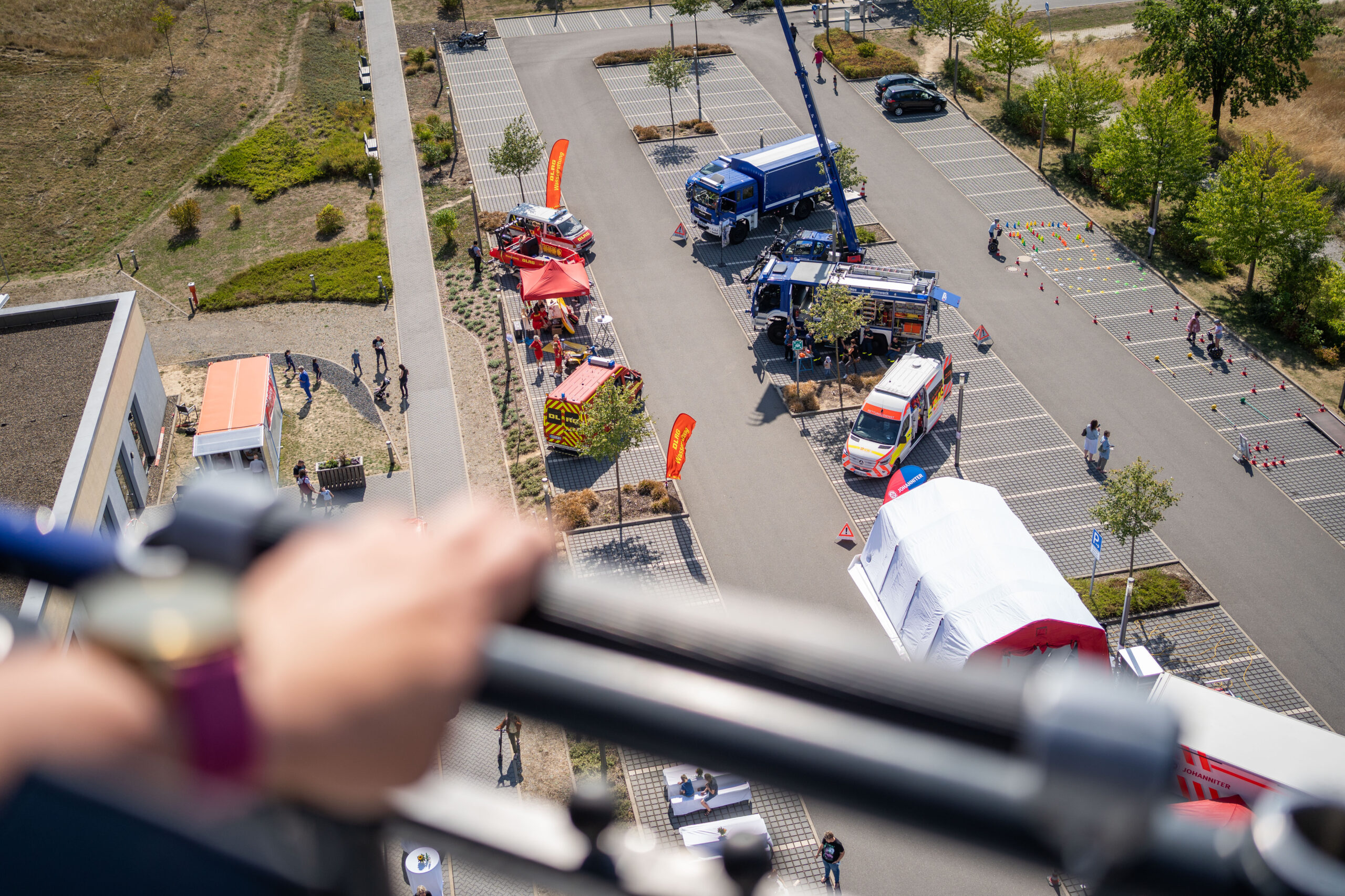 Auf dem Klinikparkplatz lädt die Feuerwehr zum Kistenstapeln am Drehleiterfahrzeug ein und die Fachgruppe Rettungsrobotik führt eine Übung durch. THW, DLRG sowie Rettungs- und Krankentransportdienste sind mit Fahrzeugen und Mitmachaktionen dabei. In einer Bungee-Run-Anlage kann man Sprintfähigkeiten und Kraft testen – und gegen die „schnellste Urologin der Welt“ antreten. Der Northeimer Handball-Club ist mit einer Wurfgeschwindigkeitsanlage vor Ort.