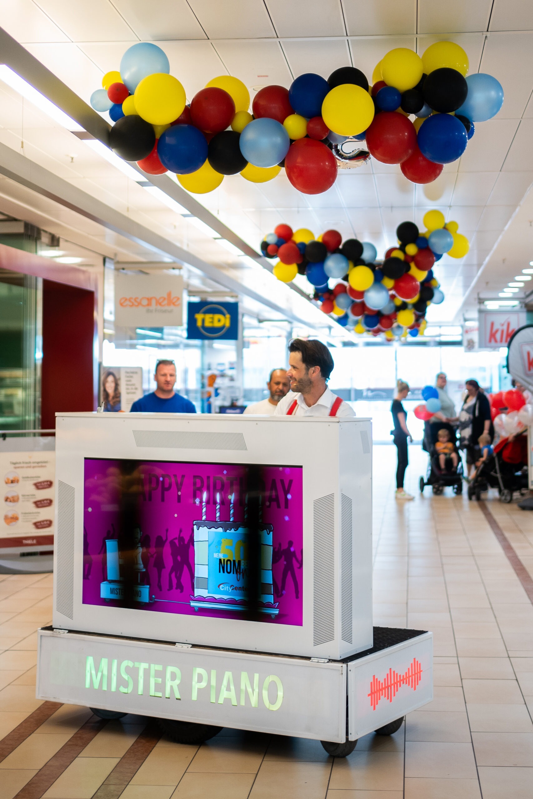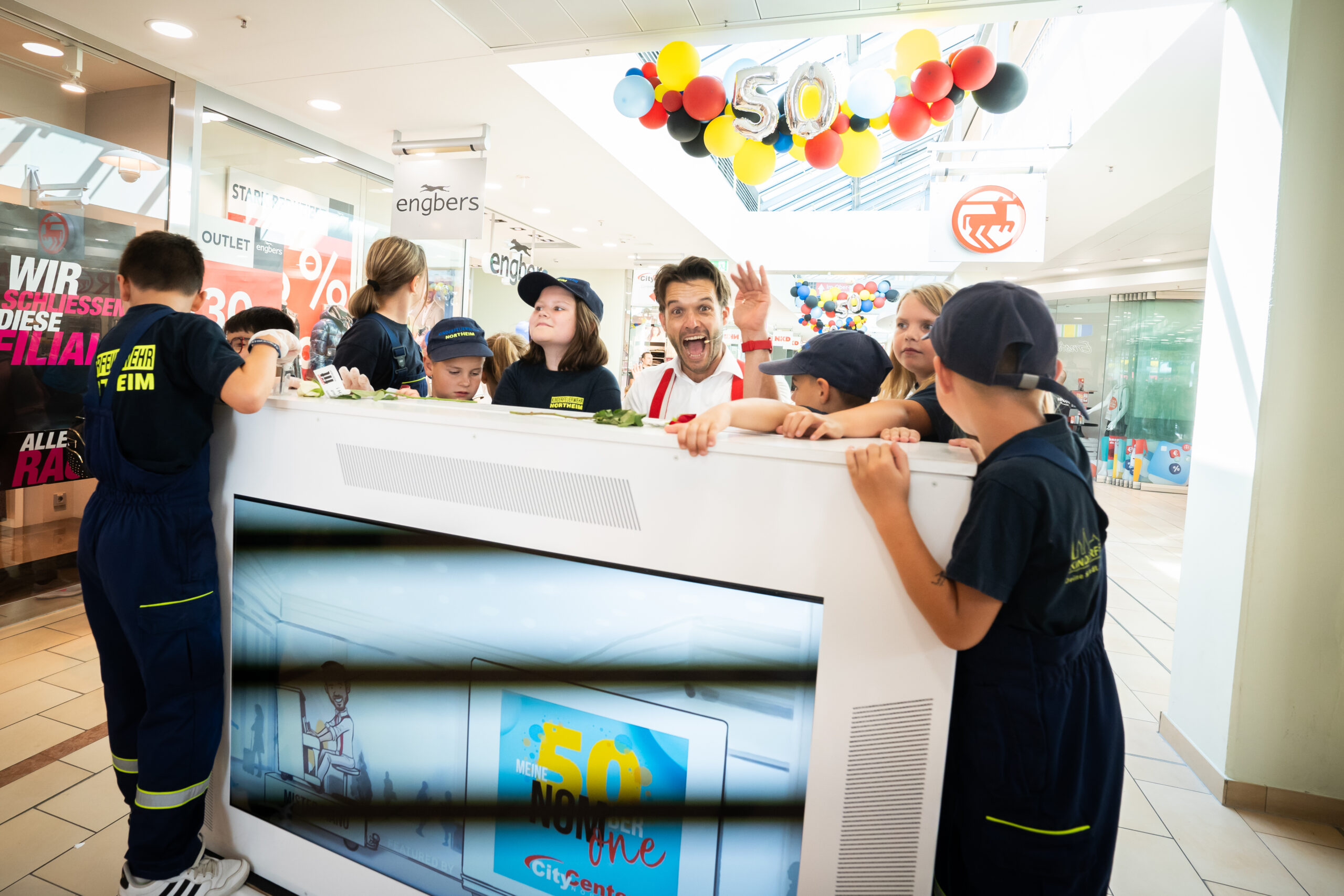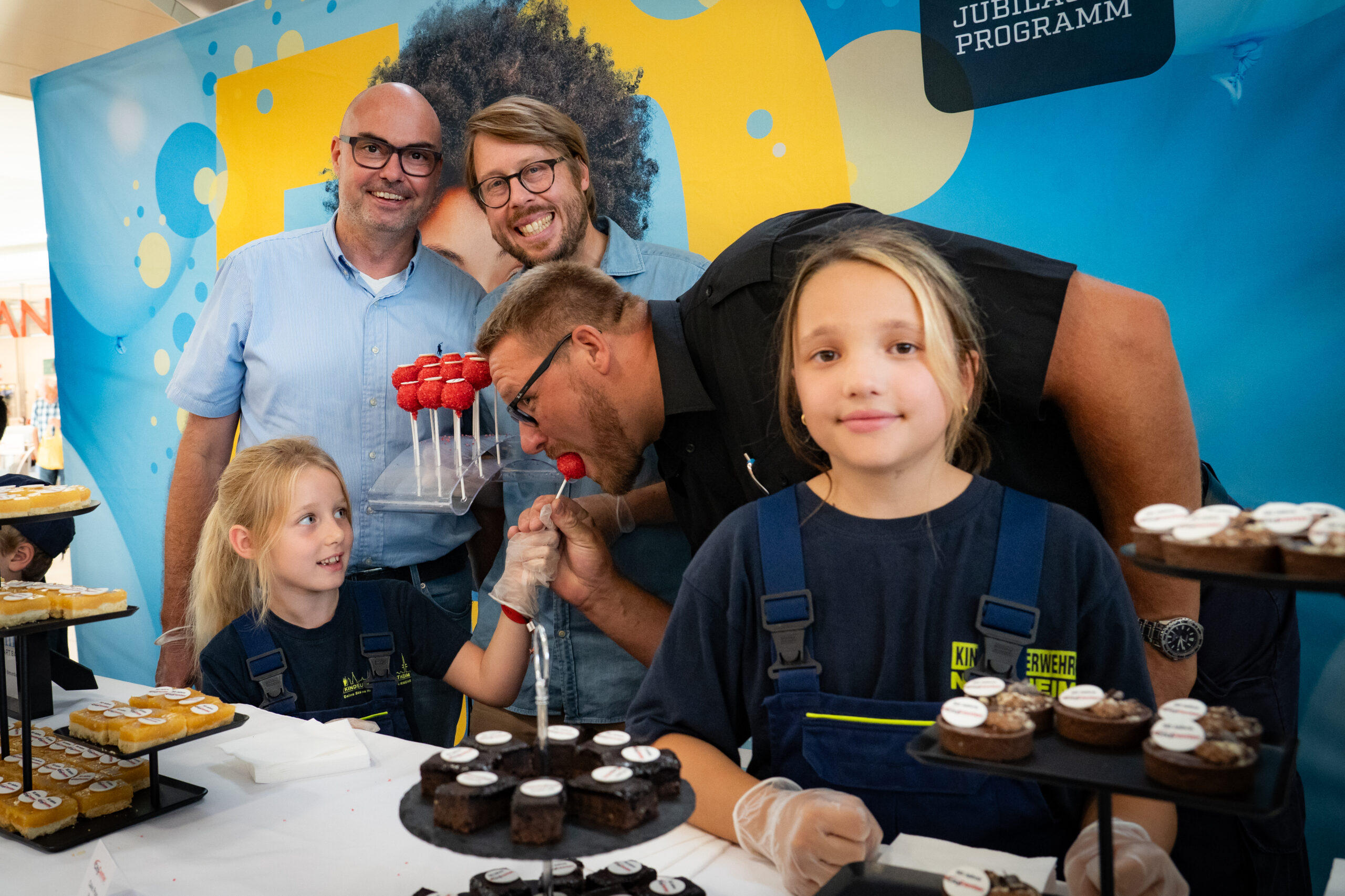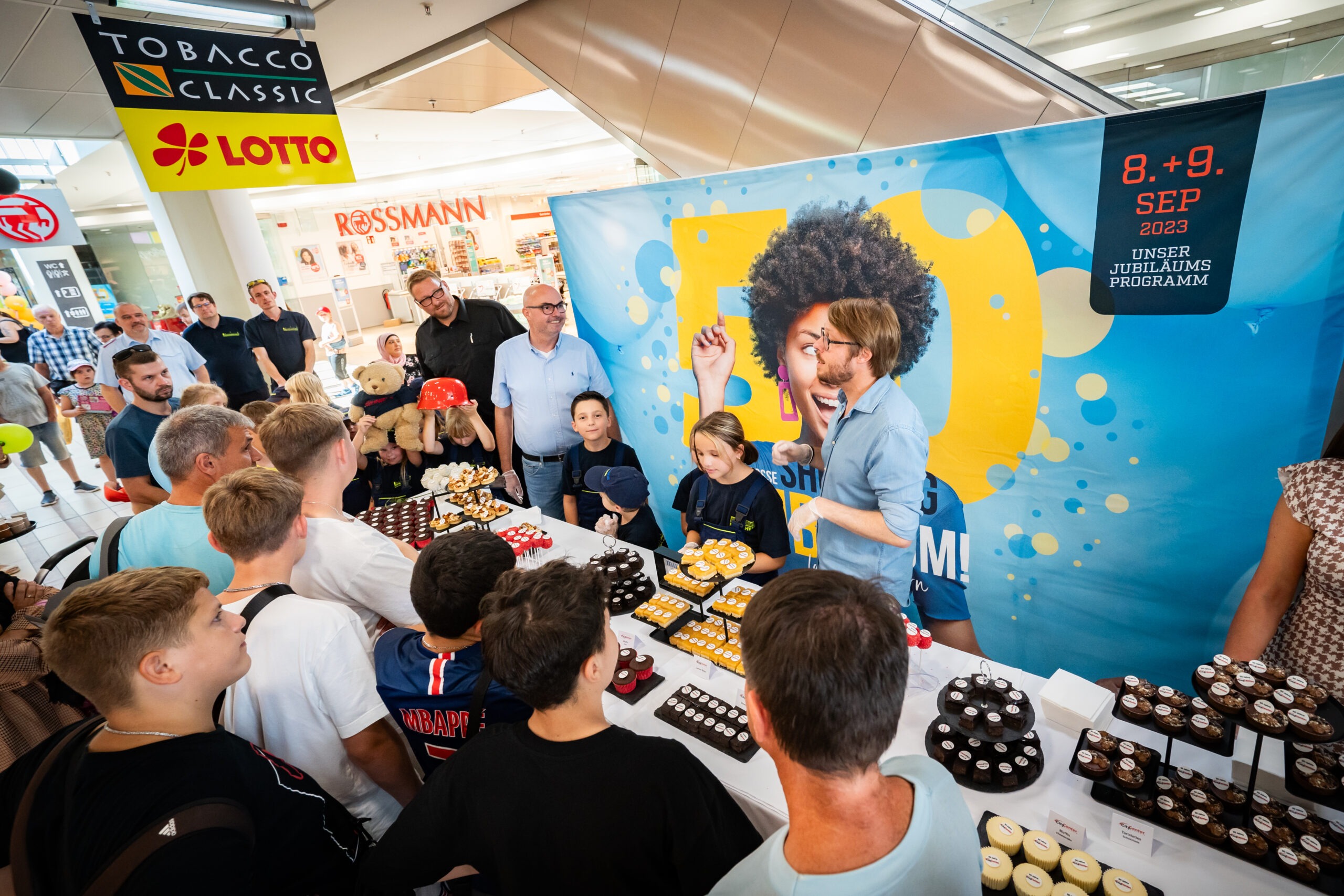 Am Freitag beteiligte sich das City Center auch am verlängerten Abend-Shoppen. Zuvor wurde aber aus Anlass des 50. Geburtstages leckerer Kuchen verschenkt. Im Gegenzug war es möglich, Spenden an die Kinderfeuerwehr zu hinterlegen. Die Kinder selbst waren auch vor Ort, halfen bei der Ausgabe des Kuchen und gingen selbst im Entenmarsch und begleitet von einem rollenden Piano durch das Center. Auch Bürgermeister Simon Hartmann half beim Verteilen der Kuchenteile – und gratulierte in Richtung Center-Manager Lorenz Körbelin gleich als erster zum 50. Geburtstag.