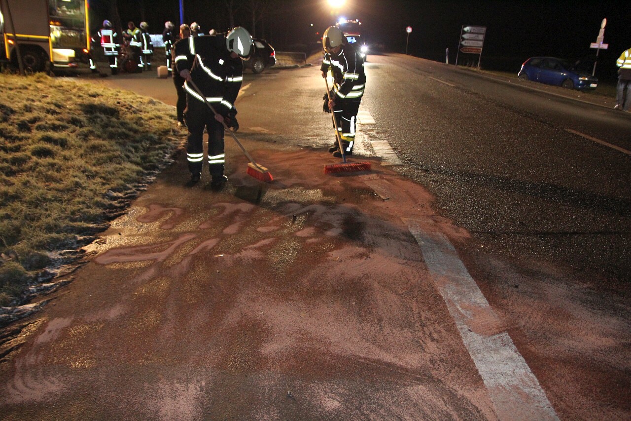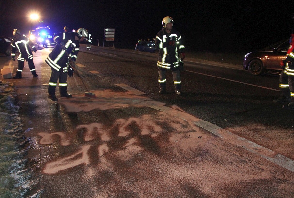 Die Bundestraße wurde zeitweise komplett gesperrt. Die Feuerwehr musste ausgetretendes Öl aufsammeln.