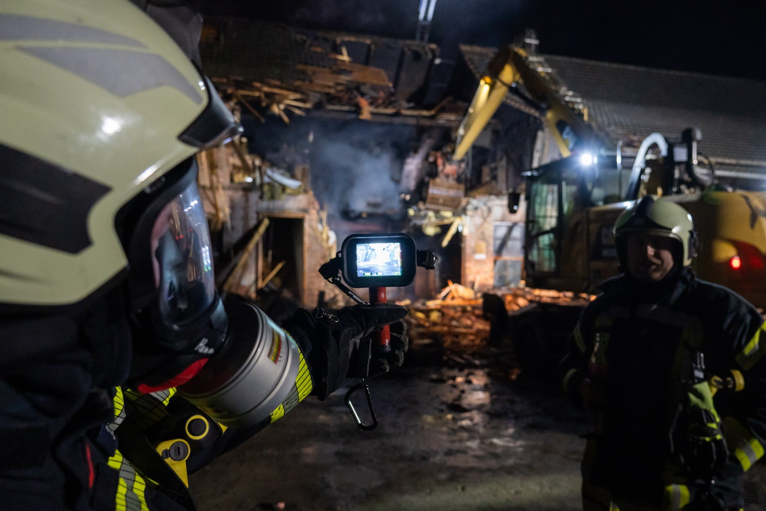 Denn inzwischen hat die Feuerwehr ein Abrissunternehmen zur Hilfe geholt. Aus dem Dach steigt dichter Qualm, hier und da flammt es kurz orange-heiß auf. Die Retter haben sich nach zwölf Stunden Dauereinsatz dazu entschieden, teile der Scheune einzureißen um so an die letzten Glutnester zu komme. Anders, sagt Einsatzleiter Weiß, komme die Feuerwehr nicht mehr an den Brand. Die Gefahr, dass sich aus der Glut immer wieder ein Feuer entwickelt, sei zu groß. Die Gefahr, dass das ganze Gebäude übergeht und ein angrenzender Kuhstall samt Tiere in Flammen aufgeht – ein Risiko, das die Retter nicht eingehen wollen.