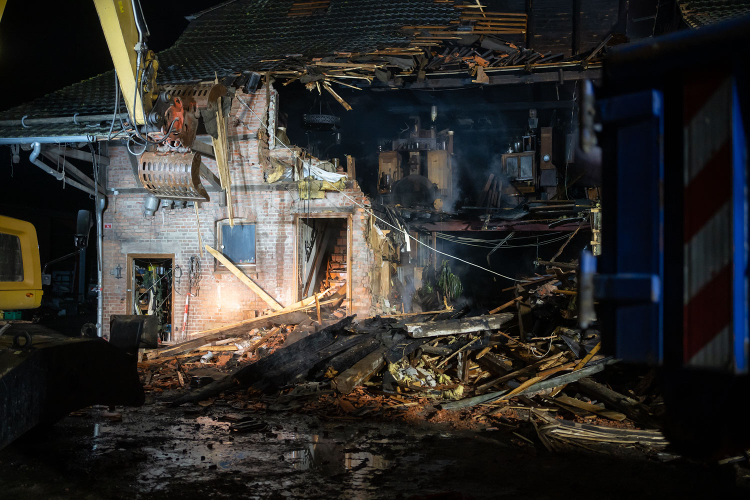 Aufgrund der hohen Hitze und das Löschwasser hat sich die Zwischendecke bereits durchgebogen. Ein Fachberater des Technischen Hilfswerks gibt gegen Mittag schließlich das Kommando: Niemand darf mehr in das Gebäude. Es drohe, einzustürzen. Mittlerweile ist nur noch Glut und Feuer in dem Haus, keine Menschen. Und eine Tischlerei, im Obergeschoss werden sonst alte Möbel restauriert. Eine Schatzkammer voller Antiquitäten wird erst ein Raub der Flammen, dann der unnachgiebigen Baggerklaue.
