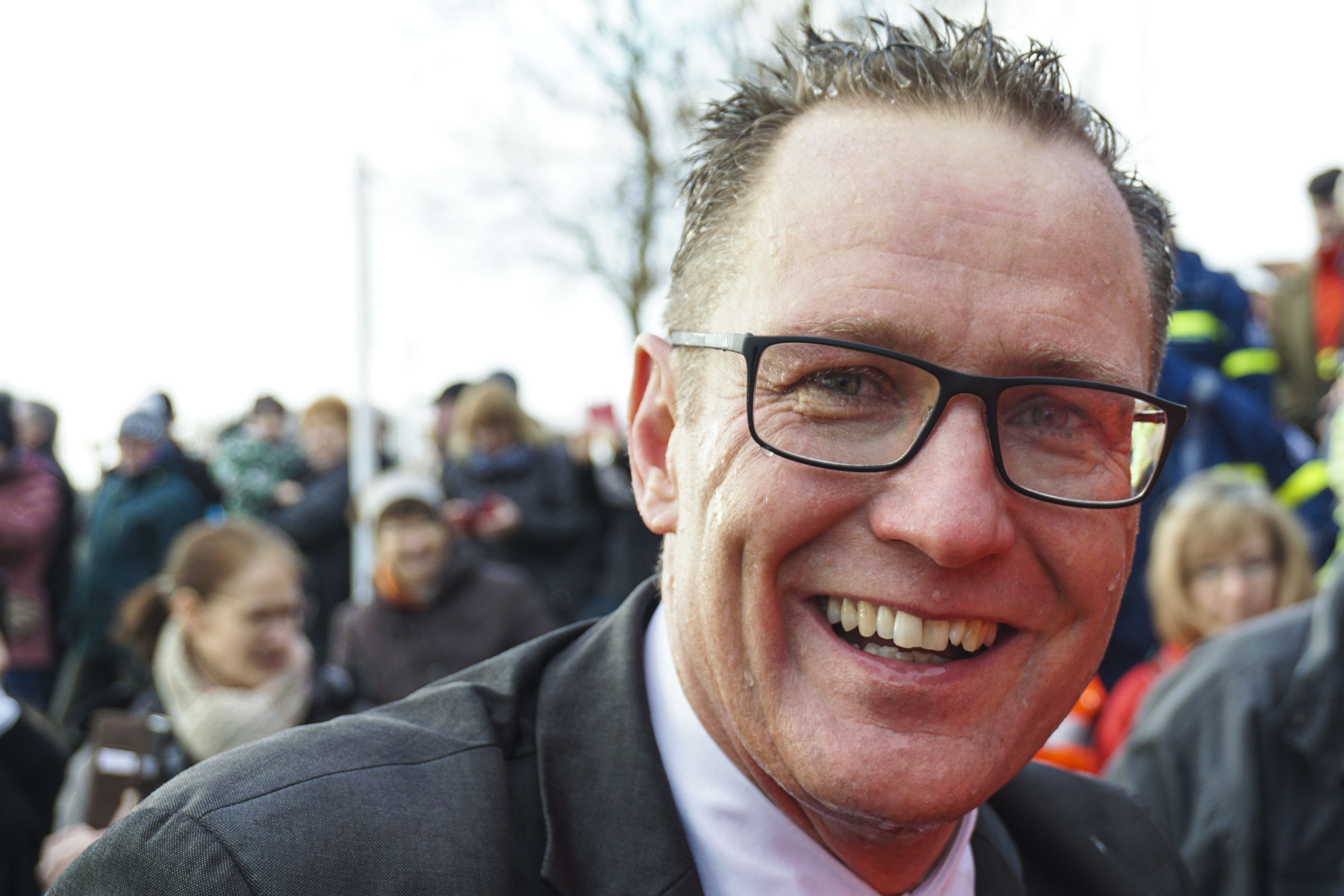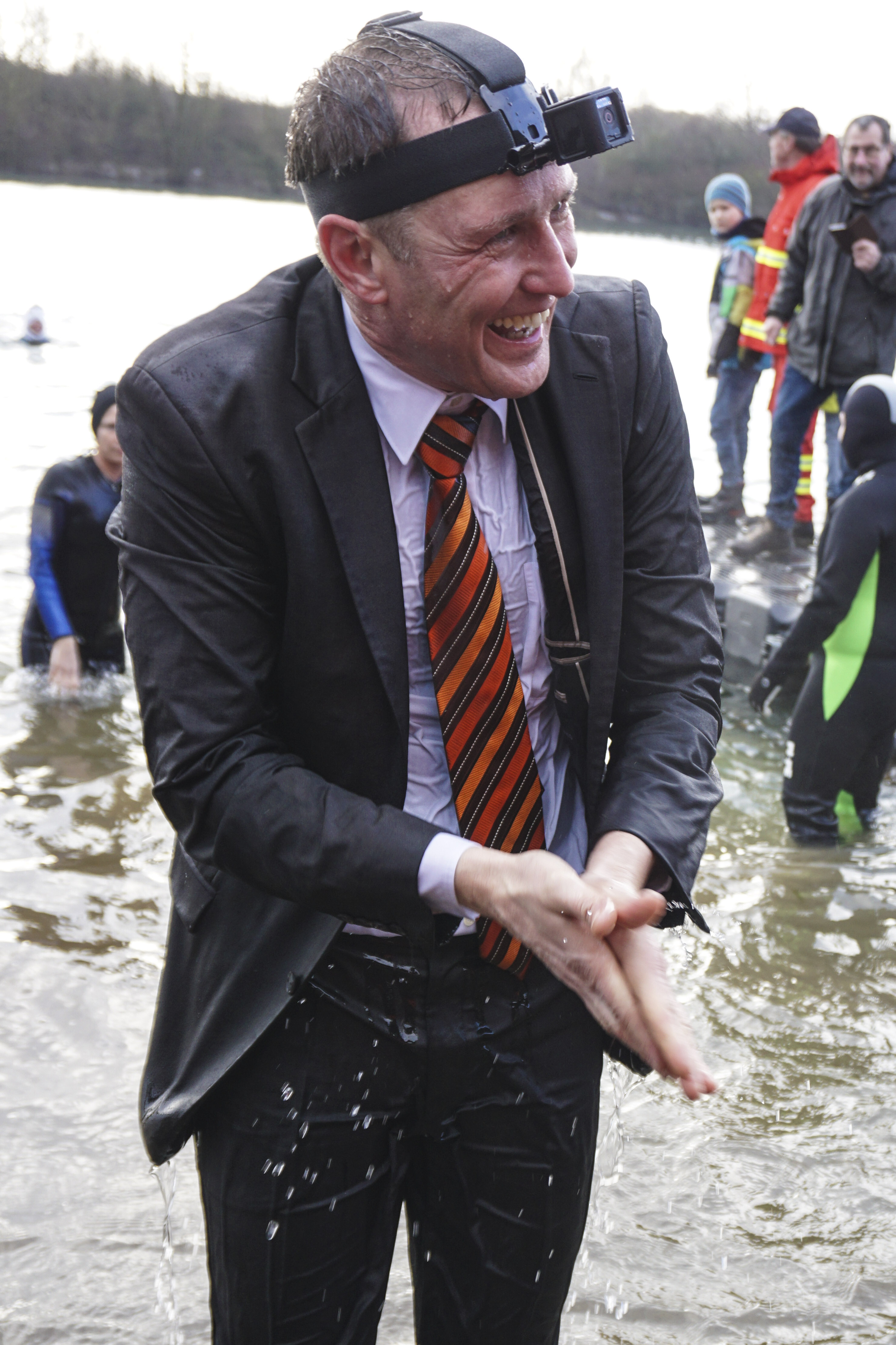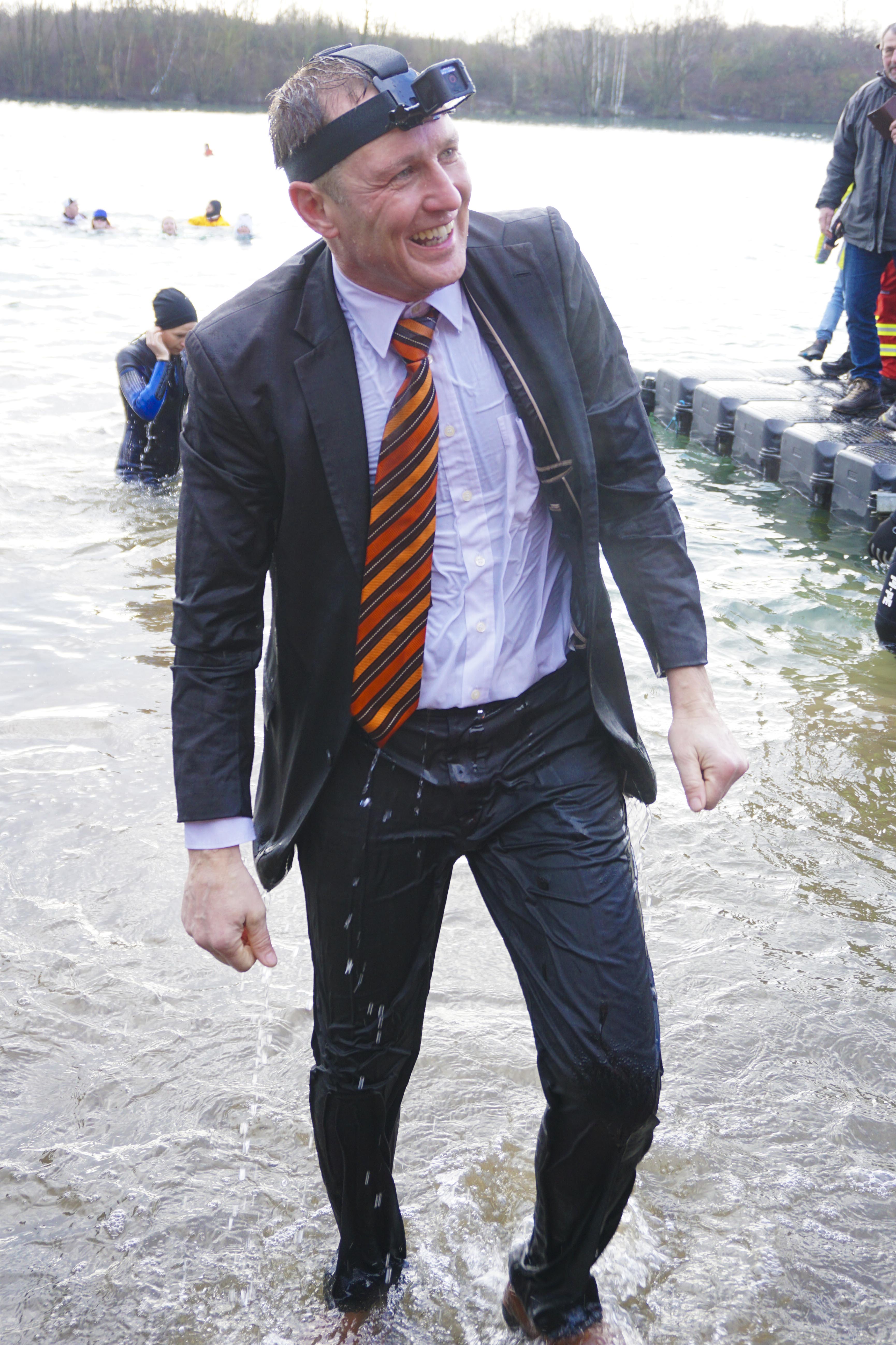 Rund 50 verrückte Wasserratten haben sich bei Eiseskälte in den Northeimer Kiessee gestürzt. Allen voran: Unser Bundestagsabgeordneter Dr. Roy Kühne, mit Anzug und Krawatte.