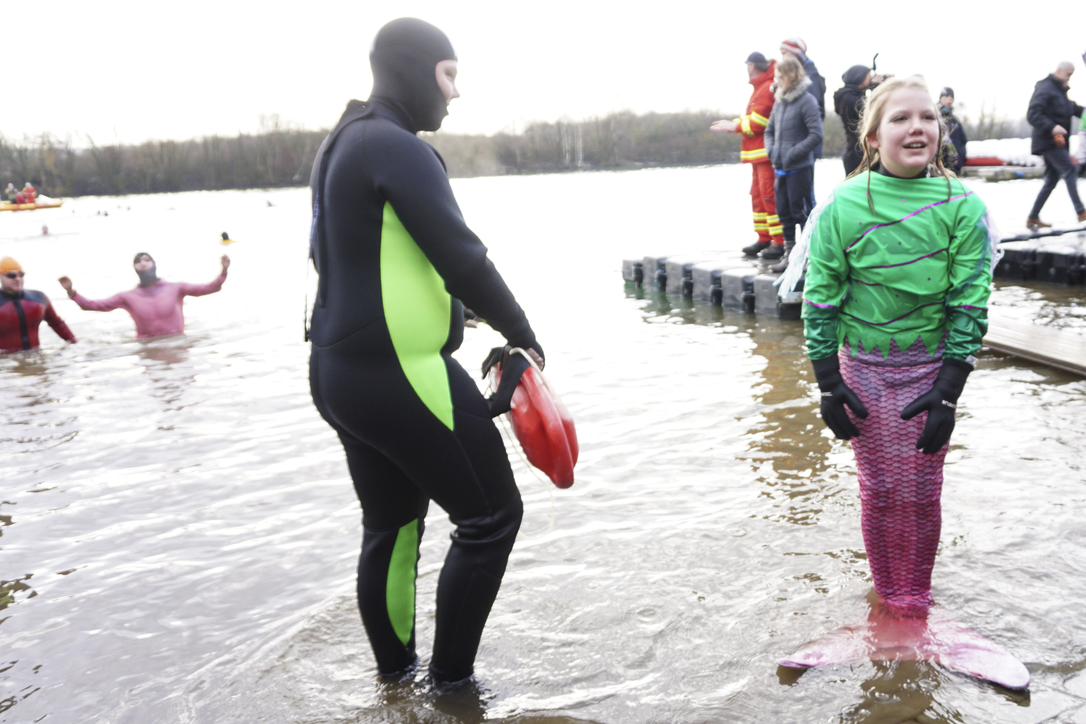 Wie angekündigt und gewünscht, kamen viele Anschwimmer in bunten Kostümen. Viele Kinder hatten sich ebenfalls Gedanken gemacht, kamen als Polizist oder Meerjungfrau. Während manche die komplette Runde meisterten, reichte anderen das kurze Abtauchen in das 4 Grad kalte Wasser.