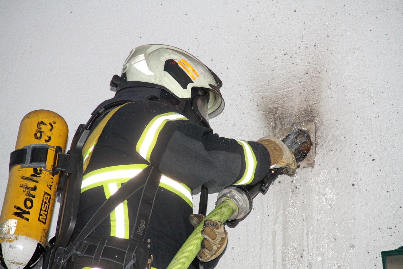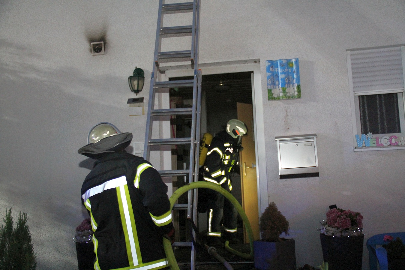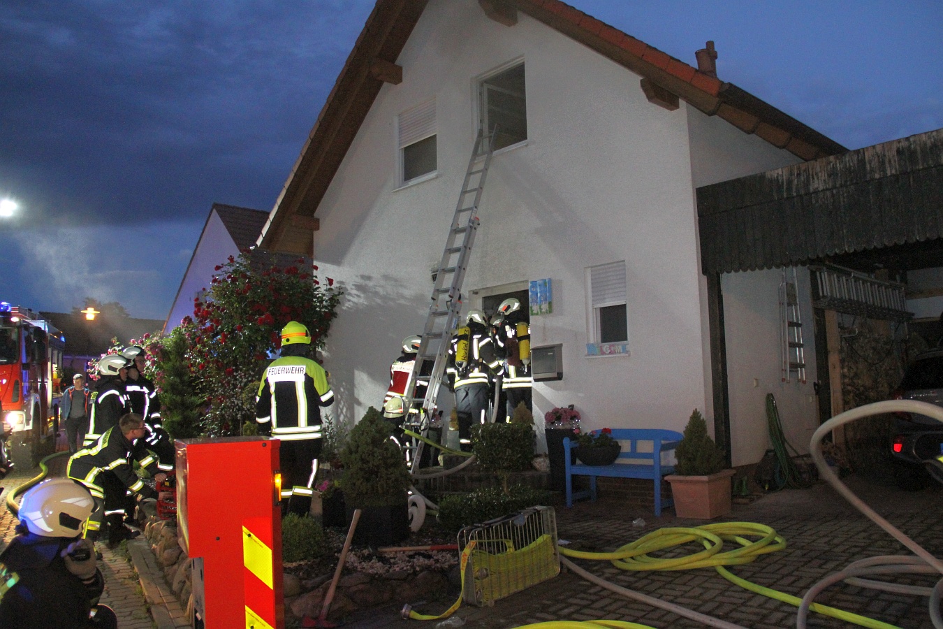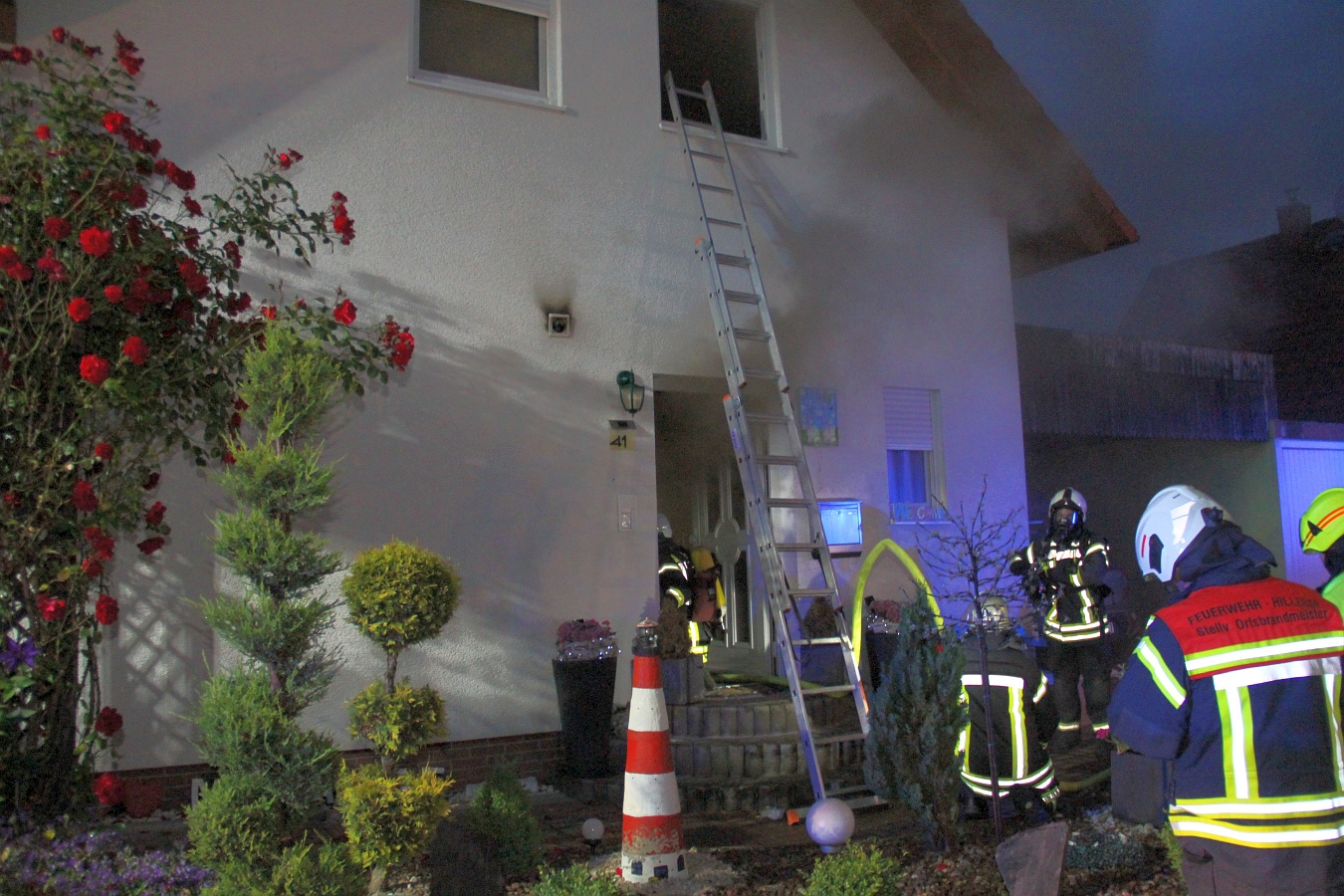 Der Schwelbrand in dem Einfamilienhaus brach nach 4 Uhr aus. Die starke Rauchentwicklung ließ den Rauchmelder anschlagen und weckte die Bewohner, eine 55-Jährige und einen 49-Jährigen. Weil das Haus schon zu stark verraucht war, war eine Flucht nicht mehr möglich. Ersthelfer stellten deshalb eine Leiter auf und retteten die beiden aus dem Obergeschoss.