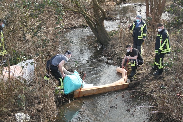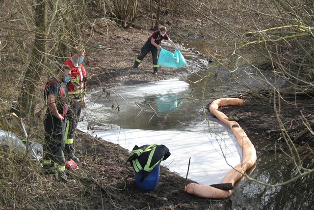 Mit Ölsperren und Bindemitteln gelang es den ehrenamtlichen Helfern, den Schaden einzudämmen und das Öl aufzunehmen. Dabei war auch Geschick gefragt, heißt es von der Kreisfeuerwehr-Presse, denn der Weg zum Ufer war durch Sträucher versperrt. Aus dem Kanal selbst gelang kein Öf in die Rhume selbst.