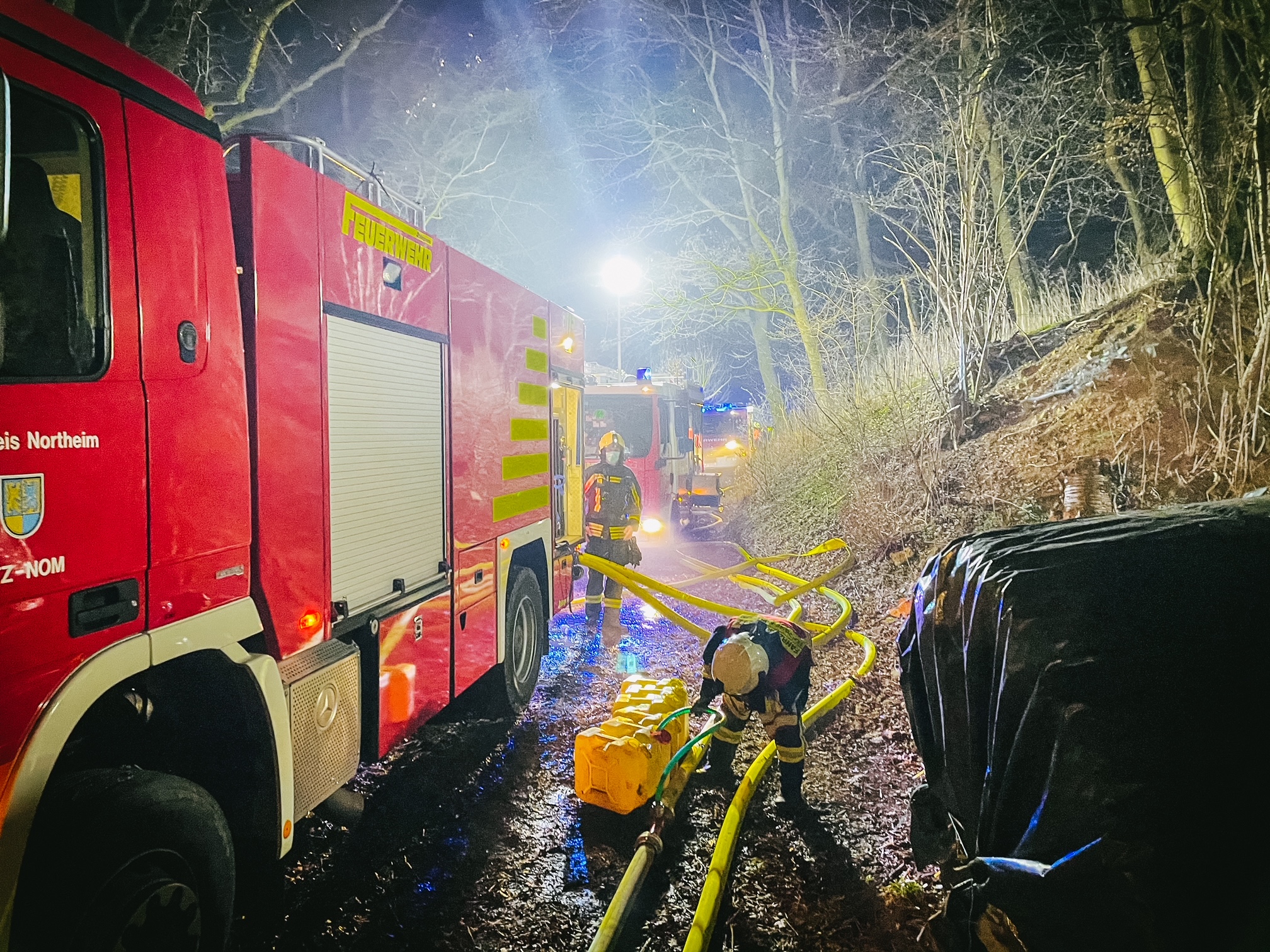 Mit zwei Kilometern Schlauchleitung wurden die Flammen, die an einem Steilhang bis in die Baumwipfel loderten, eingedämmt. Aufgrund der Lage weit außerhalb der Ortschaft Westerhof, war der Wassertransport eine Herausforderung. Bis in die Nacht liefen die Löscharbeiten. Mittels Drohne wurden die Brandstelle und umliegende Bereiche aus der Luft begutachtet.