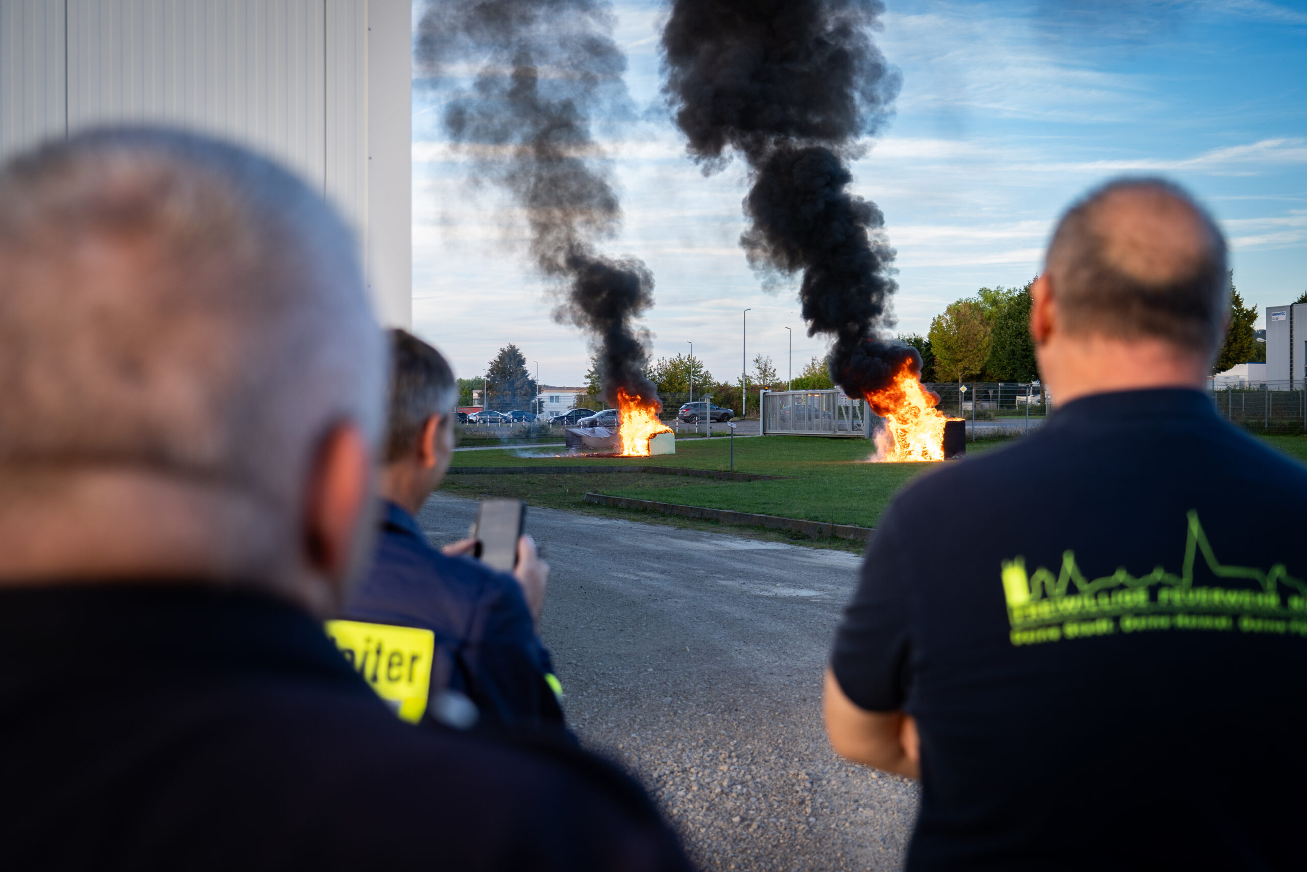 Denn Ortsbrandmeister Rouven Goldberg und Stadtbrandmeister Bernard Krzepina hatten gemeinsam mit Firmenverantwortlichen tatsächlich ein Feuer entzündet, meterhoch stieg dabei der dunkle Rauch. LaPur stellt Schaumstoffmatratzen her.