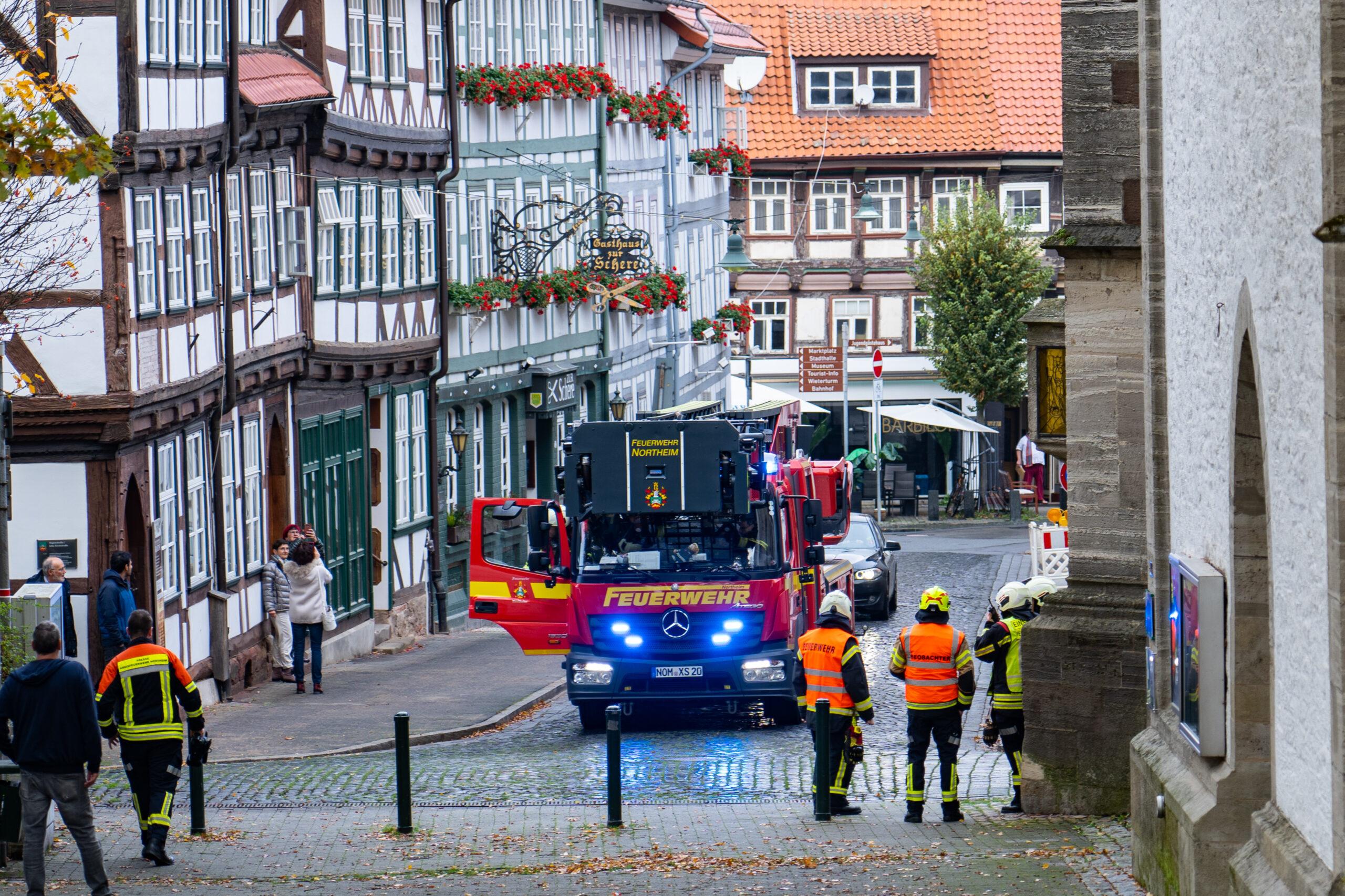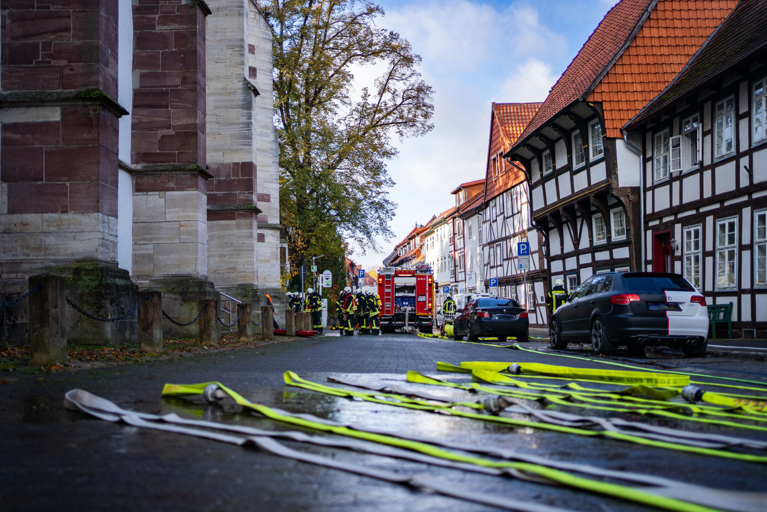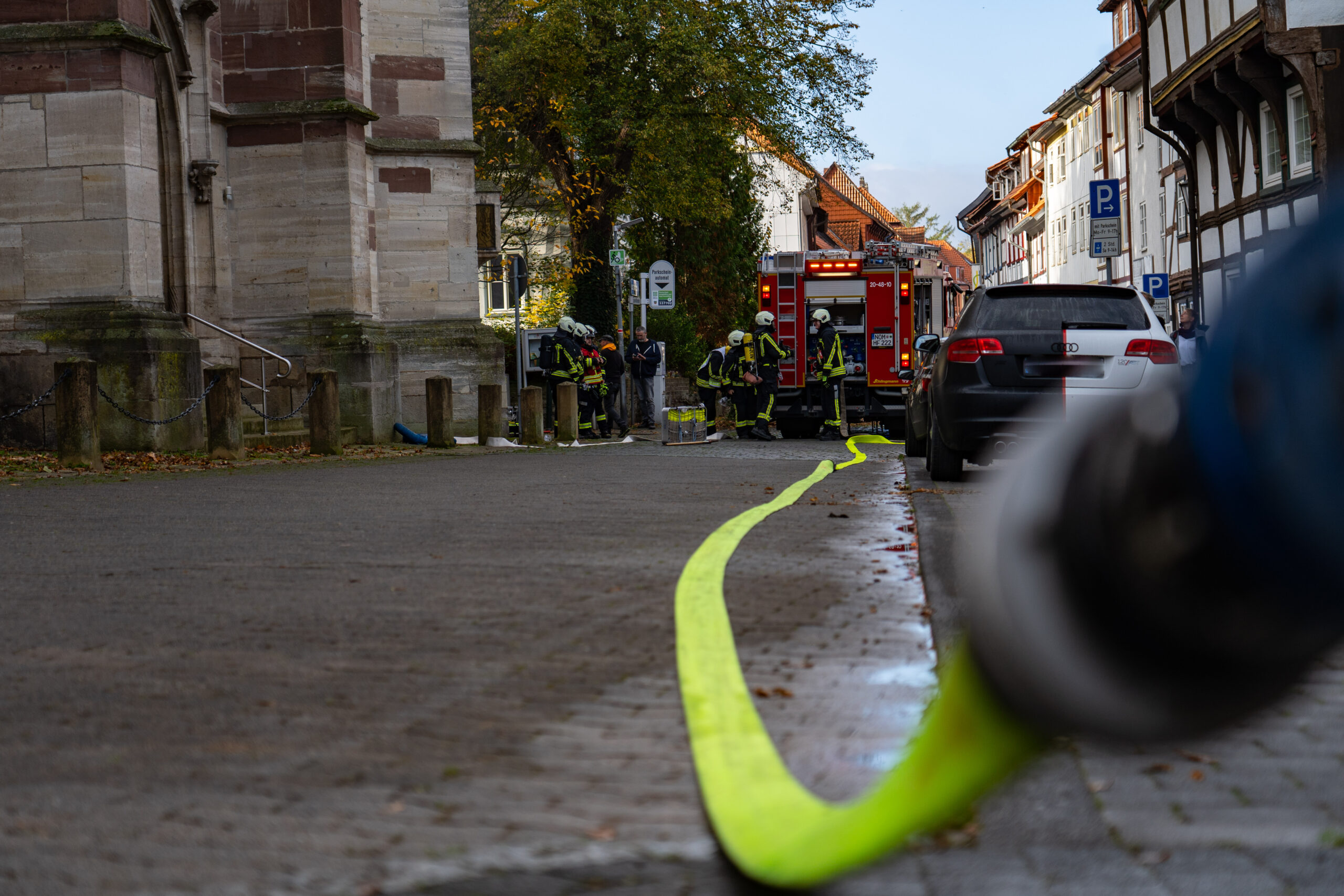 Sirenenalarm am Samstagmorgen in Northeim. Mit einer Großübung trainierten die Rettungskräfte aus dem Stadtgebiet in der Innenstadt an der historischen St. Sixti Kirche den Ernstfall. Mehr als 100 freiwillige Helfer waren im Einsatz.
