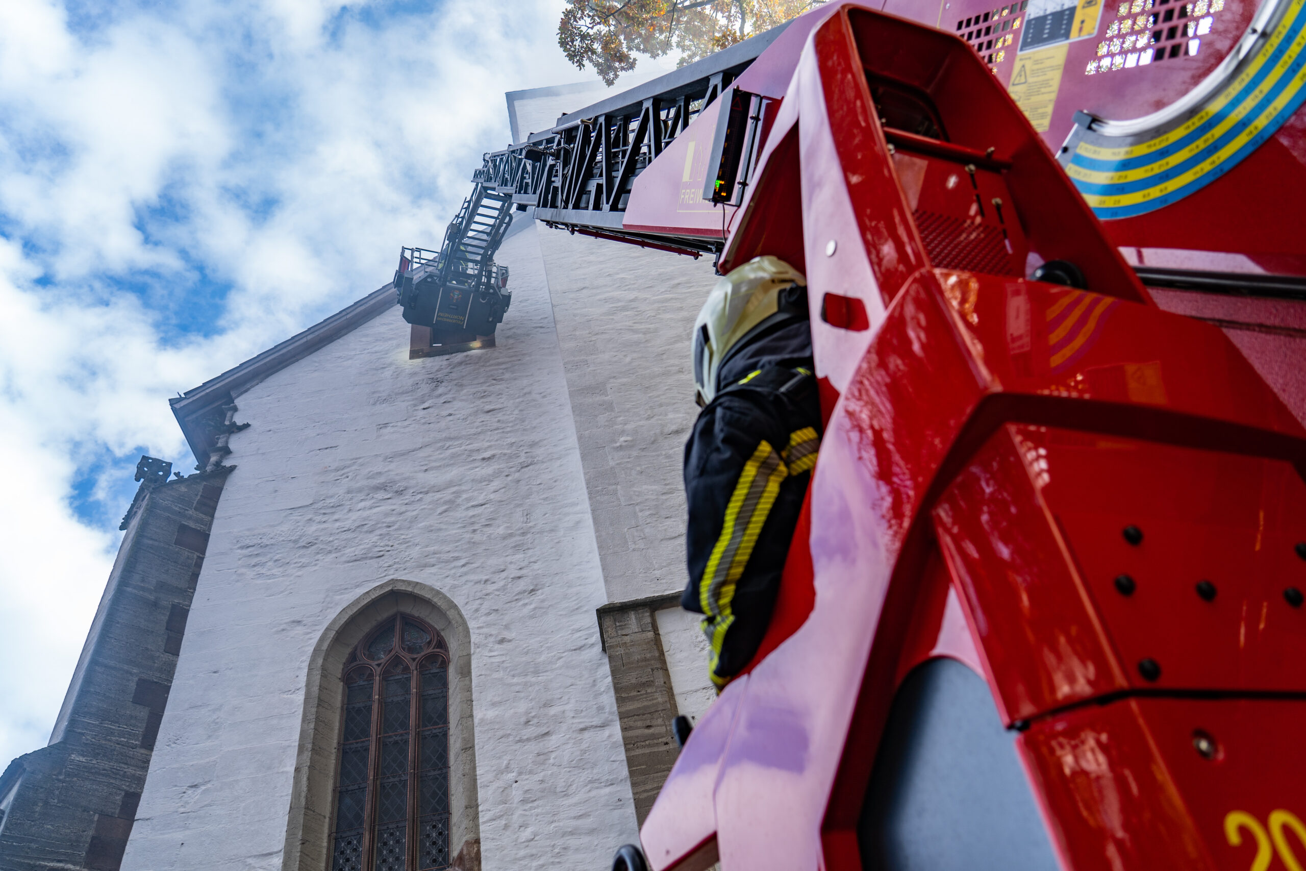 Fast 100 Kräfte der Feuerwehren aus Northeim, Langenholtensen, Denkershausen, Hammenstedt, Lagershausen, Imbshausen, Sudheim und Bühle waren am Ende an der Großübung beteiligt, sagt Goldberg. Ihre Aufgabe war es – so wurde es in der Übung angenommen, vier Personen aus dem Dach und dem Turm der Kirche zu retten. Dabei handelte es sich um Schauspieler und zwei Puppen. Laut Übungsplan waren die vier mit Reparaturarbeiten beschäftigt, als im Dach der Kirche ein Feuer ausbrach. Nun galt es also, sowohl die Menschen zu retten als auch das Feuer zu löschen.
