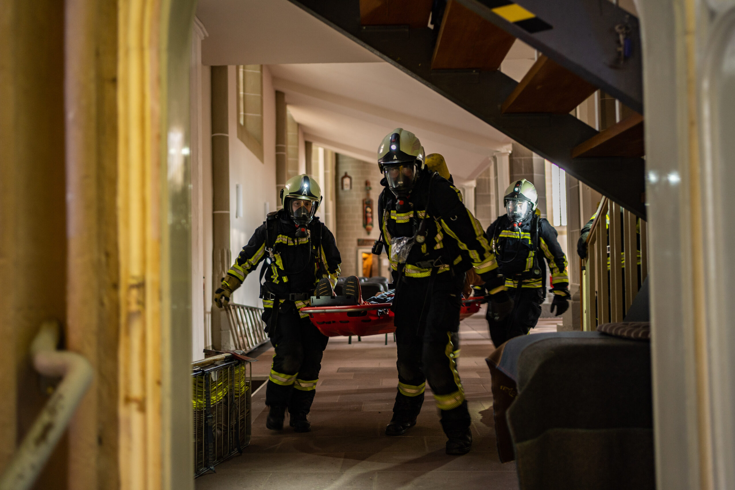 Laut Gemeindevorsitzenden Christian Steigertahl ist es die erste Übung mit Sixti in dieser Art seit 2006. Seit dem habe sich, insbesondere nach den Renovierungen, vieles verändert. „Gerne“, so Steigertahl, „haben wir die Feuerwehr dabei unterstützt.“ Denn wichtig sei es, dass sich die Retter in der engen und verwinkelten Kirche zurechtfinden und im Notfall wissen, wohin sie gehen müssen – und wohin nicht. Vor allem der Weg zum Glockenturm oder die enge Büßertreppe hinauf sind auch ohne Schutzkleidung und Druckluftflasche auf dem Rücken eine physikalische Herausforderung. Das bekam auch einer der Retter zu spüren, der im Übungsverlauf zusammengebrochen war. Retter vom Roten Kreuz, die zum Eigenschutz genau für diesen Zweck mit eingesetzt waren, kümmerten sich genauso liebevoll um ihn wie Christian Steigertahl, der kurzum etwas zu Essen herzauberte.