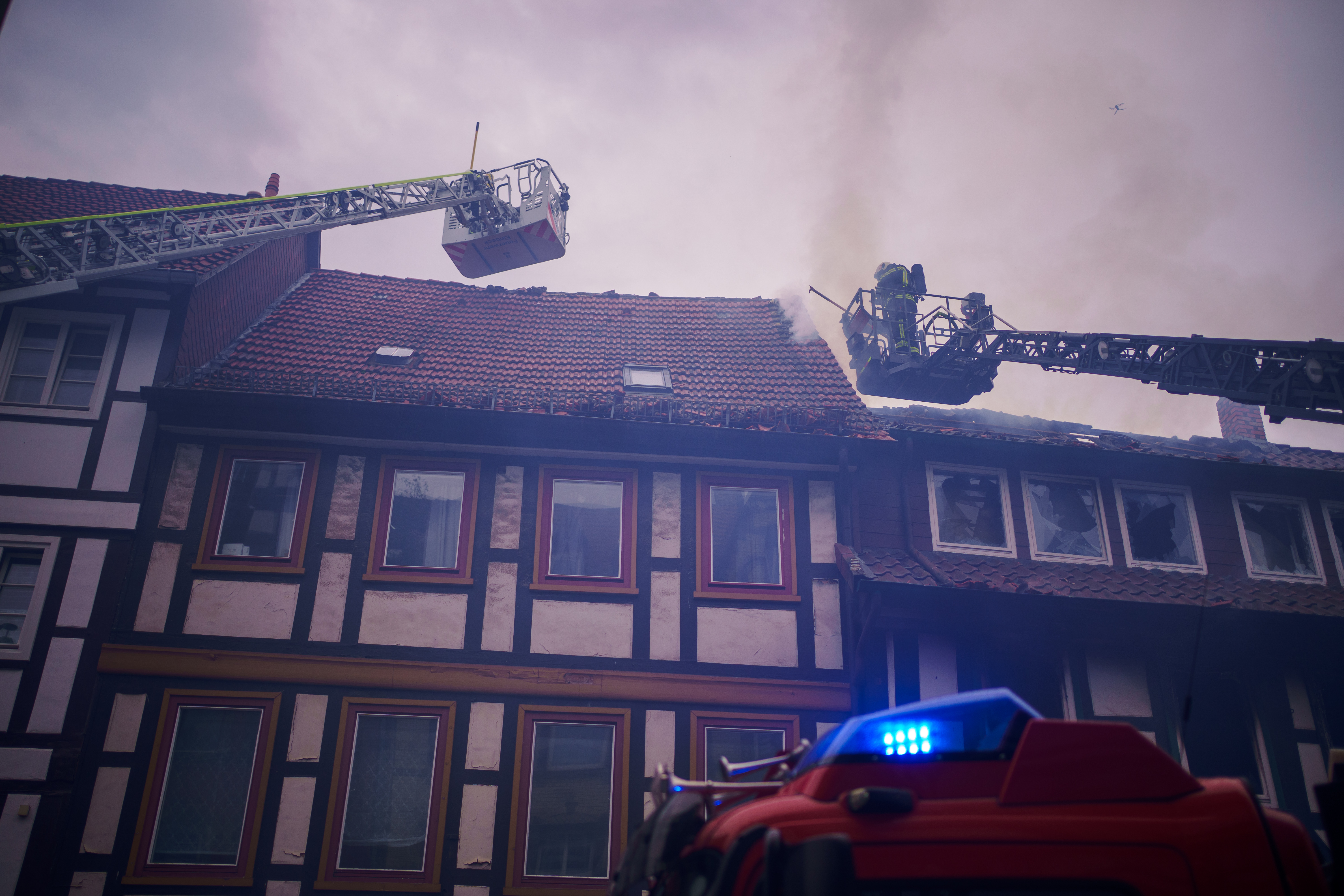 Gegen Nachmittag schlugen die ersten Flammen aus dem Obergeschoss eines Mehrfamilienhauses in der Straße Am Münster. Die enge Bebauung in dem historischen Innenstadtbereich erschwerte nicht nur den Zugang für die Einsatzkräfte. Das Feuer drohte auch auf benachbarte Gebäude überzugreifen. Trotz der massiven Rauchentwicklung und der teils schwer zugänglichen Brandstellen gelang es den Feuerwehrleuten, ein Übergreifen der Flammen weitgehend zu verhindern. Dennoch wurde mindestens ein angrenzendes Gebäude durch das Feuer und den Rauch ebenfalls in Mitleidenschaft gezogen. Problem: Das Feuer breitete sich über das Dach weiter aus.