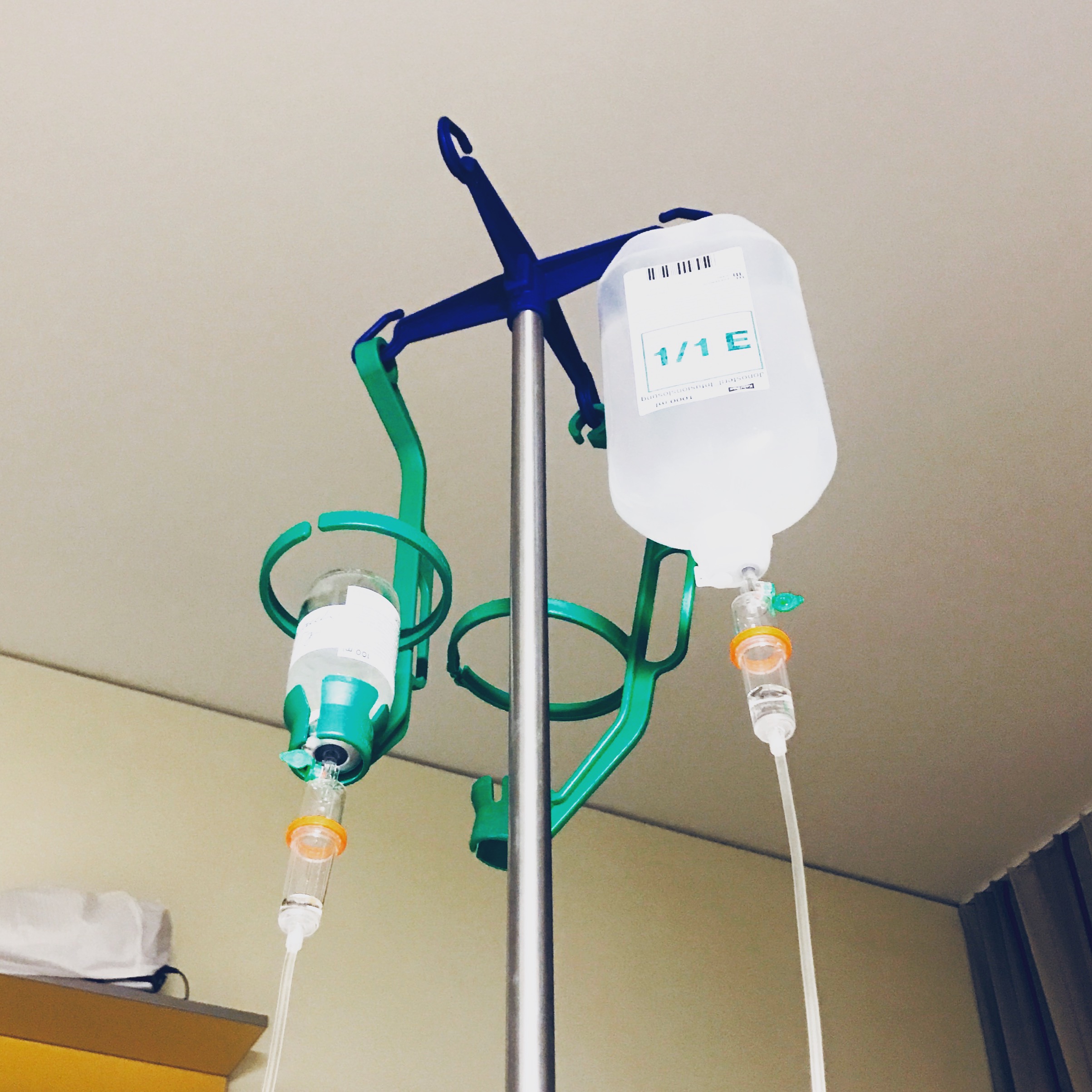 Ich liege also allein in einem Hotelzimmer mit Minibar, großem Bad, Flachbild-Fernseher und Infusions-Stange.