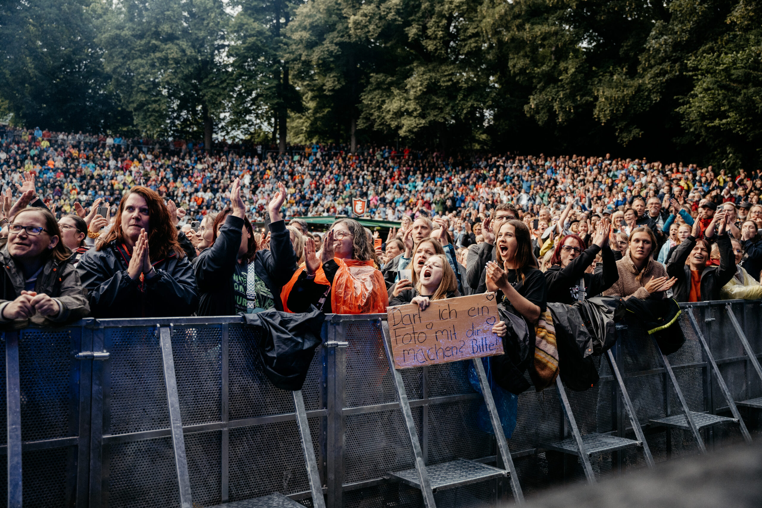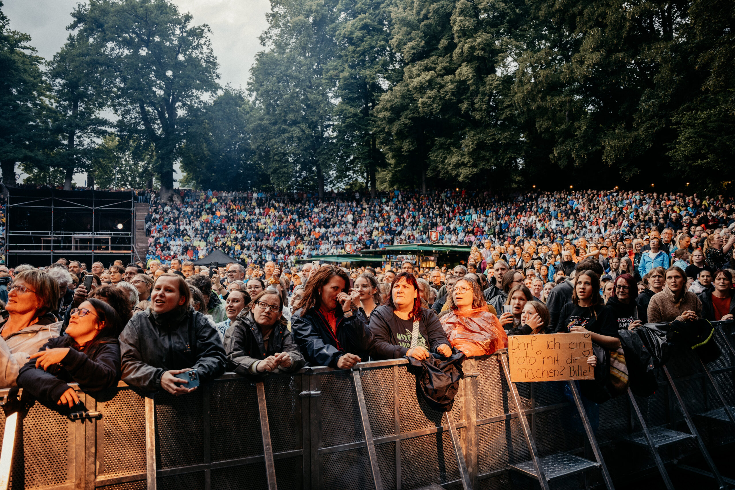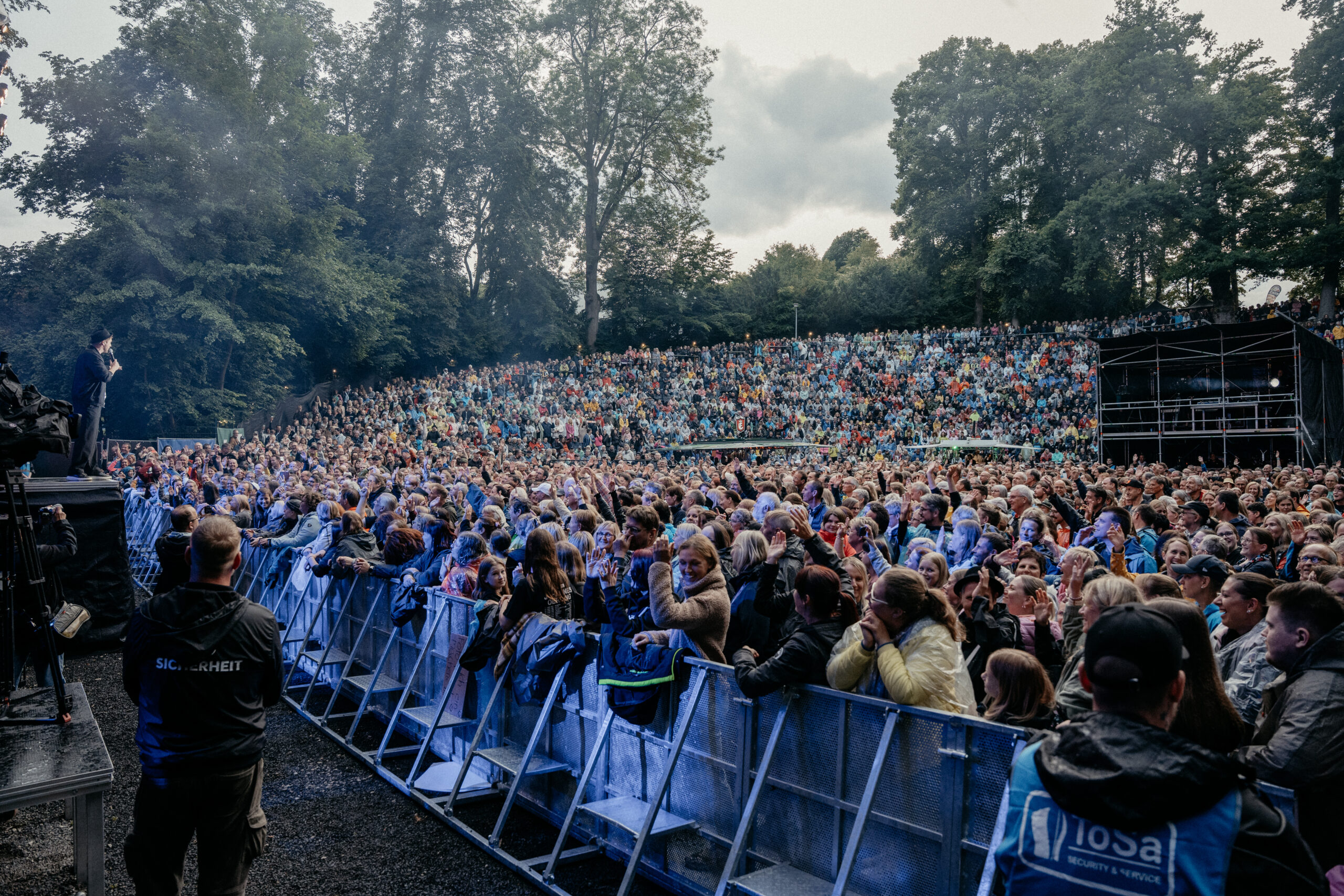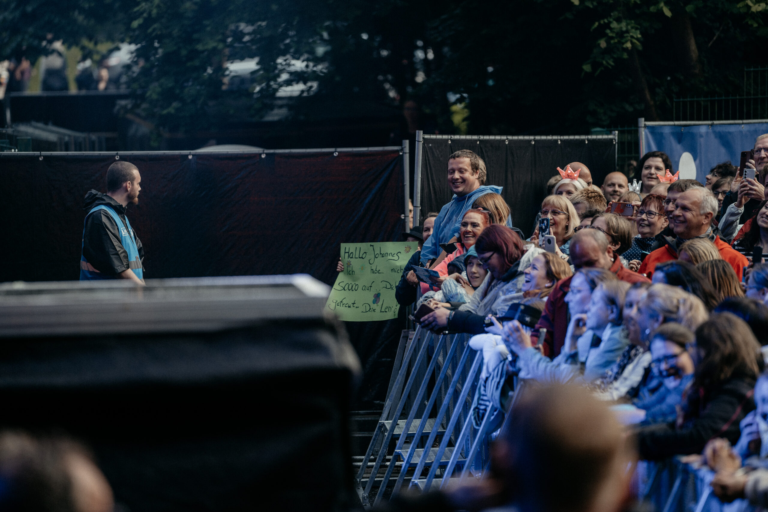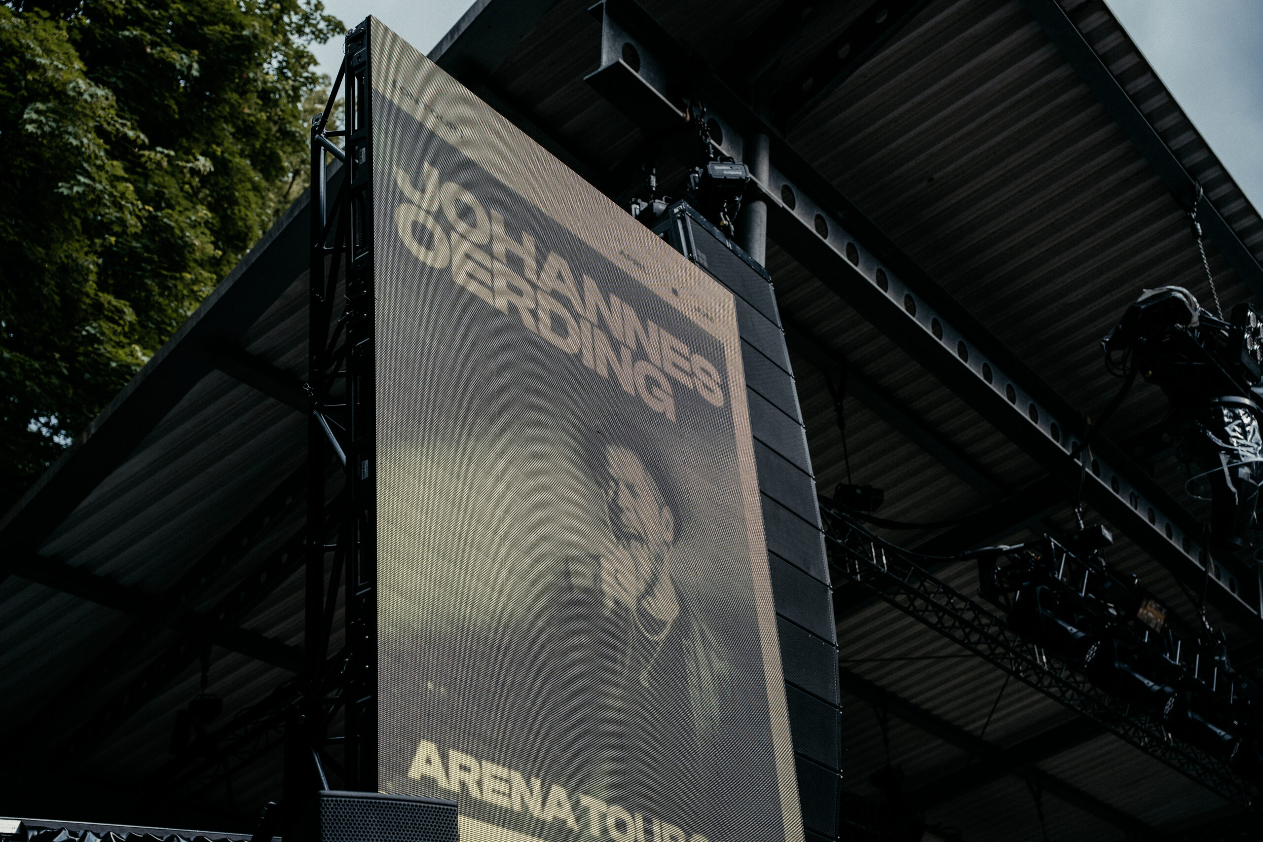 Nach einjähriger Bühnenpause füllte der gebürtige Westfale, im Rheinland aufgewachsene und heute in Hamburg lebende Johannes Oerding erneut das große Rund der Waldbühne. Bereits um 18 Uhr waren die Ränge gefüllt – wer jetzt noch kam, musste sich ein Plätzchen im Innenraum oder an den Seiten suchen, um den Sänger und seine vierköpfige Band überhaupt sehen zu können. Denn der Veranstalter hatte im Innenraum ein großes Zelt für Sound- und Lichtmischer aufgebaut, das vielen Zuschauern die Sicht nahm – vielleicht reicht beim nächsten Mal ein kleineres Zelt?
