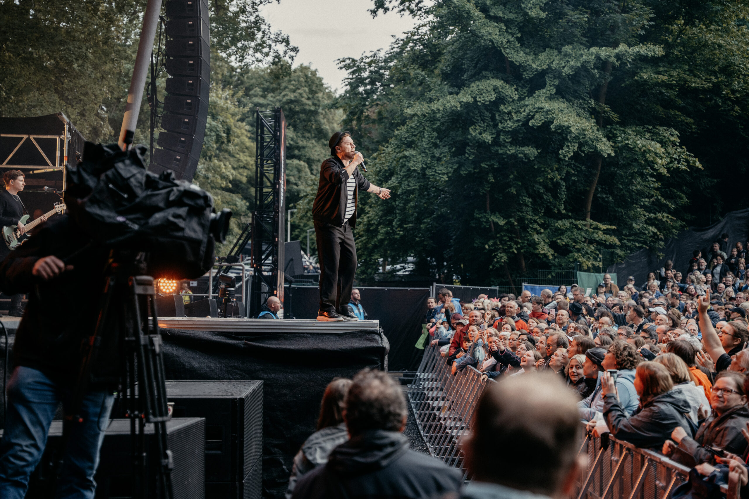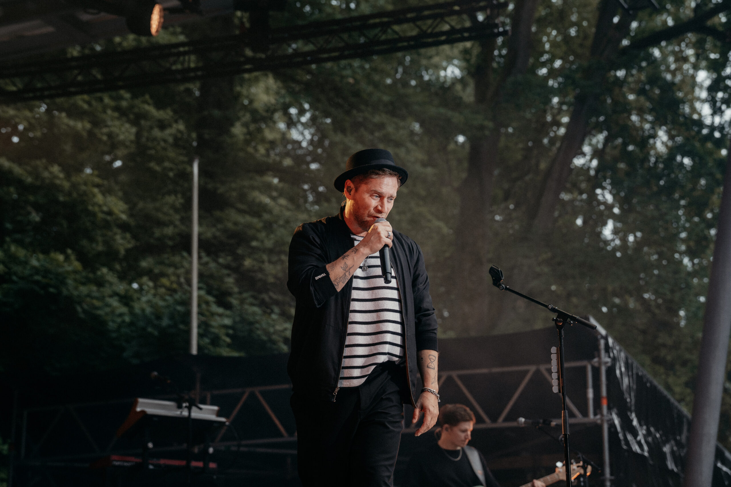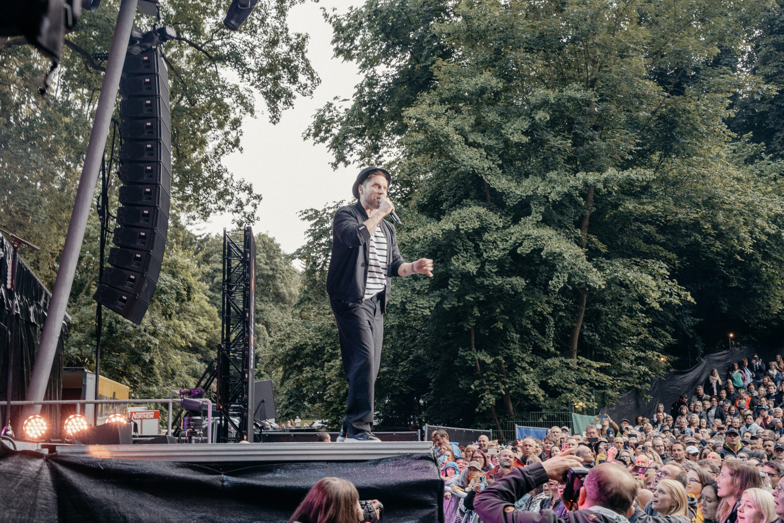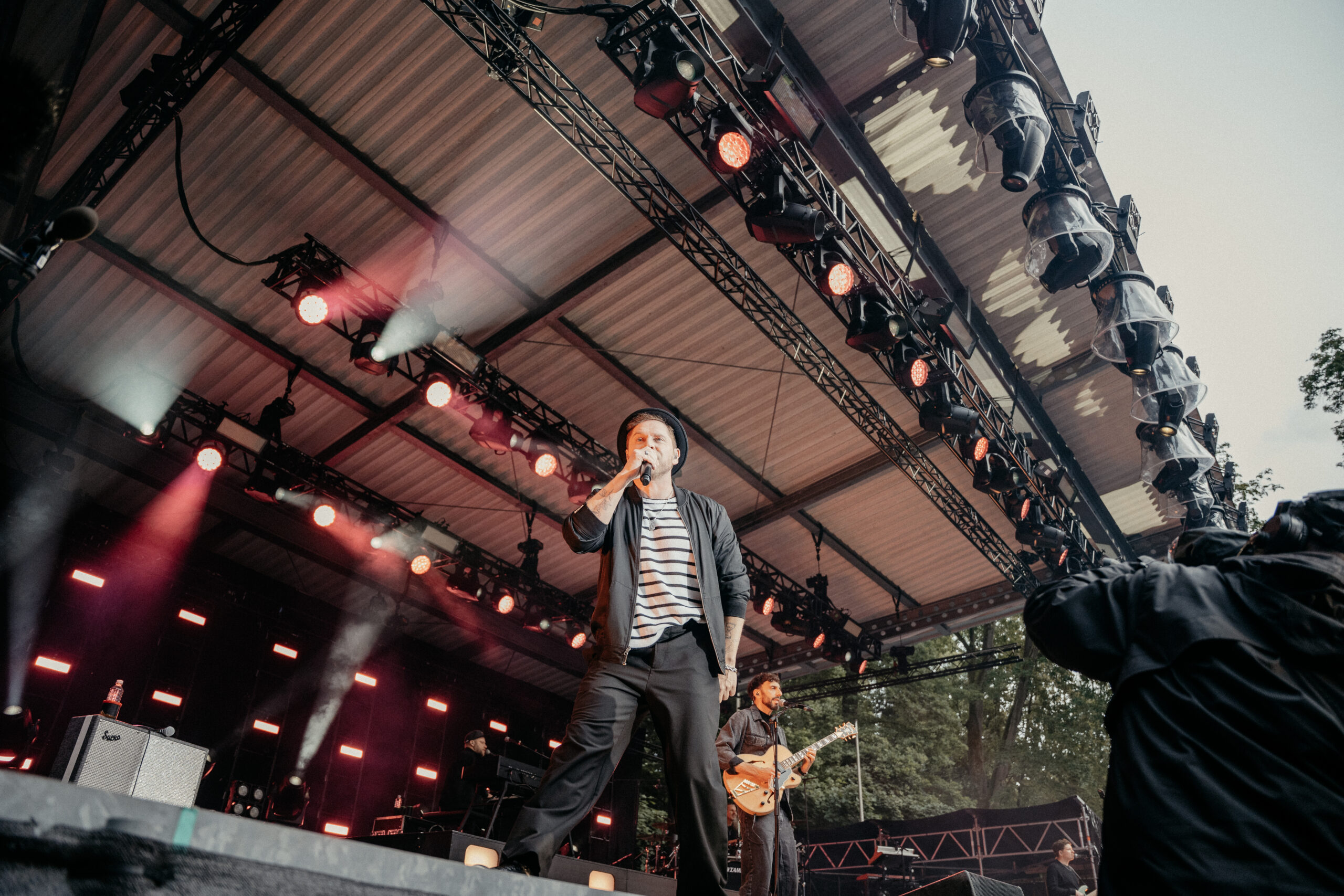 Nach einjähriger Bühnenpause füllte der gebürtige Westfale, im Rheinland aufgewachsene und heute in Hamburg lebende Johannes Oerding erneut das große Rund der Waldbühne. Bereits um 18 Uhr waren die Ränge gefüllt – wer jetzt noch kam, musste sich ein Plätzchen im Innenraum oder an den Seiten suchen, um den Sänger und seine vierköpfige Band überhaupt sehen zu können. Denn der Veranstalter hatte im Innenraum ein großes Zelt für Sound- und Lichtmischer aufgebaut, das vielen Zuschauern die Sicht nahm – vielleicht reicht beim nächsten Mal ein kleineres Zelt?