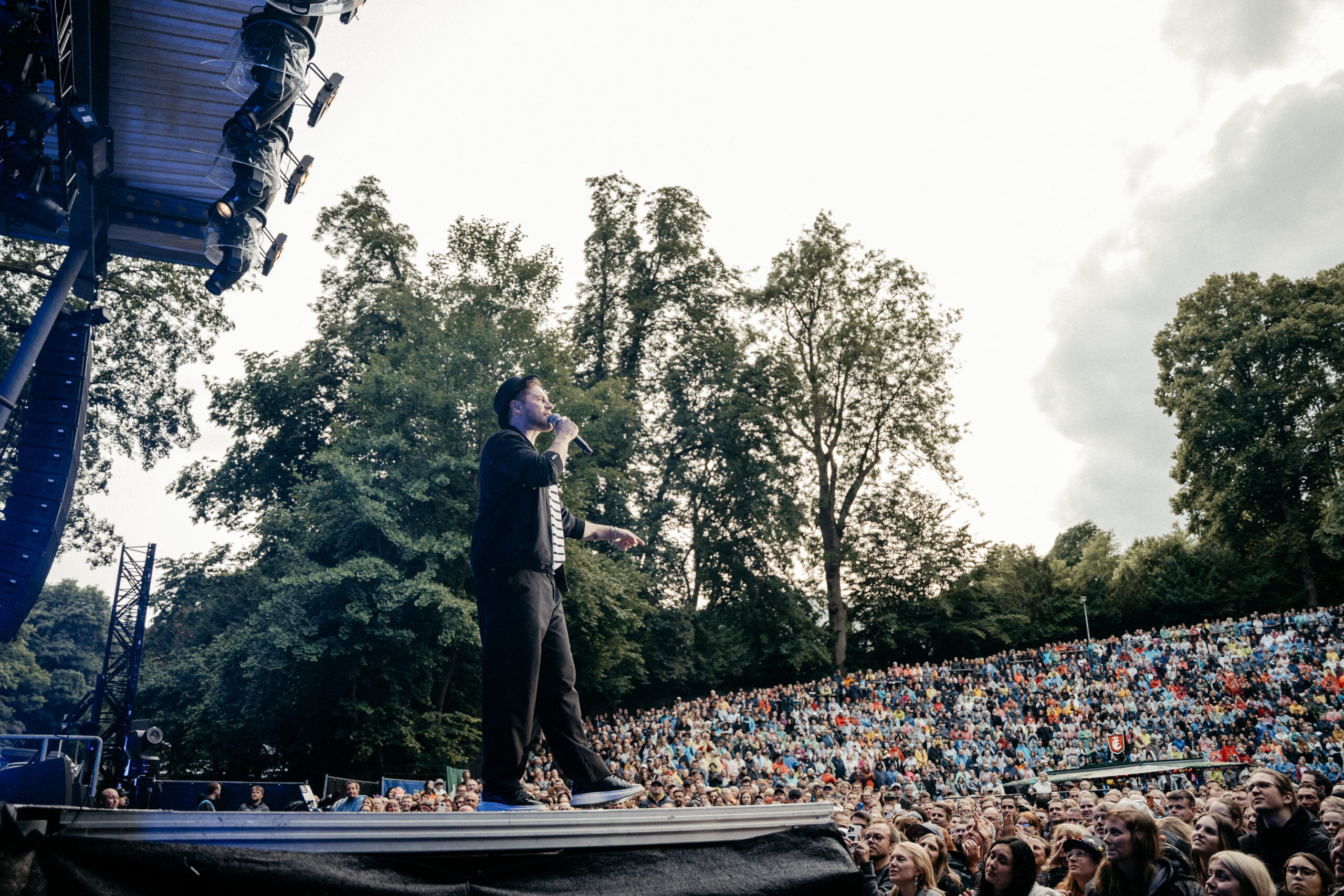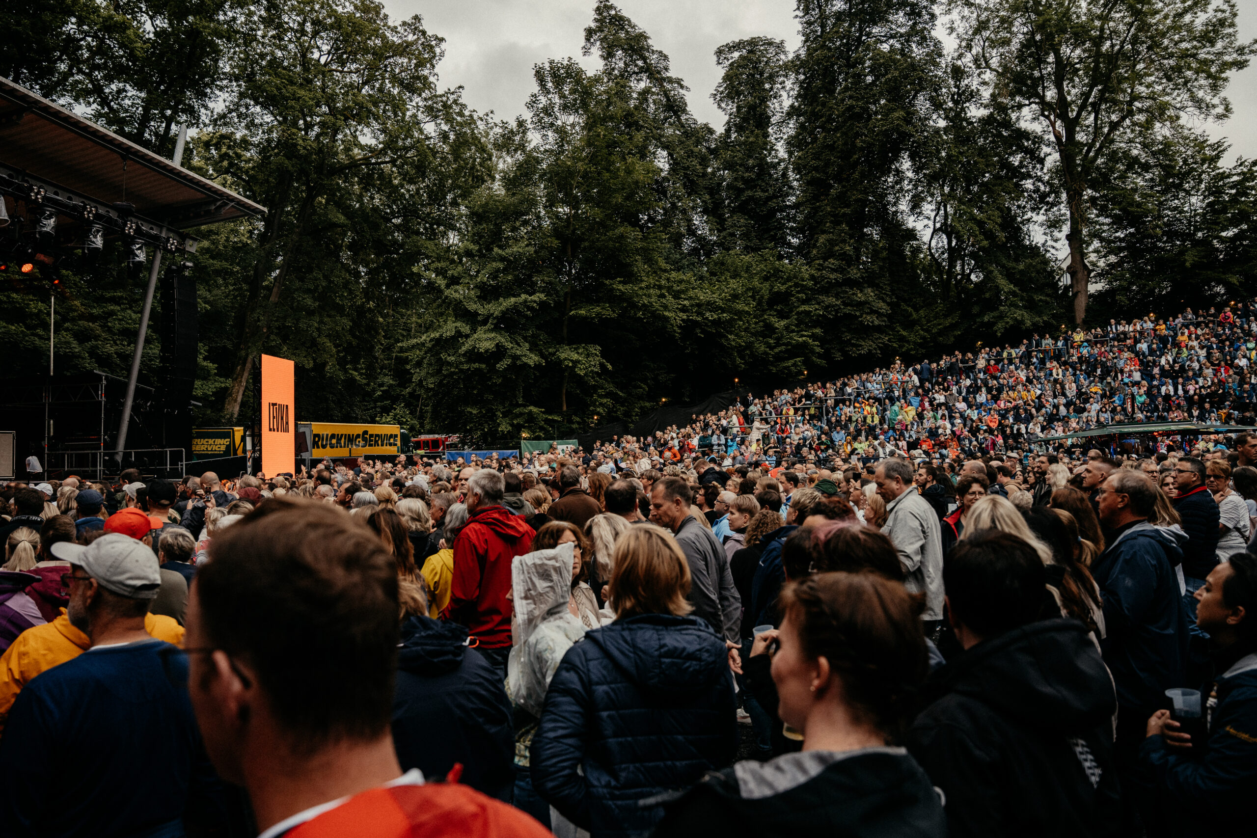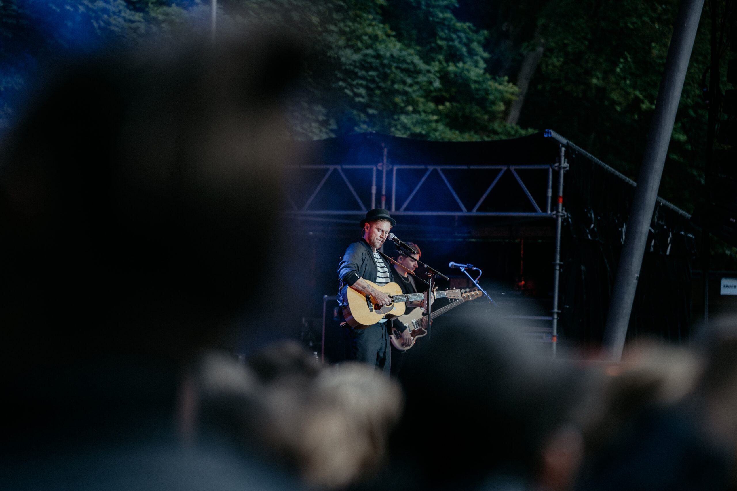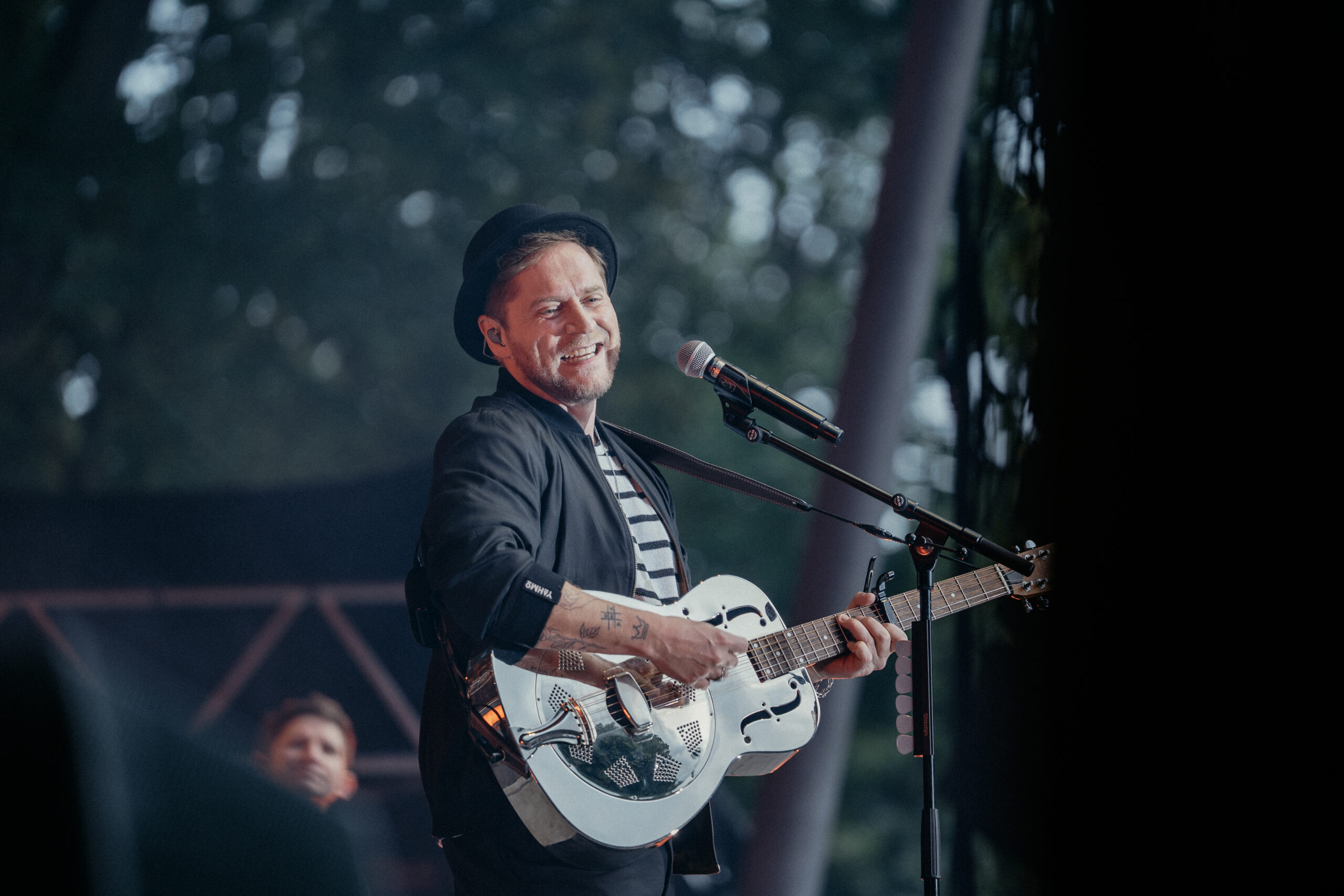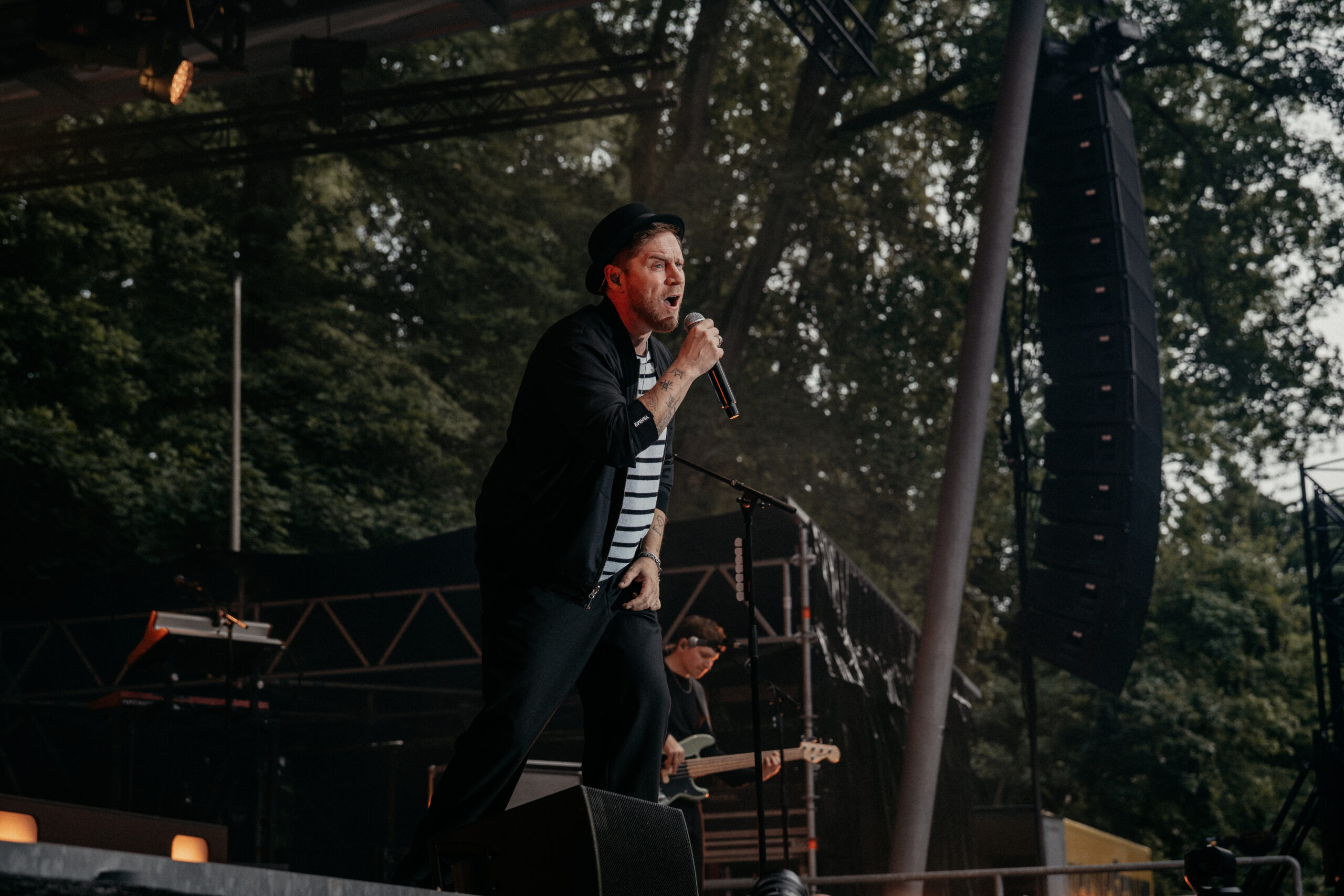 Nach einjähriger Bühnenpause füllte der gebürtige Westfale, im Rheinland aufgewachsene und heute in Hamburg lebende Johannes Oerding erneut das große Rund der Waldbühne. Bereits um 18 Uhr waren die Ränge gefüllt – wer jetzt noch kam, musste sich ein Plätzchen im Innenraum oder an den Seiten suchen, um den Sänger und seine vierköpfige Band überhaupt sehen zu können. Denn der Veranstalter hatte im Innenraum ein großes Zelt für Sound- und Lichtmischer aufgebaut, das vielen Zuschauern die Sicht nahm – vielleicht reicht beim nächsten Mal ein kleineres Zelt?