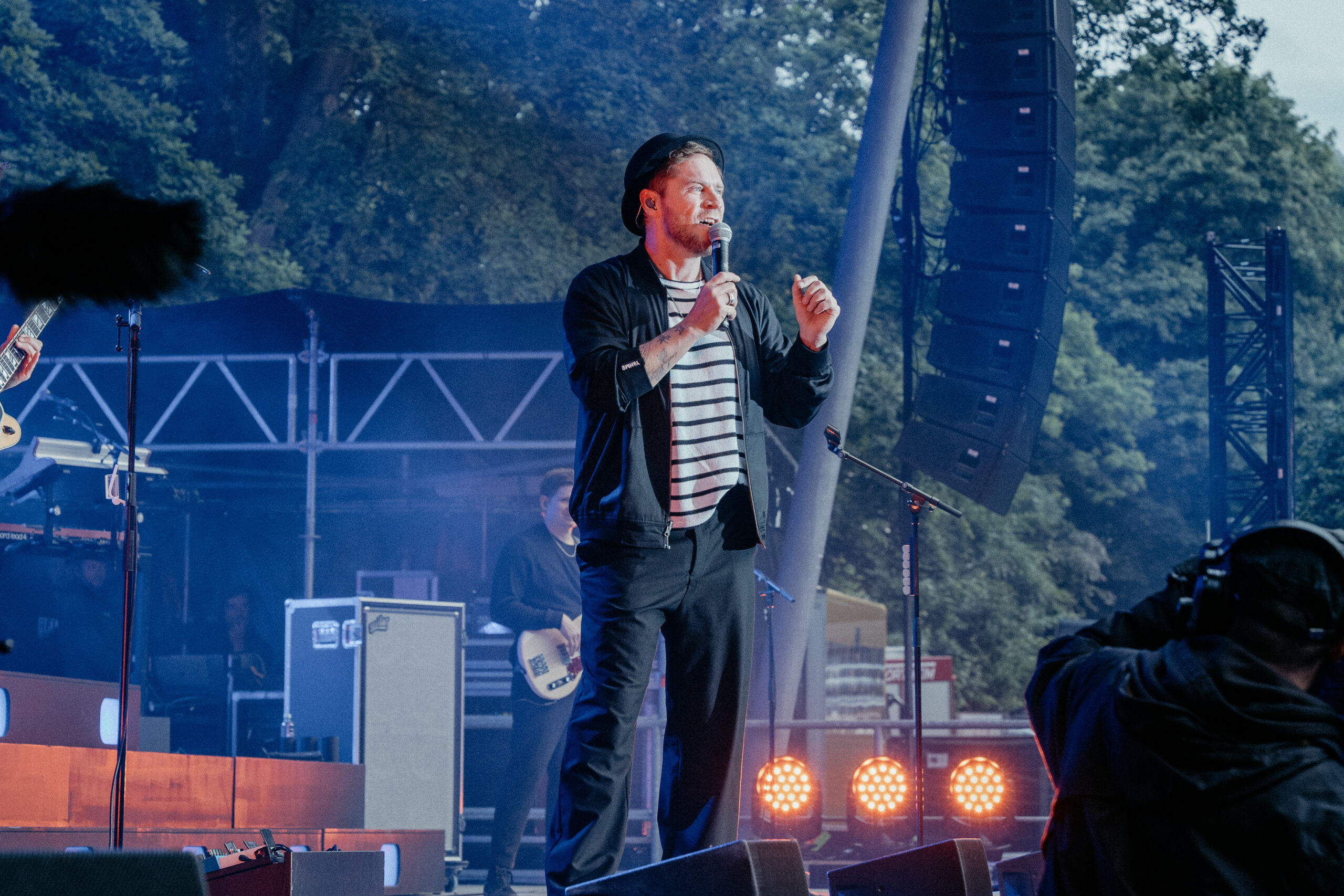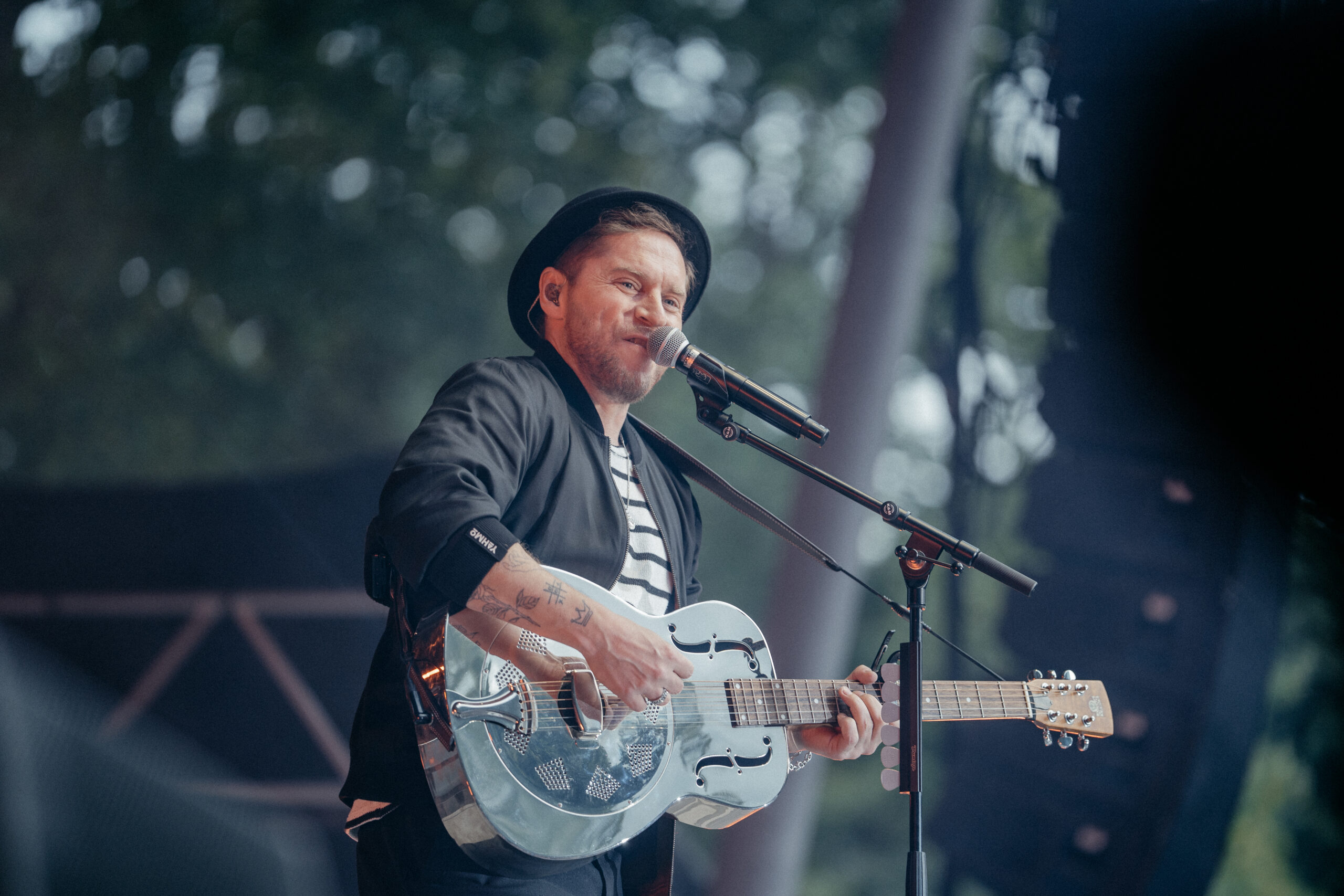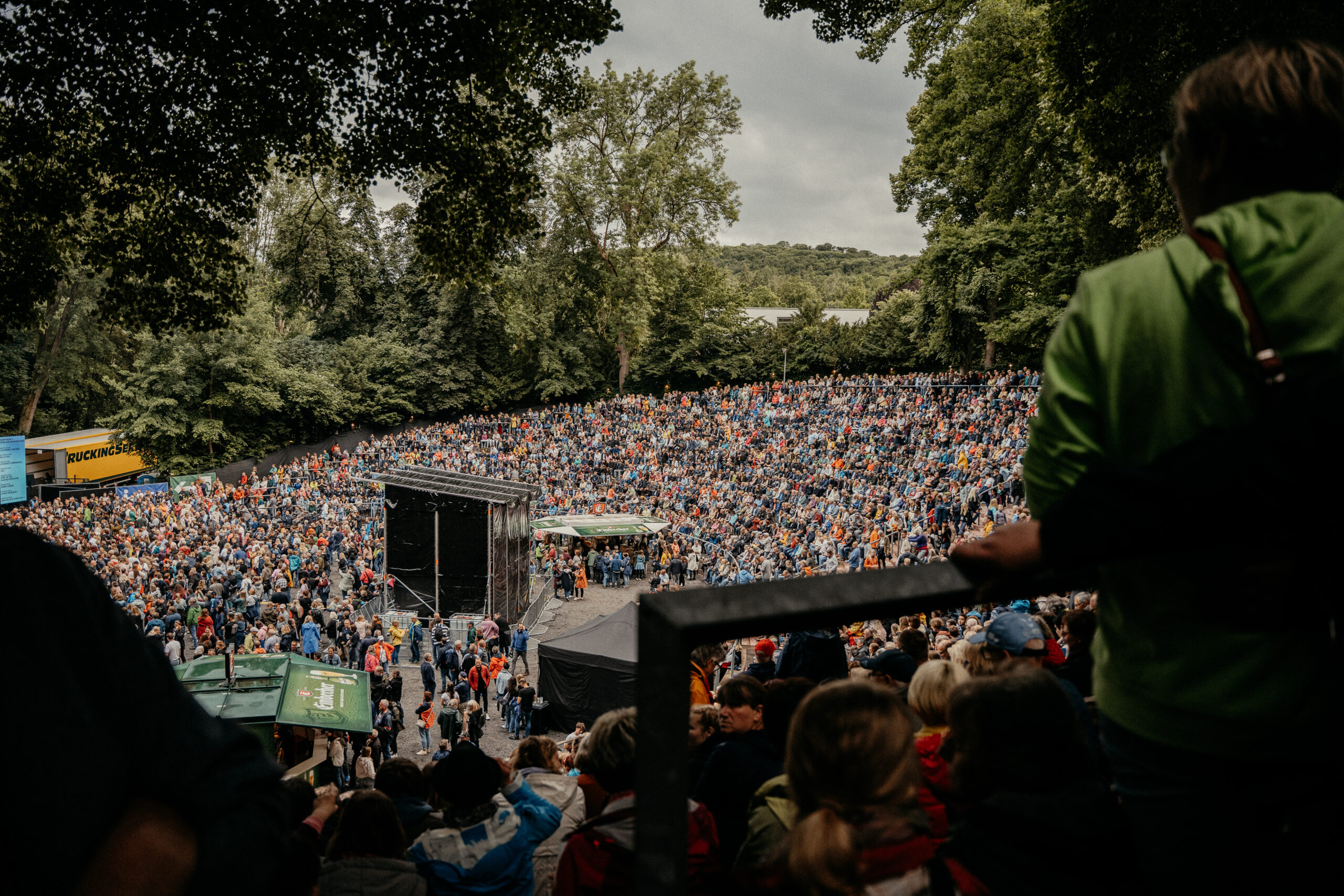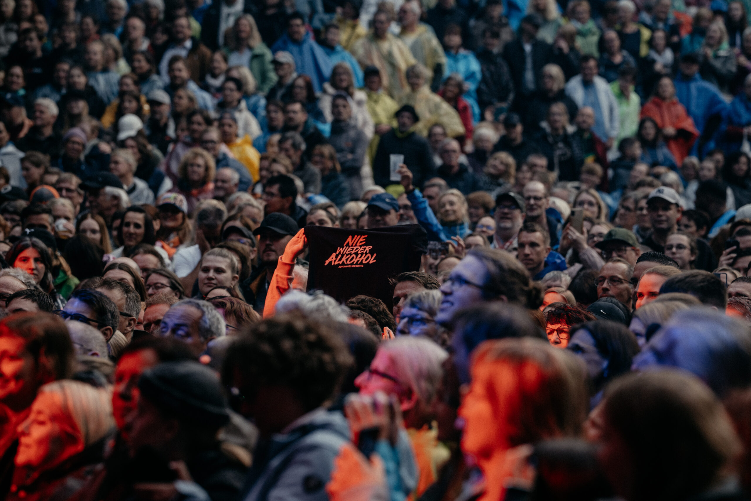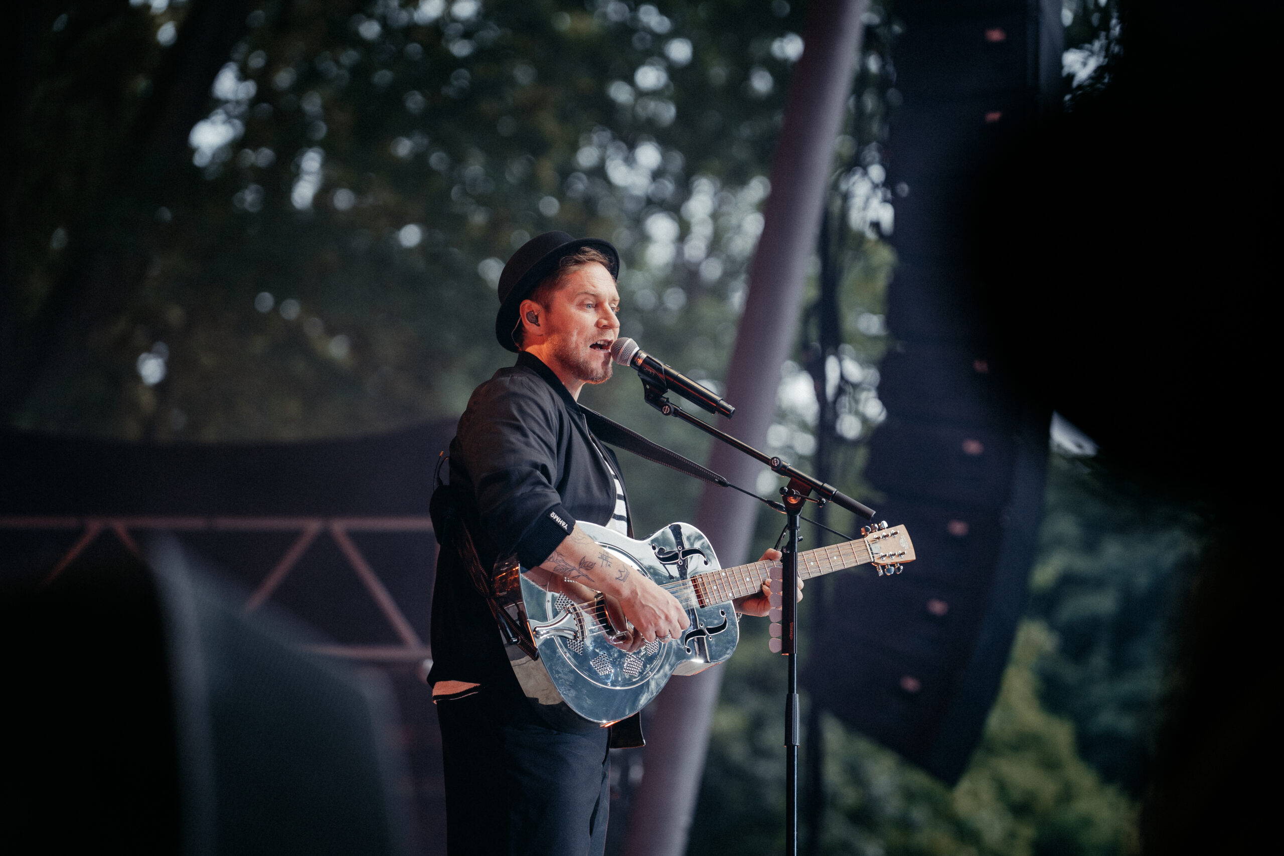 Nach einjähriger Bühnenpause füllte der gebürtige Westfale, im Rheinland aufgewachsene und heute in Hamburg lebende Johannes Oerding erneut das große Rund der Waldbühne. Bereits um 18 Uhr waren die Ränge gefüllt – wer jetzt noch kam, musste sich ein Plätzchen im Innenraum oder an den Seiten suchen, um den Sänger und seine vierköpfige Band überhaupt sehen zu können. Denn der Veranstalter hatte im Innenraum ein großes Zelt für Sound- und Lichtmischer aufgebaut, das vielen Zuschauern die Sicht nahm – vielleicht reicht beim nächsten Mal ein kleineres Zelt?