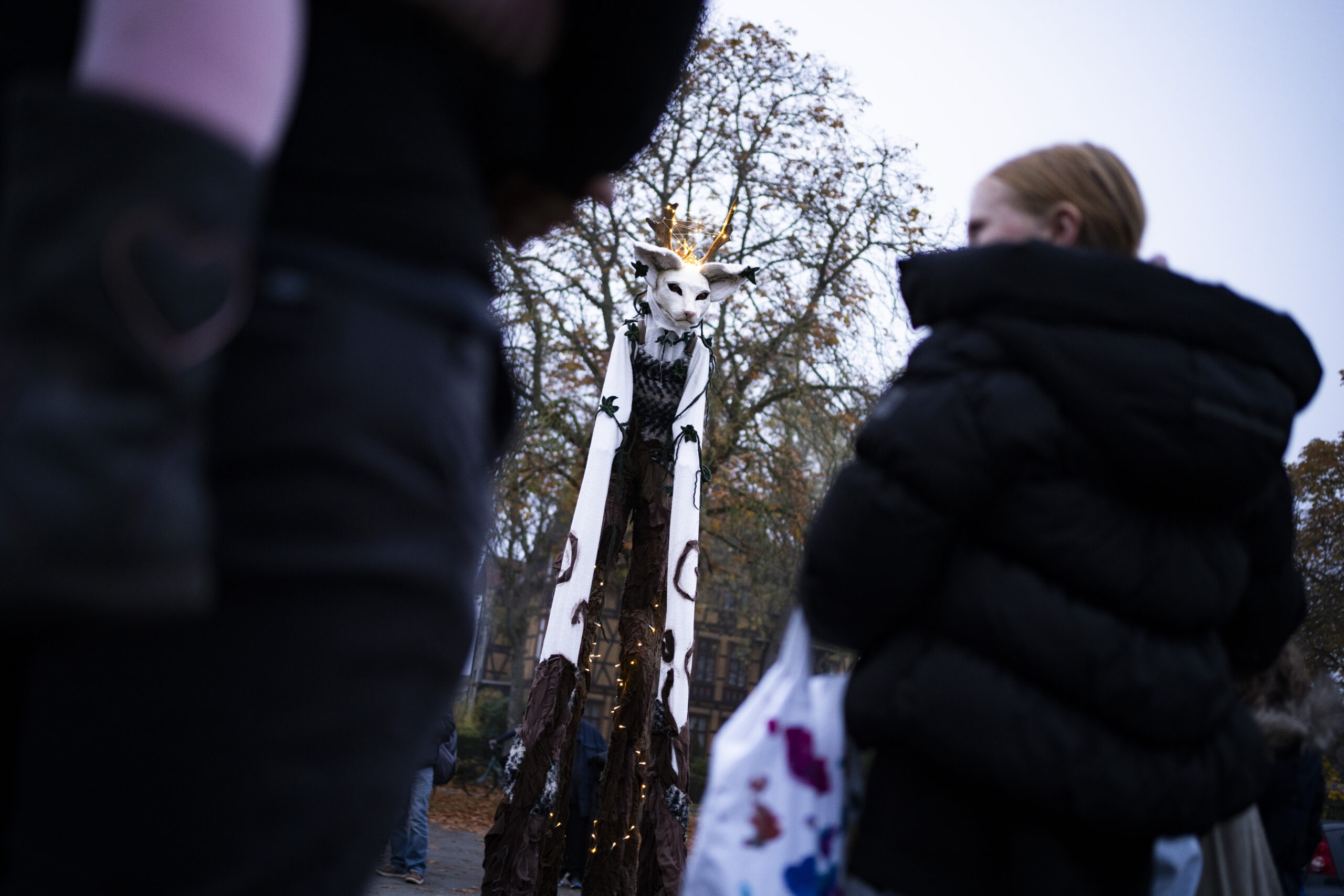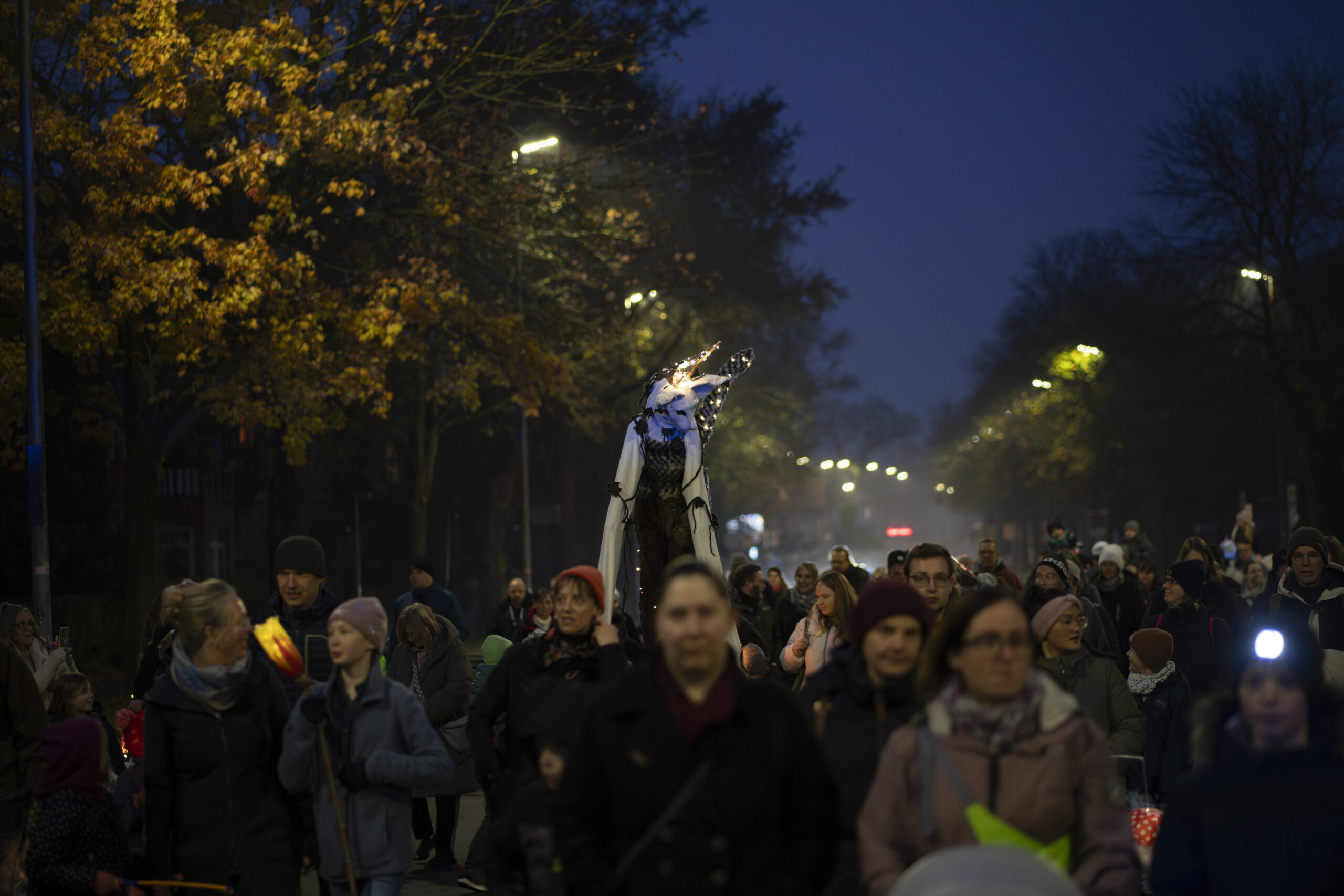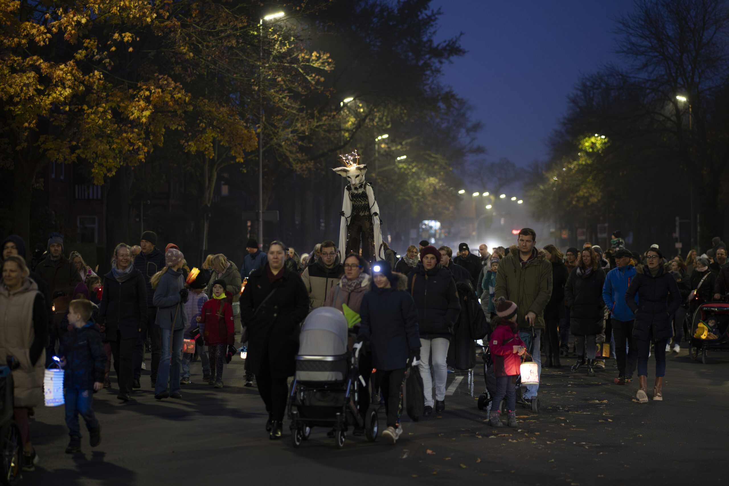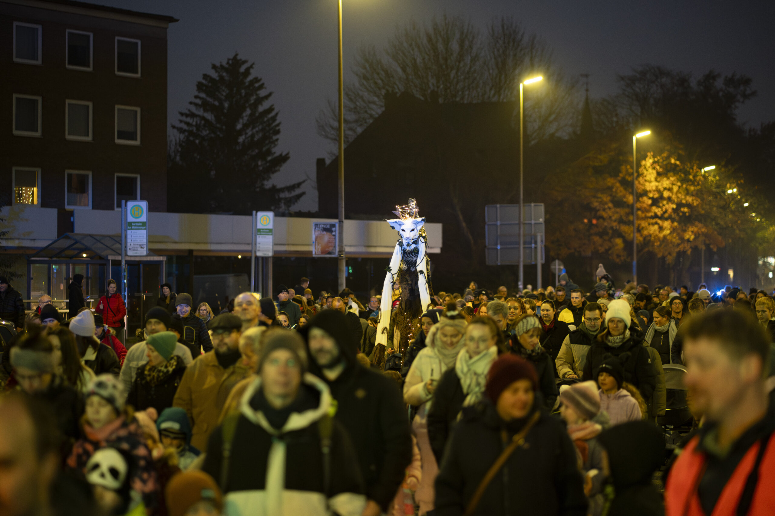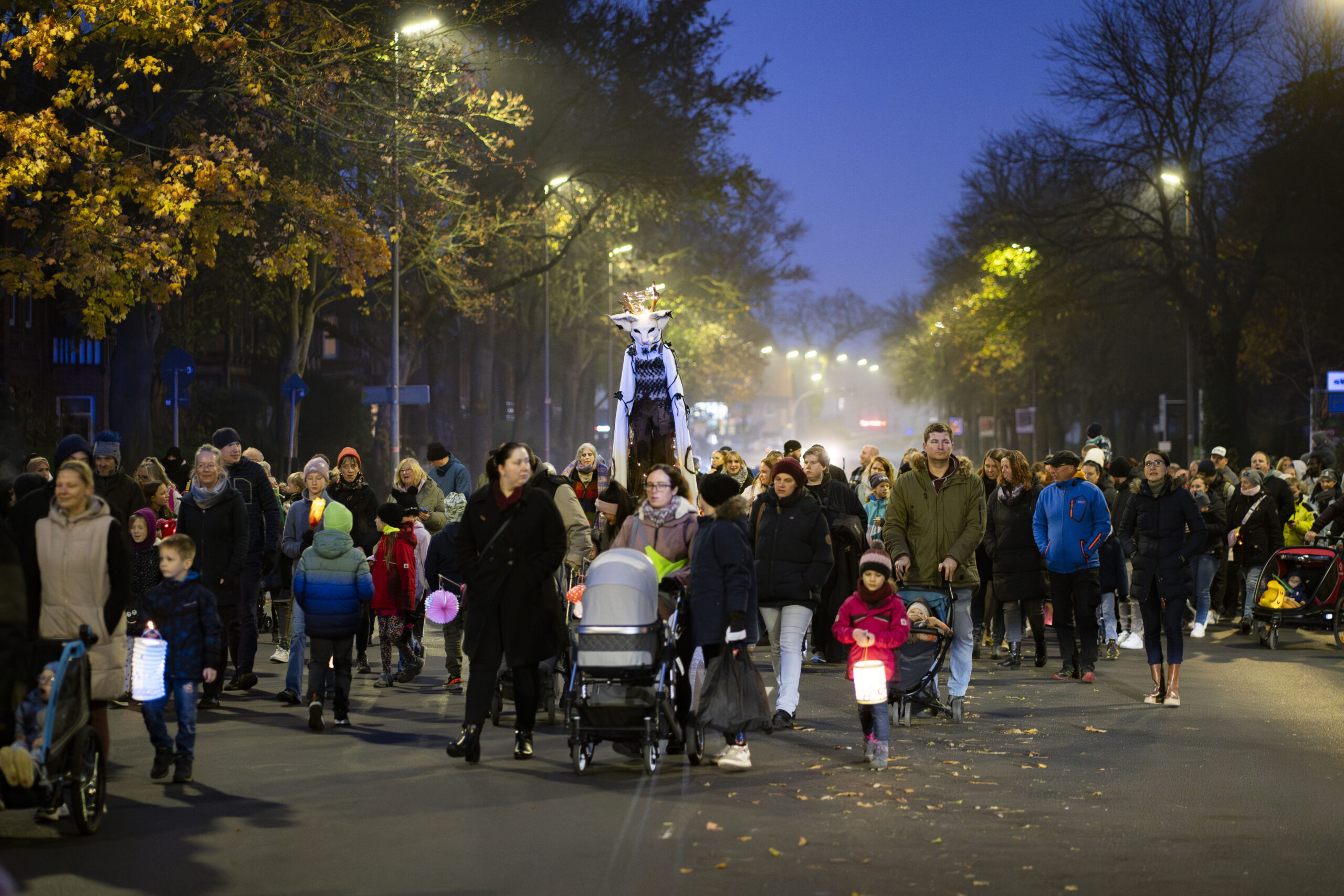 Auch in diesem Jahr war das Theater der Nacht mit dabei. Eine riesige beleuchtete Katze auf Stelzen blickte auf die Kinder hinab. Die Hausband des Theaters, die „Schrägen Vögel“, spielte aus dem „Vogelkäfig“ am Münsterplatz für die Besucher. „Ich denke, hier entwickelt sich eine tolle Tradition,“ meinte Eilers. Auch Jugendpfleger Stefan Loheide freute sich: „Es werden immer mehr.“
