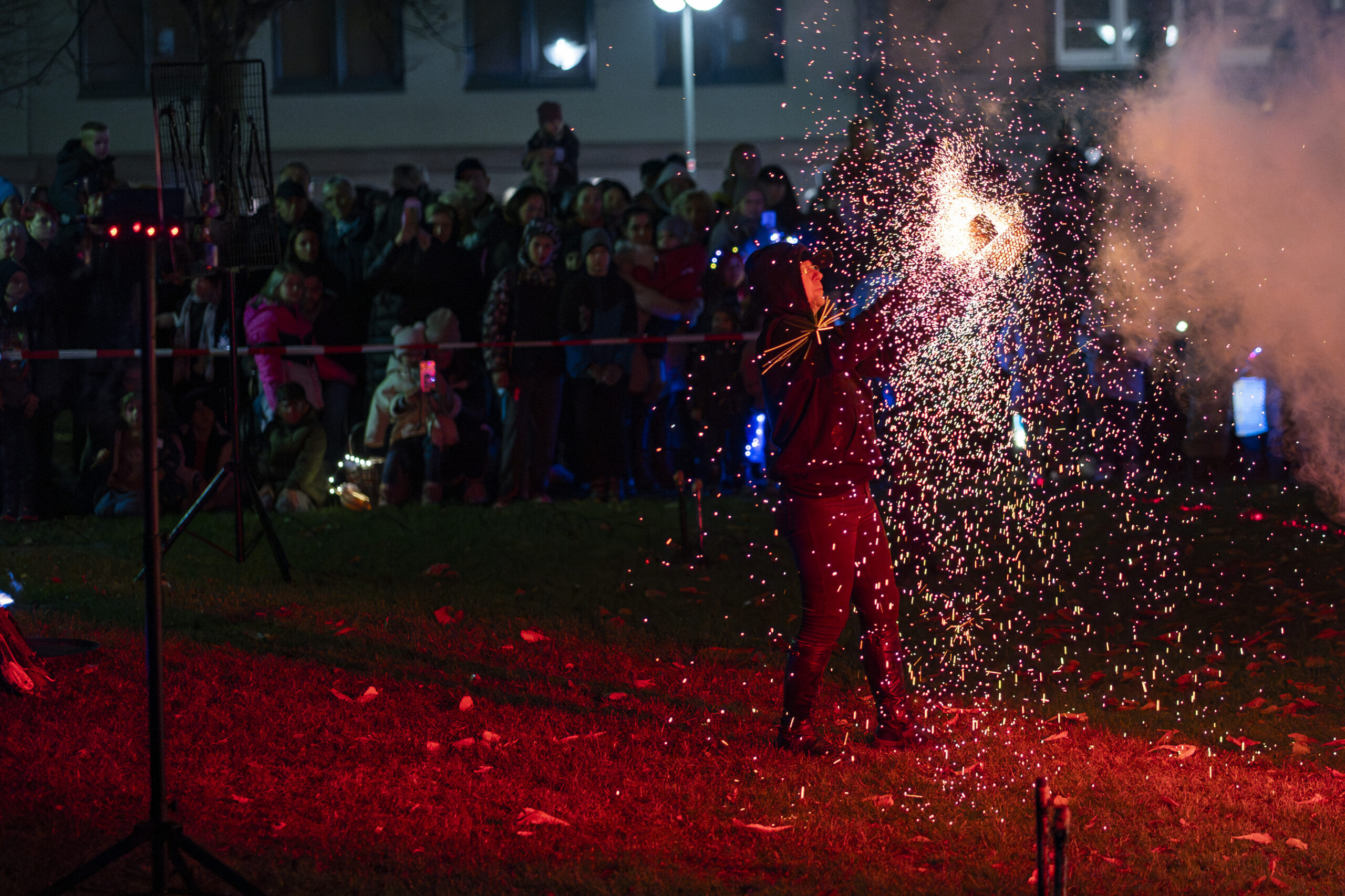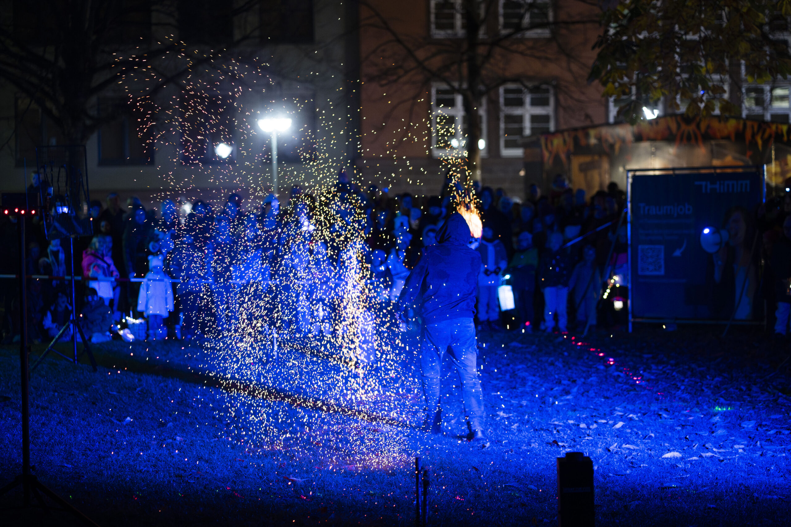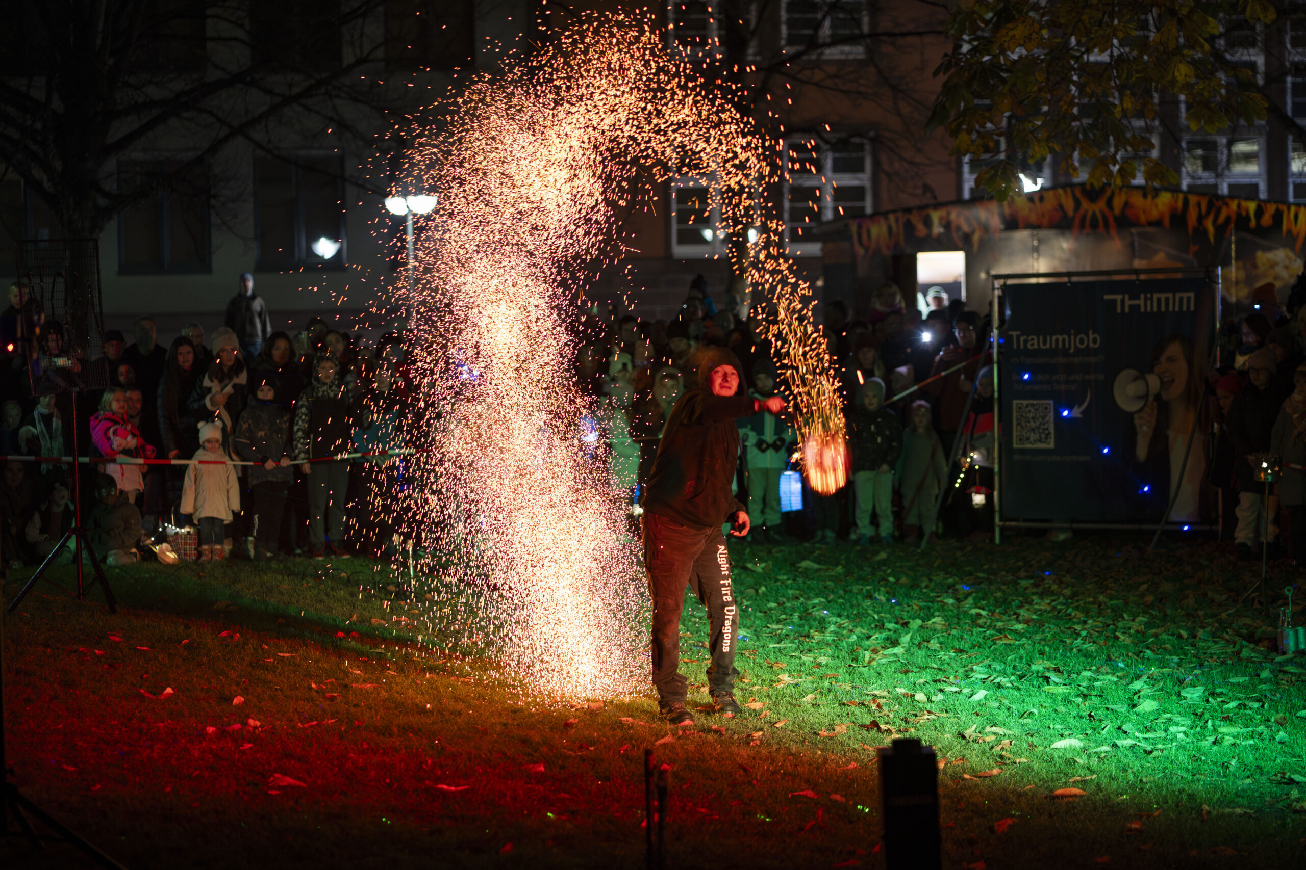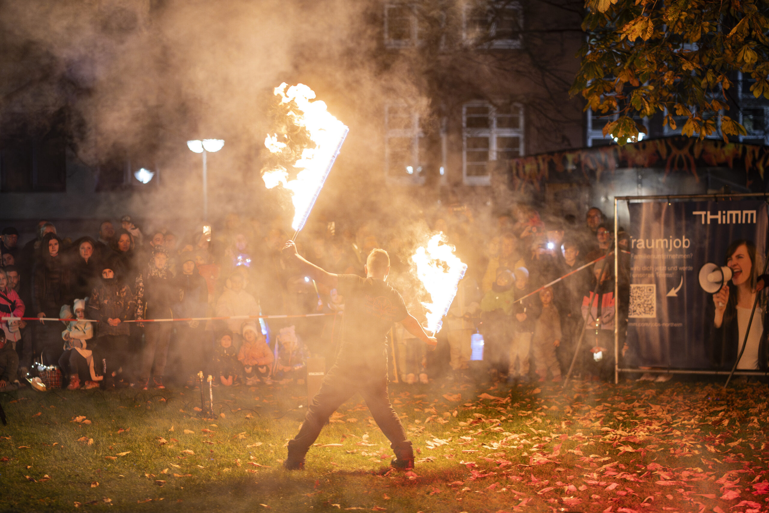 Ein Zug von Hunderten Laternen zog am Sonntagabend vom Mühlenanger in Richtung Münsterplatz. Ebenso viele Familien und ihre Kinder nahmen am Lichterumzug teil. Zum großen Finale versammelten sich die Teilnehmenden am Münsterplatz, wo zum Abschluss des herbstlichen CityRummels eine bunte Feuershow zu sehen war.
