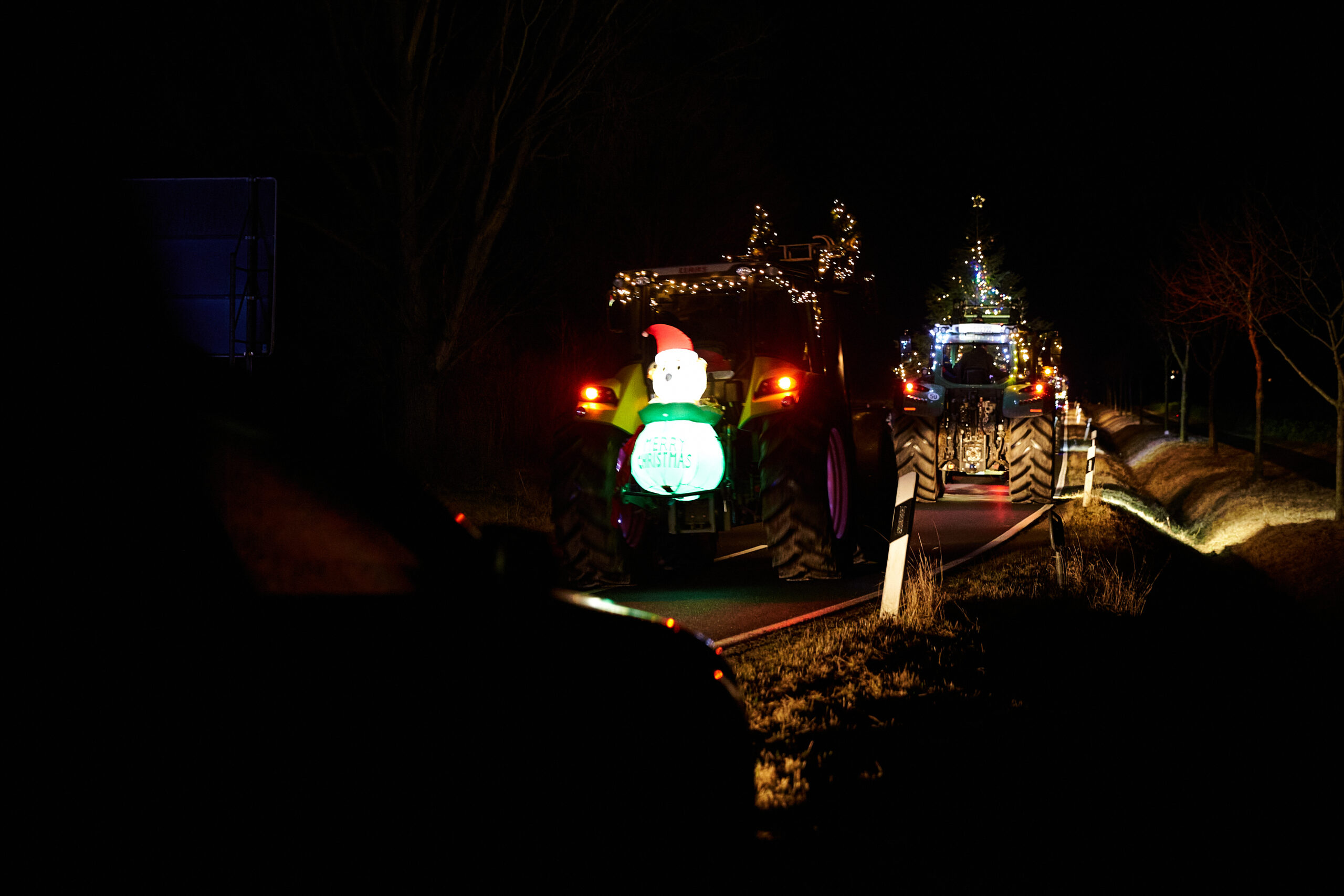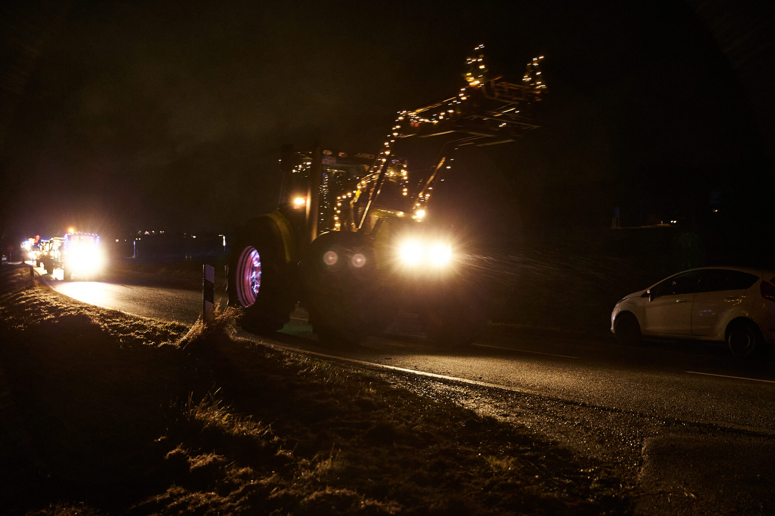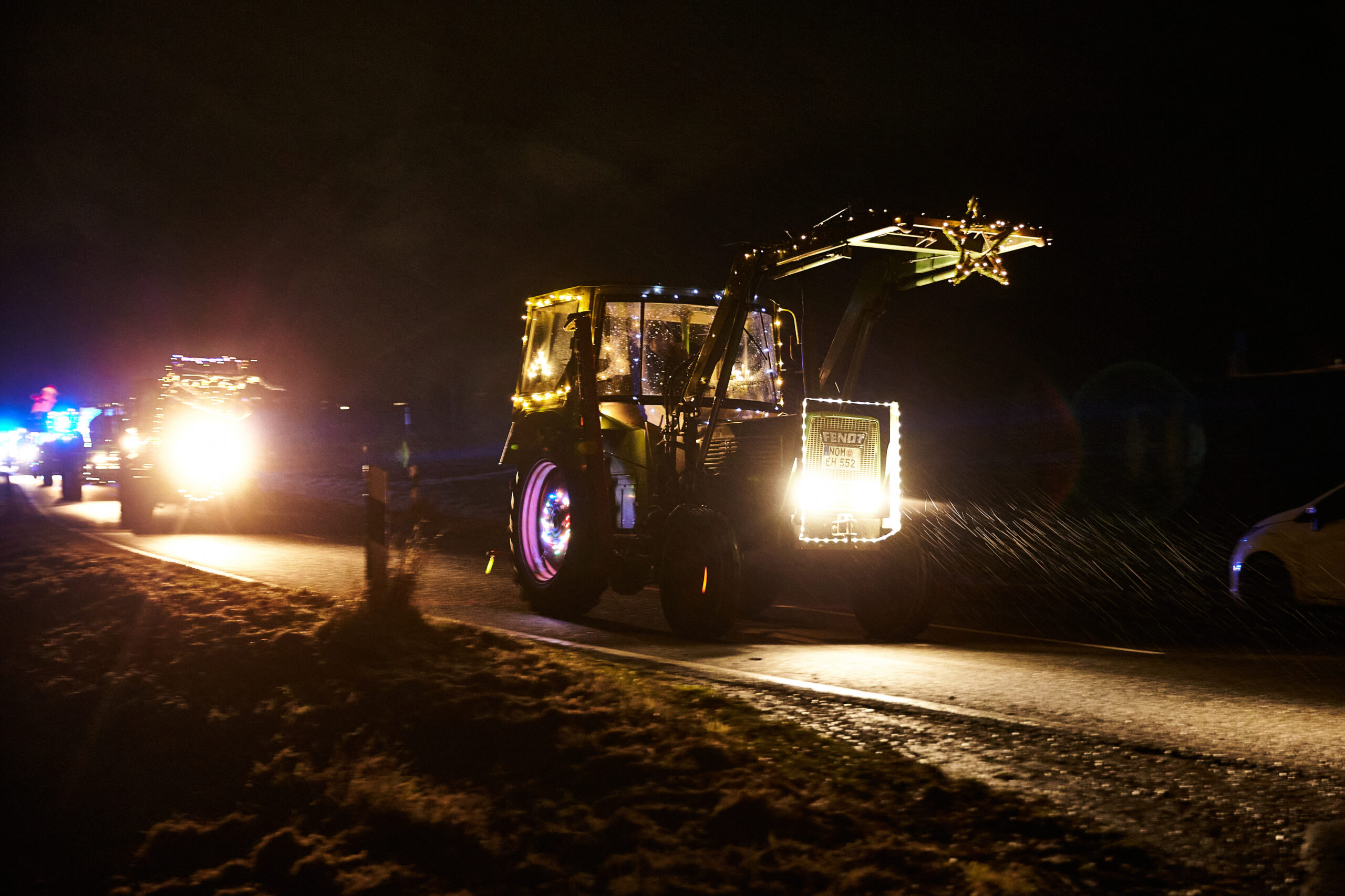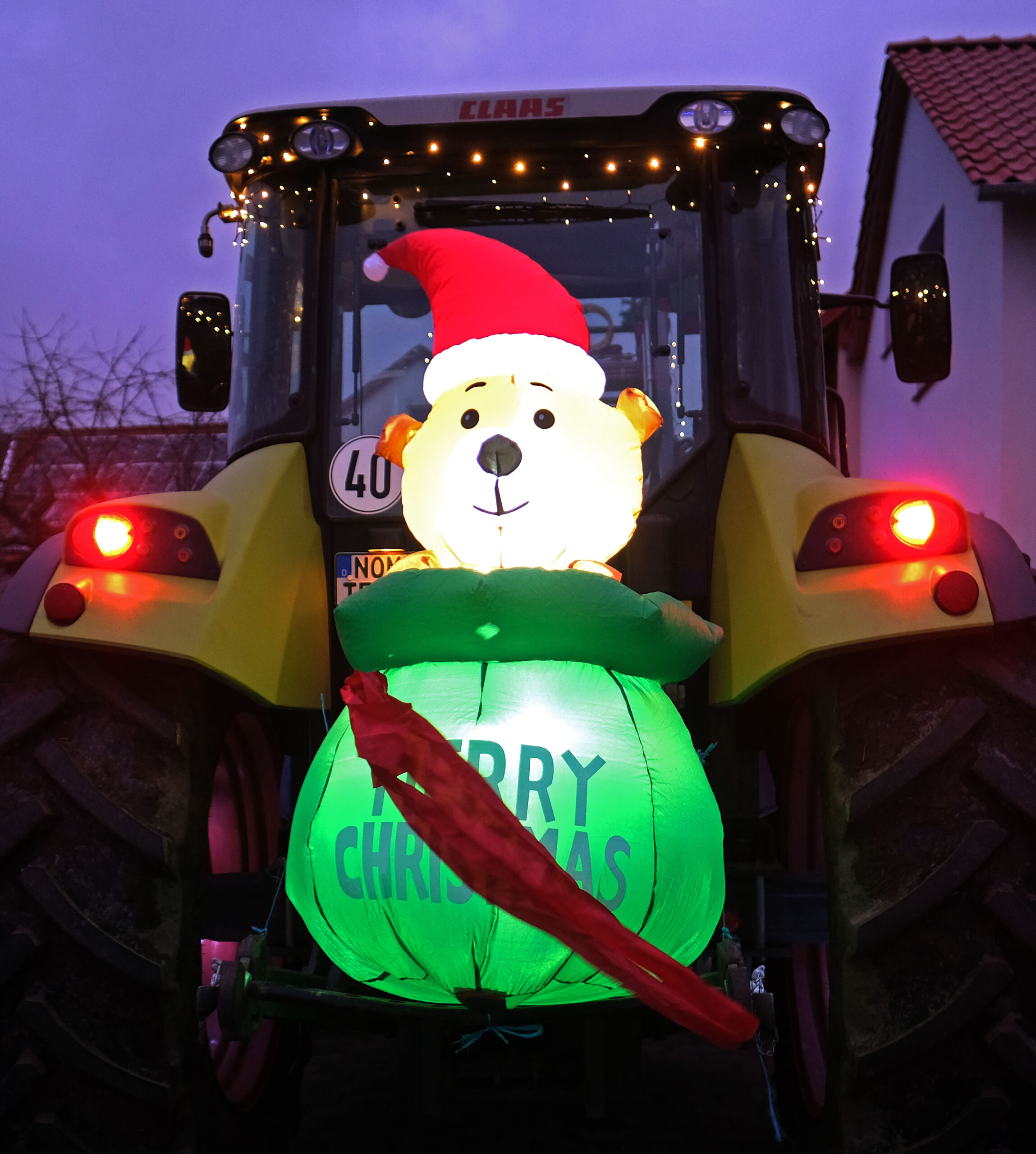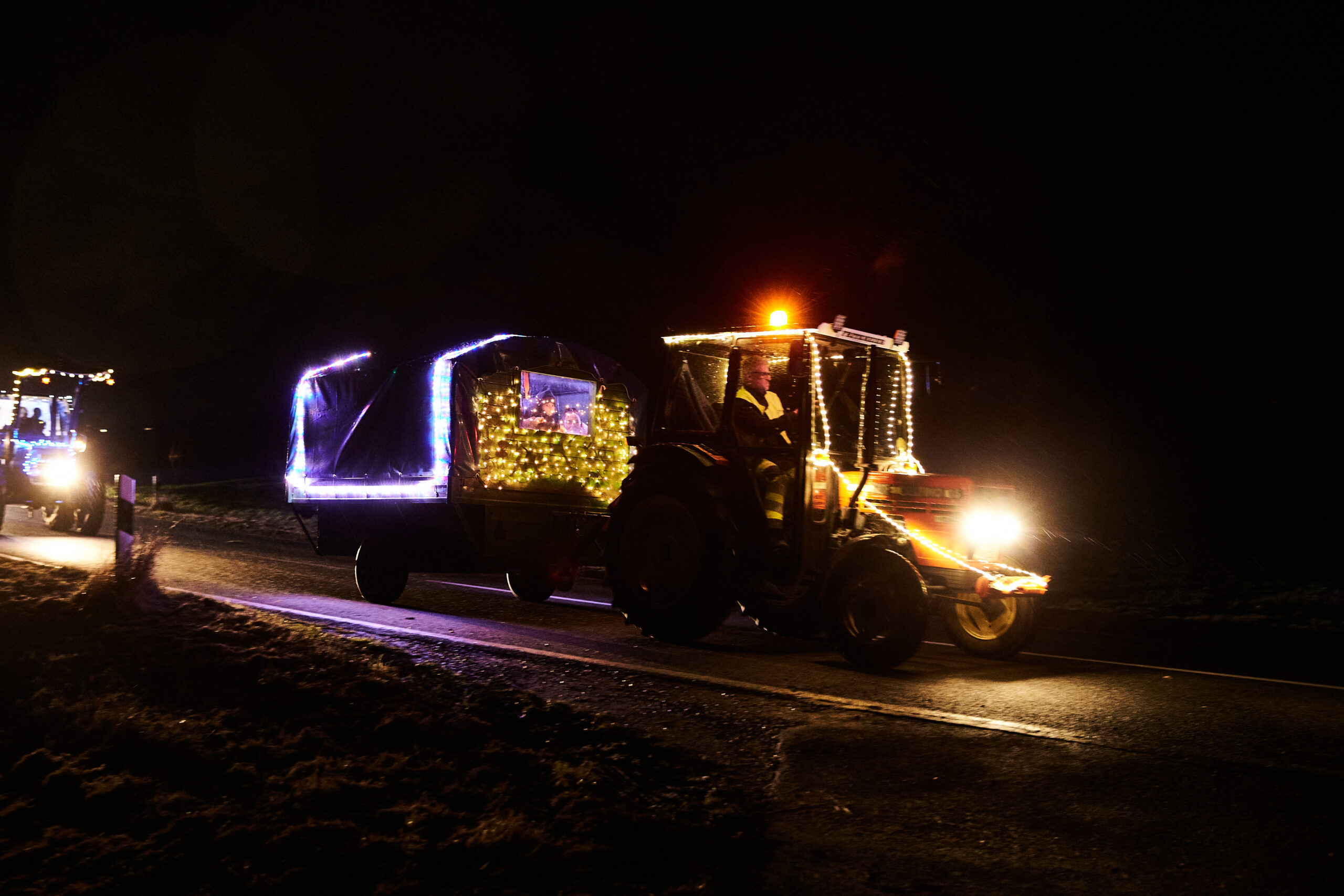 Beleuchtete Traktoren und Feuerwehrautos zogen am 4. Adventssonntag durch die Straßen von Sudheim und Bühle. Wie in vielen anderen Orten auch wurden die Maschinen mit weihnachtlichen Lichtern und Motiven geschmückt.