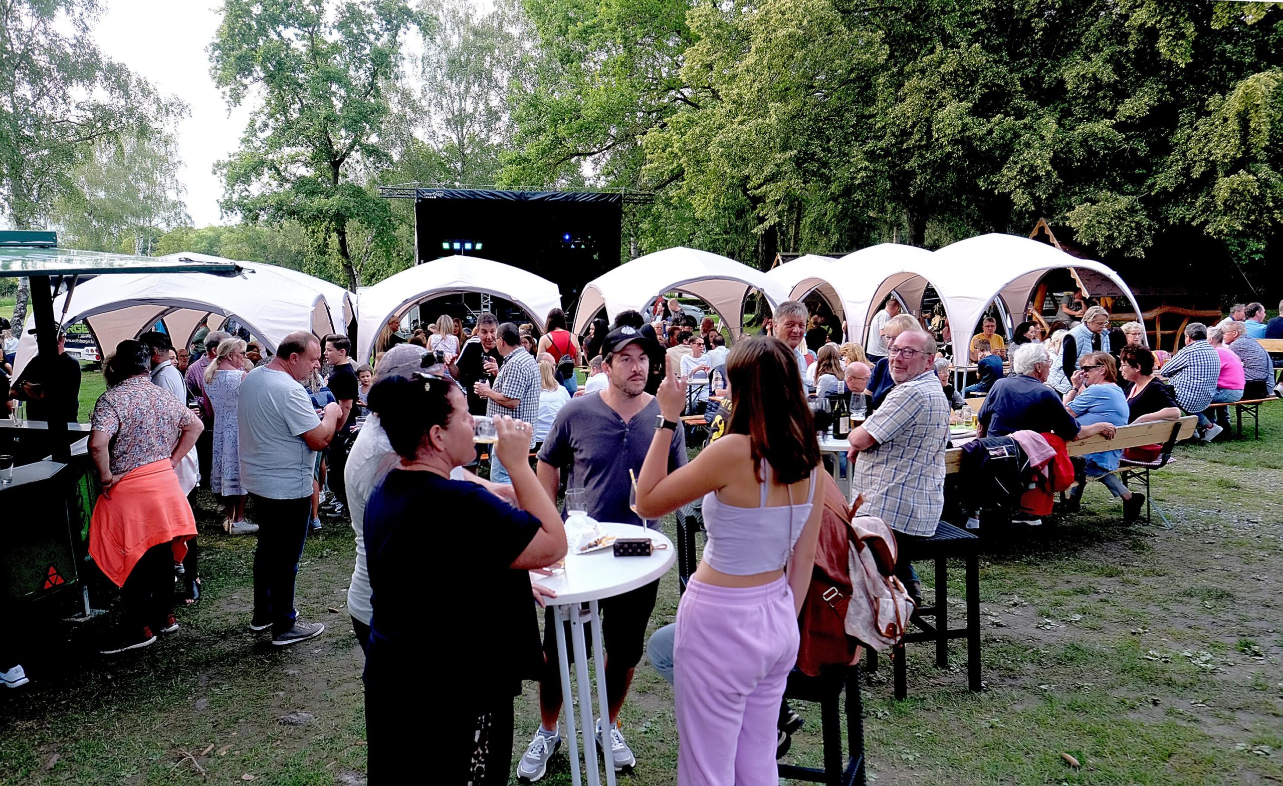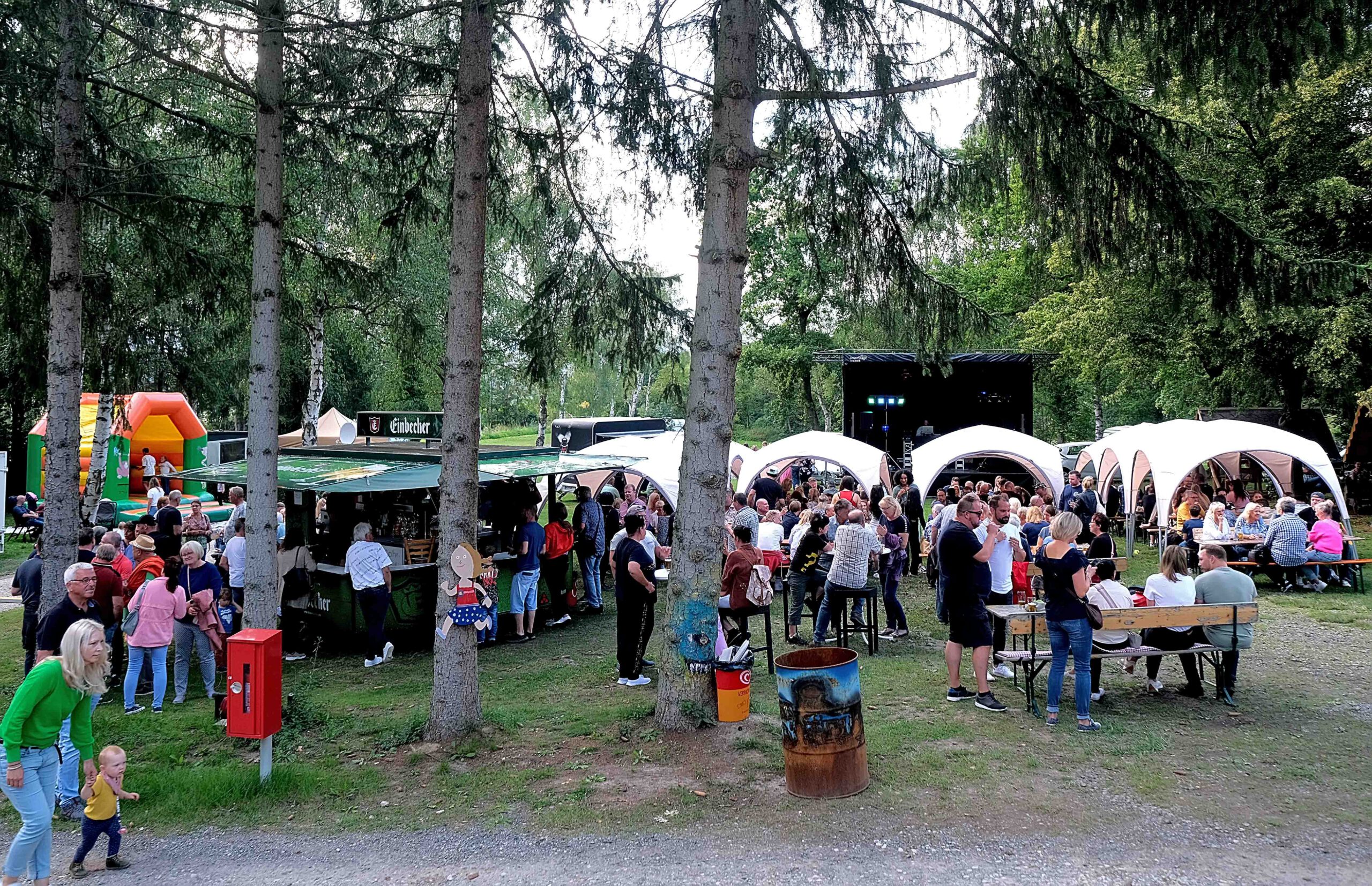 Auch kulinarisch ist gut vorgesorgt. „Mein Lieblingsplatz“ bringt Wein, Aperol und Flammkuchen mit. Leckere Burger gibt es von „Wolfs Burger“, Fleischermeister Julian Haase bringt direkt ein ganzes Spanferkel mit. Am Bierstand von „Boss Greif“ gibt es neben Bier auch kühle alkoholfreie Getränke. Es ist vor allem die Megakulisse, die viele Gäste an den Sultmer Wald lockt. Bei Hitze durch die Bäume geschützt und mit einem herrlichen Blick auf den Northeimer Freizeitsee, ist der Campingplatz am Berg schon lange kein Geheimtipp mehr. Seit Jahren kommen tausende Besucher zum Wein-Berg-Fest. Dank der guten Lage bei jedem Wetter.