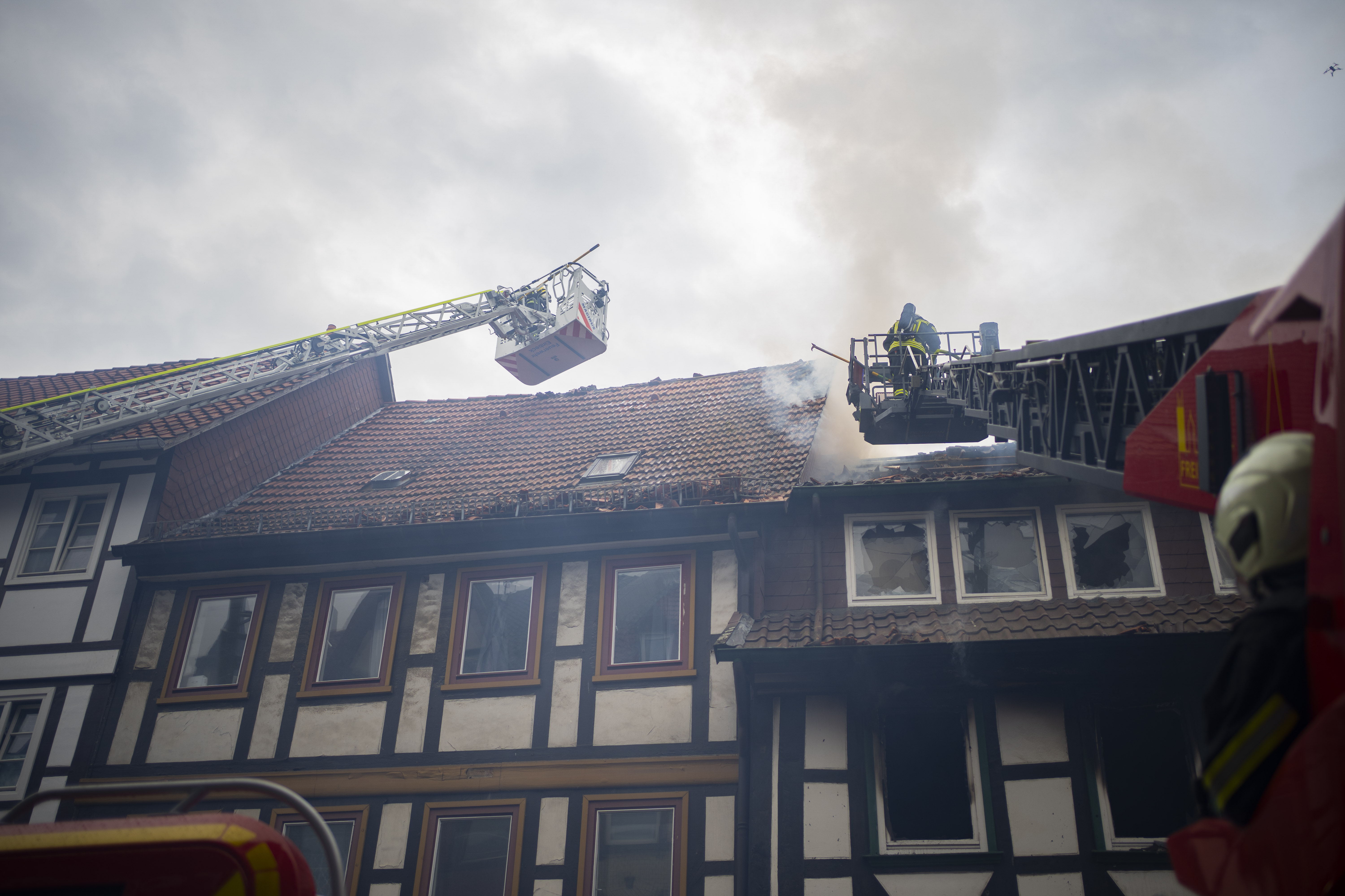 Der Brand in der Northeimer Innenstadt hat am Donnerstagnachmittag einen Großeinsatz von Feuerwehr und Rettungskräften ausgelöst. Gegen 16.38 Uhr gingen zahlreiche Notrufe bei der Leitstelle ein. Beim Eintreffen der ersten Einsatzkräfte drang bereits dichter Rauch aus dem betroffenen Wohnhaus, Flammen schlugen aus einem Fenster im ersten Obergeschoss.