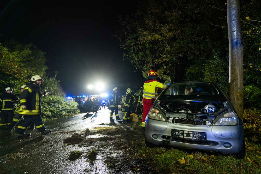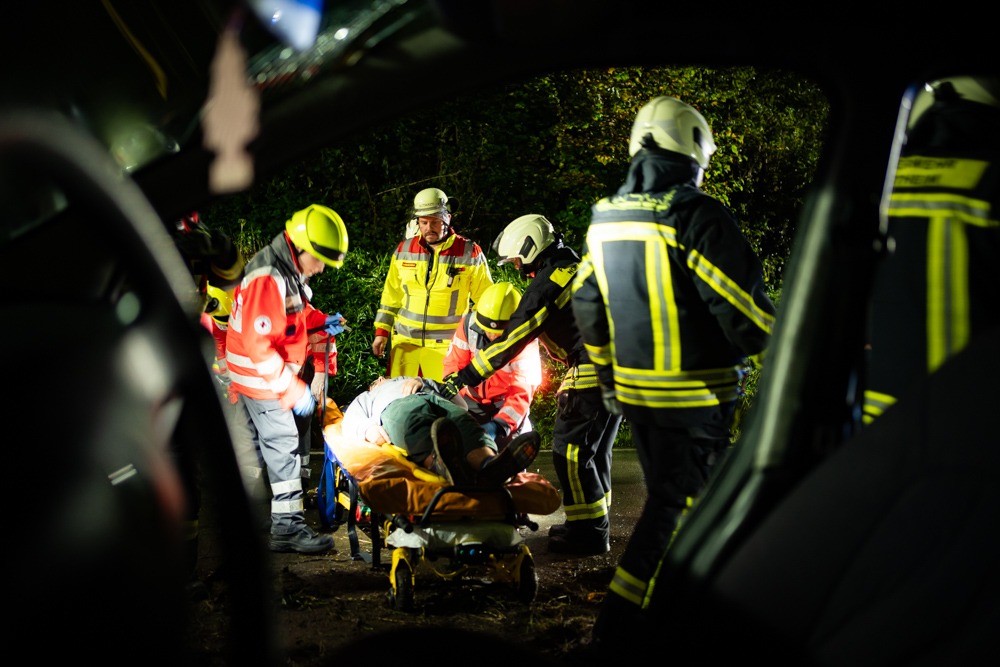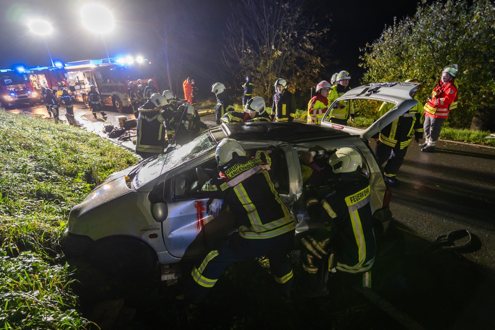 Die Lage vor Ort stellte sich dann wie folgt dar: Auf einer Landstraße stoßen zwei Fahrzeuge in einer engen und dunklen Kurve zusammen. Ein drittes Fahrzeug will ausweichen und verunfallt ebenfalls. Sechs Verletzte gilt es zu versorgen, einer von ihnen irrte an der Einsatzstelle umher. Die restlichen Opfer müssen aus den drei Autos befreit werden, der Notarzt vor Ort entscheidet aufgrund der Schwere der Verletzung, wer zuerst gerettet werden muss. Die Art der Verletzungen hat Notarzt Ralf Schiffner mit den Verletztendarstellern abgesprochen, damit die neben der Optik auch Schmerzen schauspielerisch darstellen können.