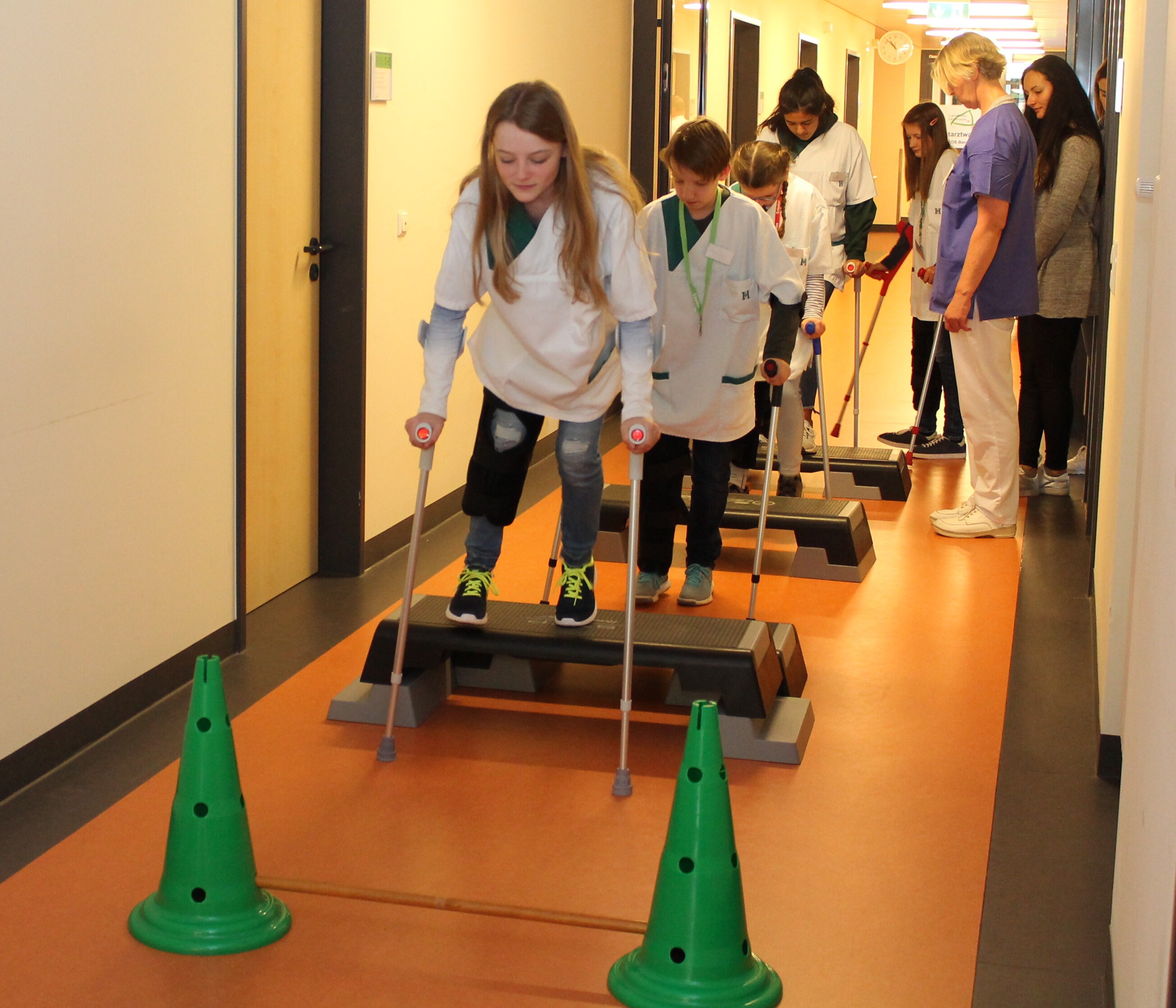 In der Geburtshilfe haben die neugierigen Teilnehmer den Kreißsaal sowie ein Familienzimmer auf der Station erkunden und sogar ein Neugeborenes bewundern. Mit den Physiotherapeuten wurde im Anschluss ein hindernisreicher Parcours mit Gehstützen durchlaufen.