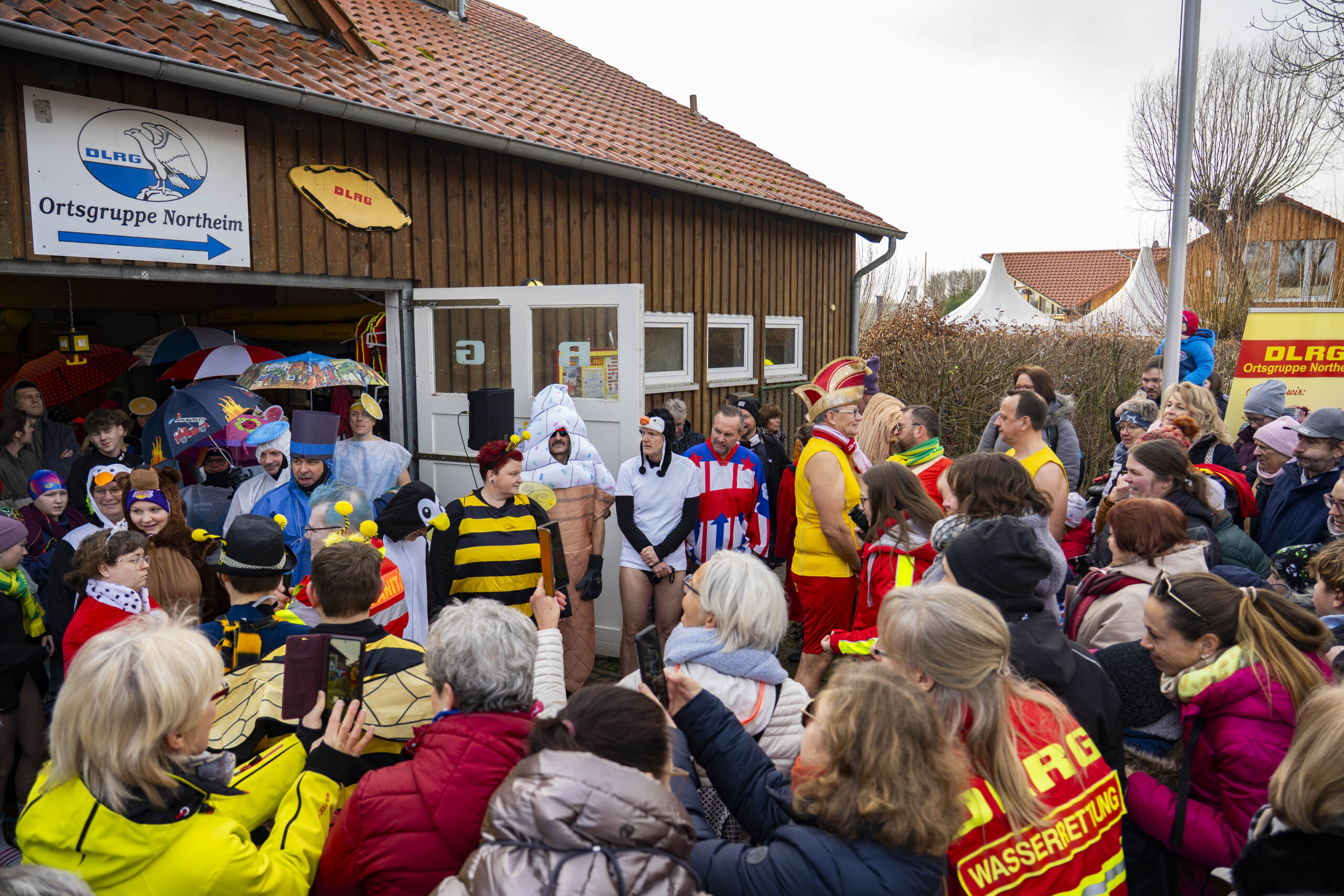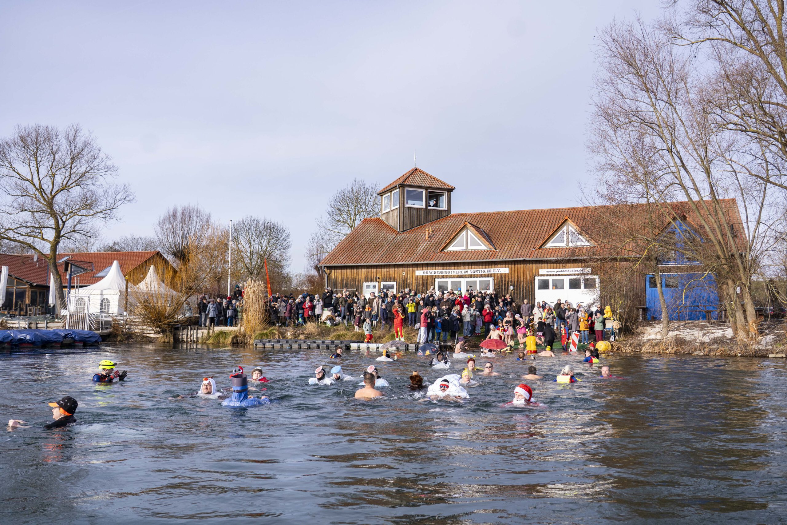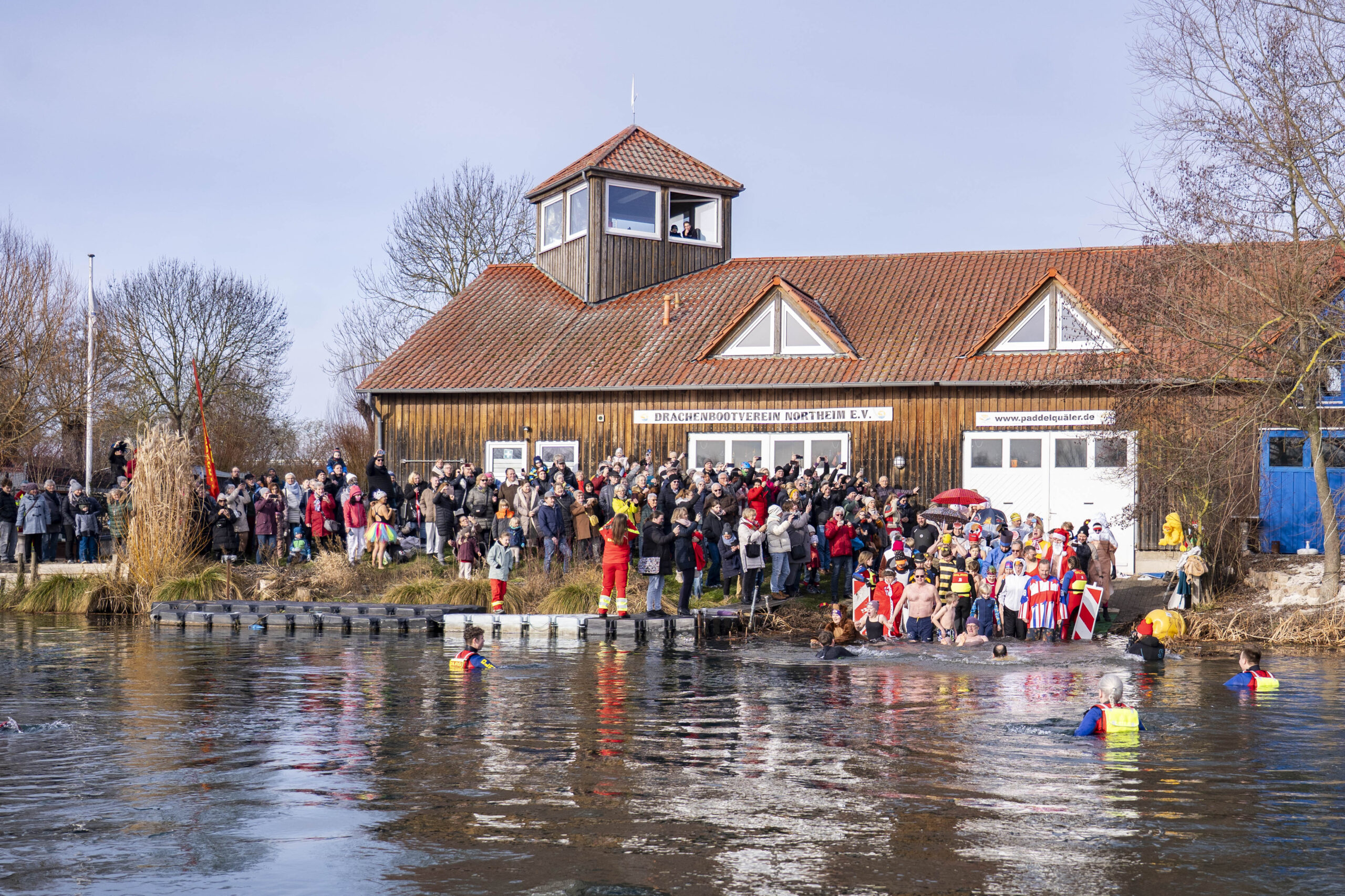 Ein leises Knirschen liegt in der Luft, als sich am Samstagvormittag die ersten Schritte über den leicht gefrorenen Sand am Northeimer Freizeitsee schieben. Es riecht nach Kaffee, nach kalter Wintersonne und ein bisschen nach Abenteuer. Neben dem Steg steht ein Mann im knallroten Clownskostüm und zieht sich mit zittrigen Fingern die Badekappe über die Ohren. „Warum mache ich das eigentlich?“, fragt er lachend in die Runde. Neben ihm antwortet jemand trocken: „Weil’s Tradition ist.“ So beginnt das Neujahrsschwimmen der DLRG Northeim, Ausgabe Nummer sechs. Ein Ritual, das längst mehr ist als nur ein kühner Sprung ins Wasser. Es ist Treffpunkt, Mutprobe und Winterfest in einem. Und in diesem Jahr vor allem eins: ein „Karneval der Kostüme“.