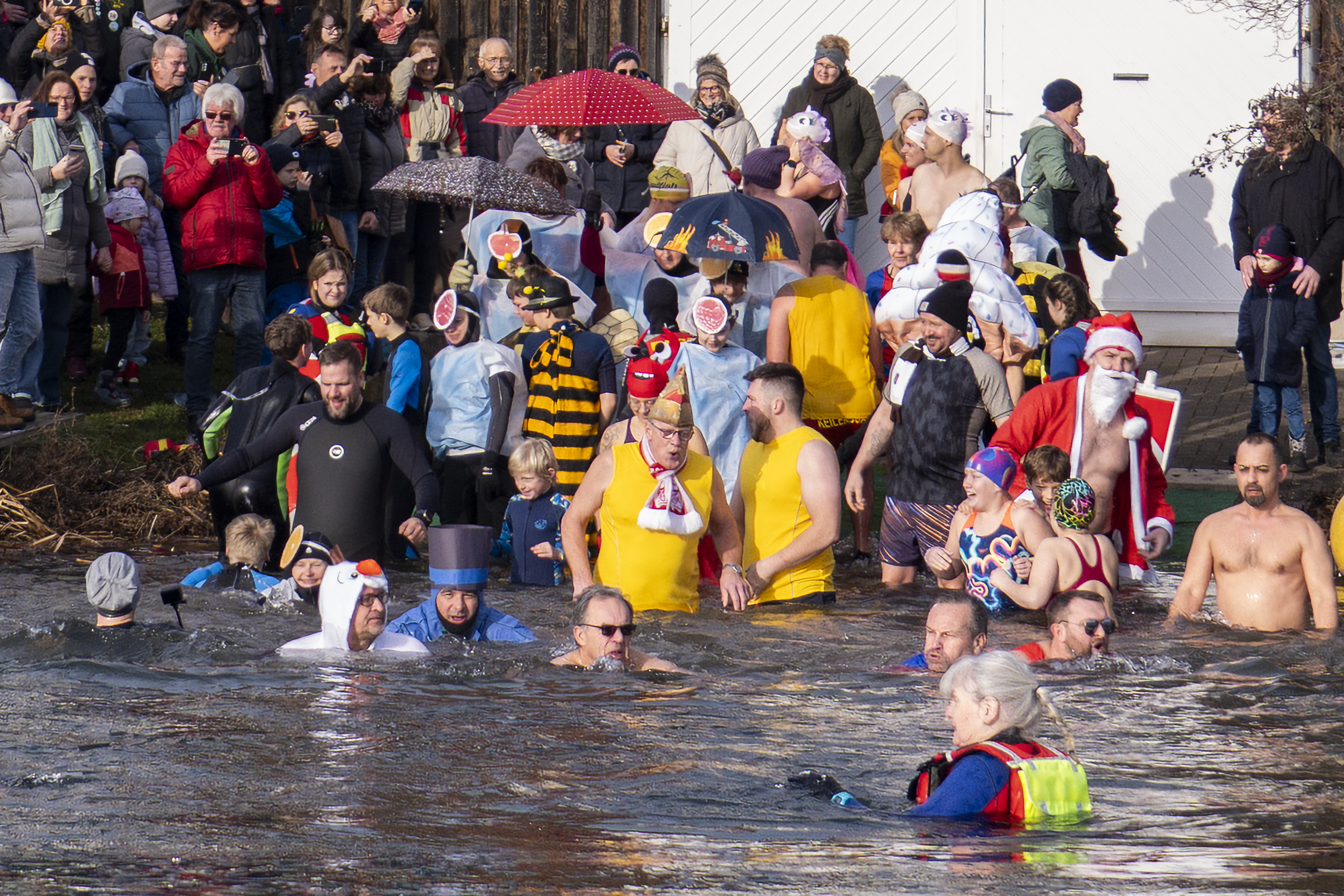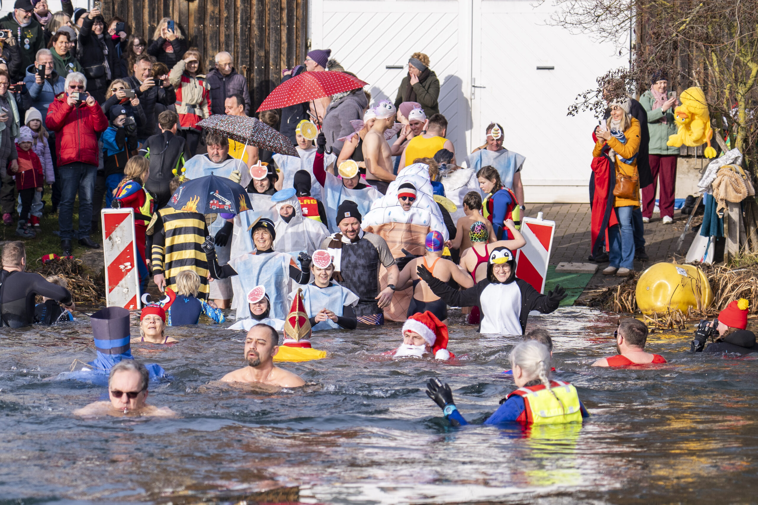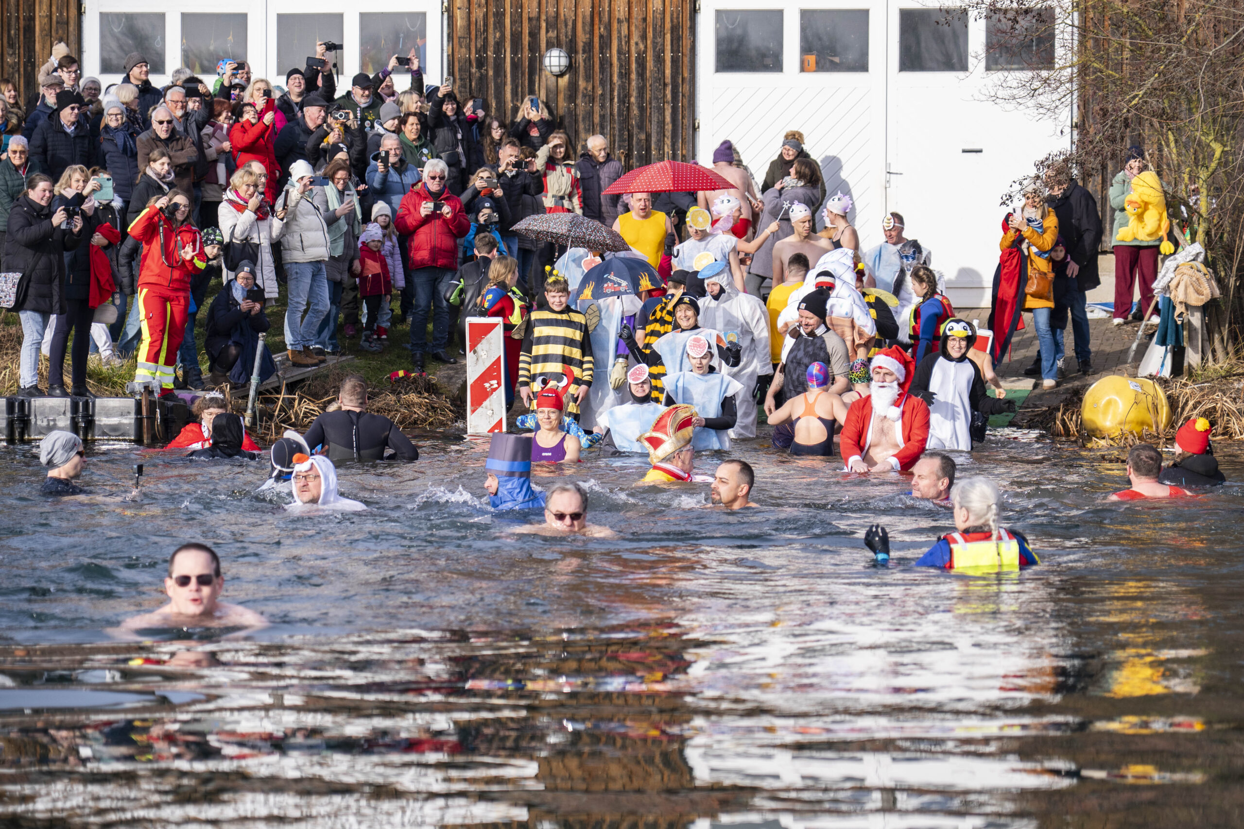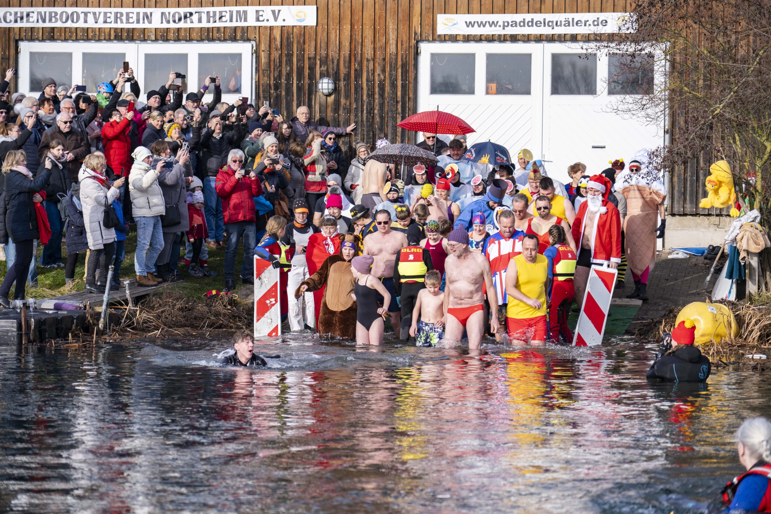 Entsprechend kalt ist das Wasser. Genau gesagt: sehr kalt. Wer seinen Fuß hineinhält, zieht ihn instinktiv wieder zurück. Doch Rückzieher gibt es heute nicht. Dafür sorgen auch die Rettungsschwimmer der DLRG-Ortsgruppe, die das Geschehen wachsam begleiten. Mit Neoprenanzügen, Rettungsbojen und professioneller Ruhe stehen sie bereit für den Fall der Fälle, der glücklicherweise nie eintritt.