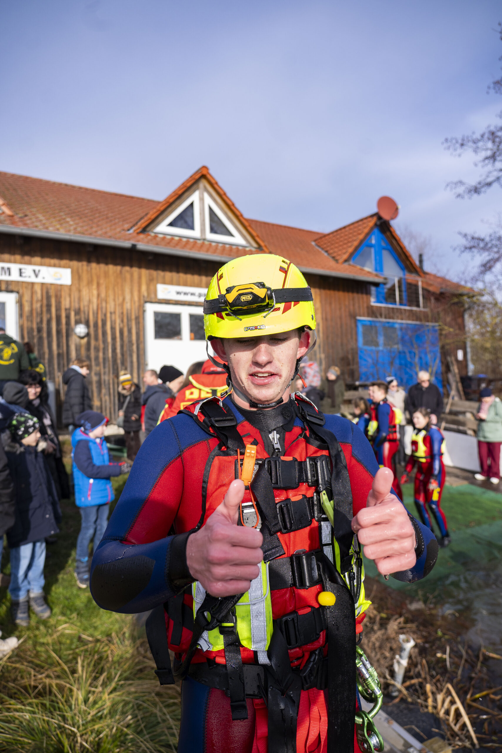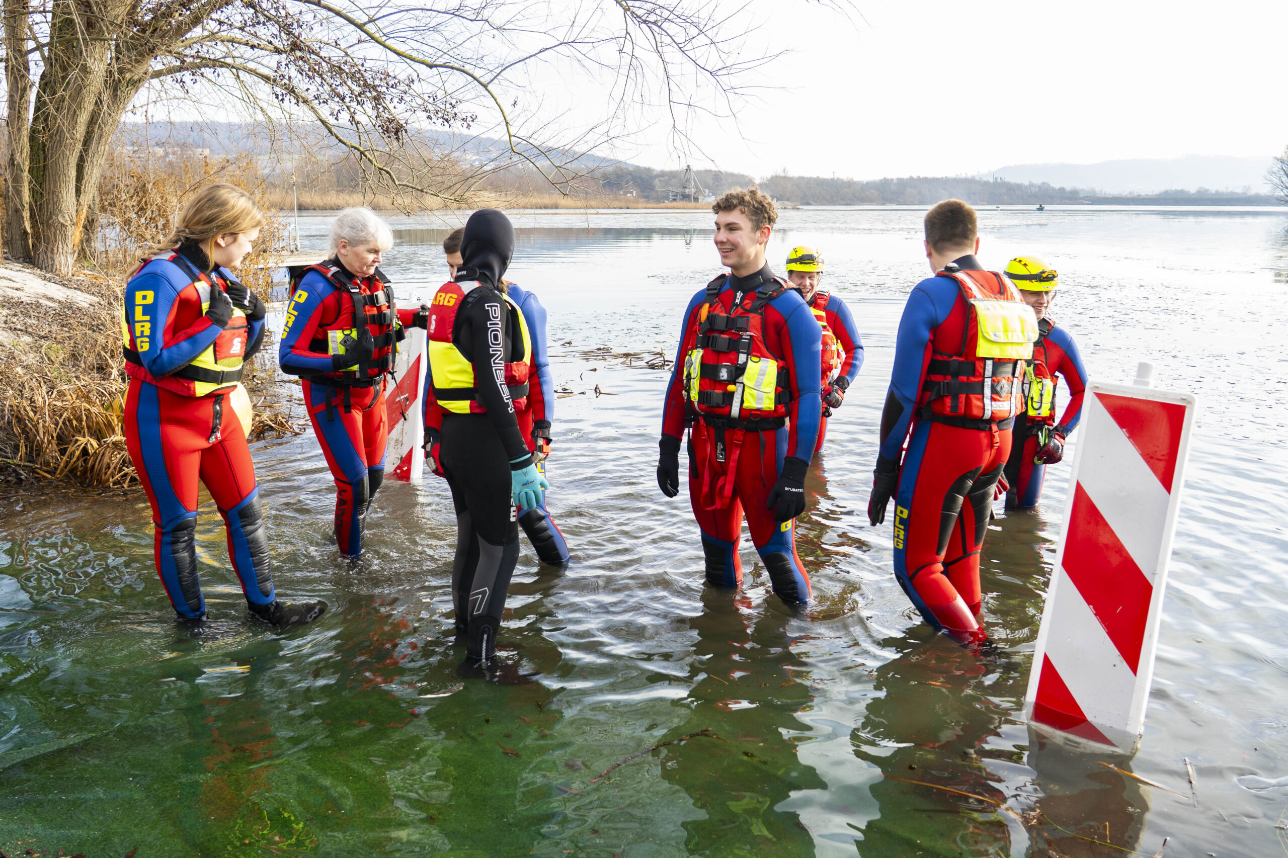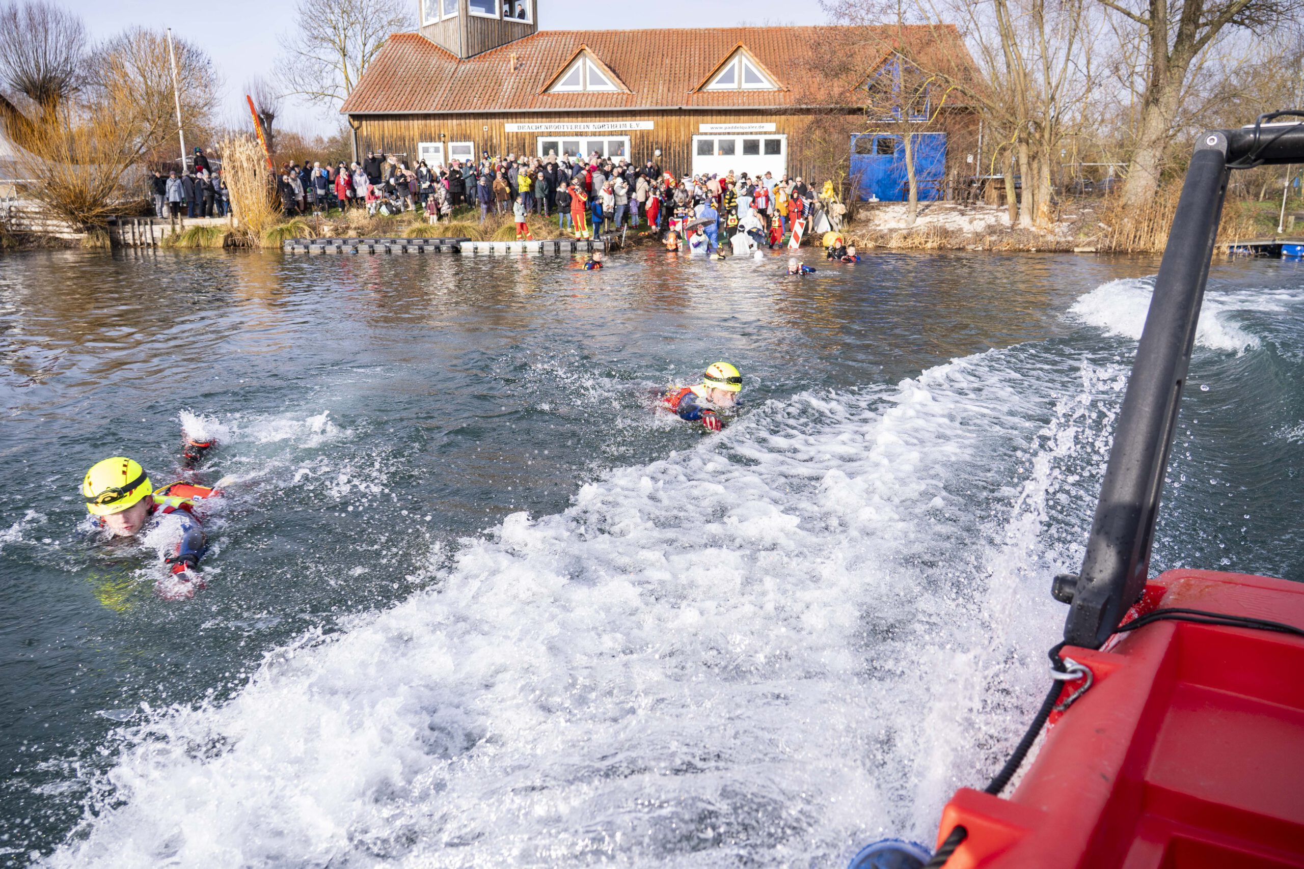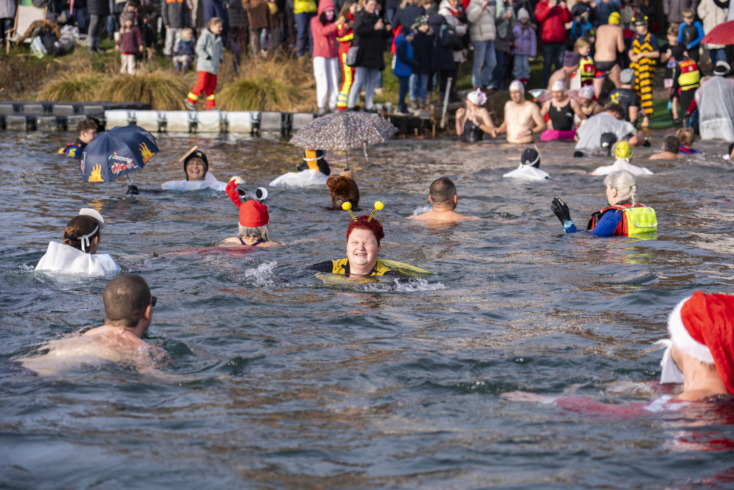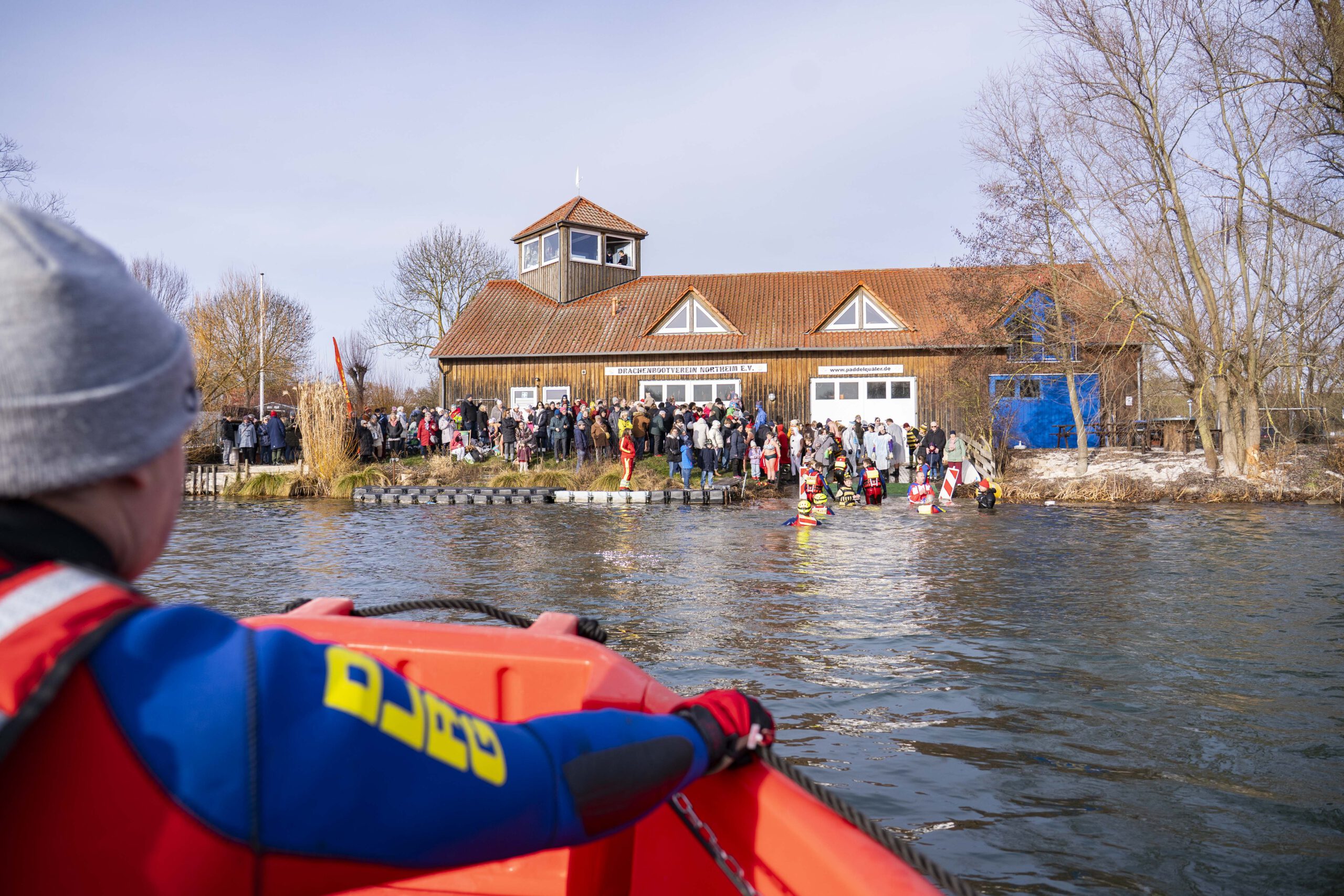 Entsprechend kalt ist das Wasser. Genau gesagt: sehr kalt. Wer seinen Fuß hineinhält, zieht ihn instinktiv wieder zurück. Doch Rückzieher gibt es heute nicht. Dafür sorgen auch die Rettungsschwimmer der DLRG-Ortsgruppe, die das Geschehen wachsam begleiten. Mit Neoprenanzügen, Rettungsbojen und professioneller Ruhe stehen sie bereit für den Fall der Fälle, der glücklicherweise nie eintritt.