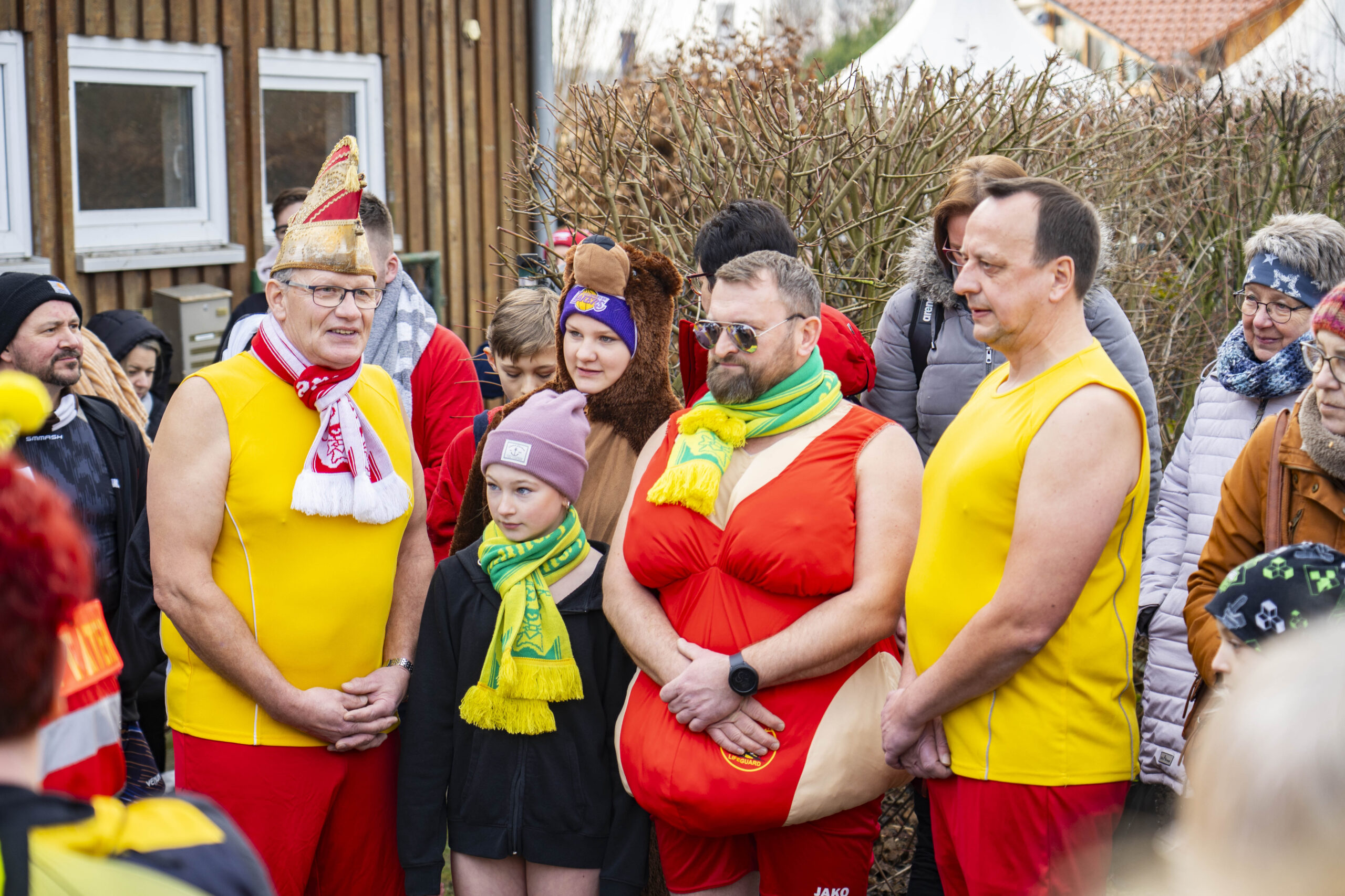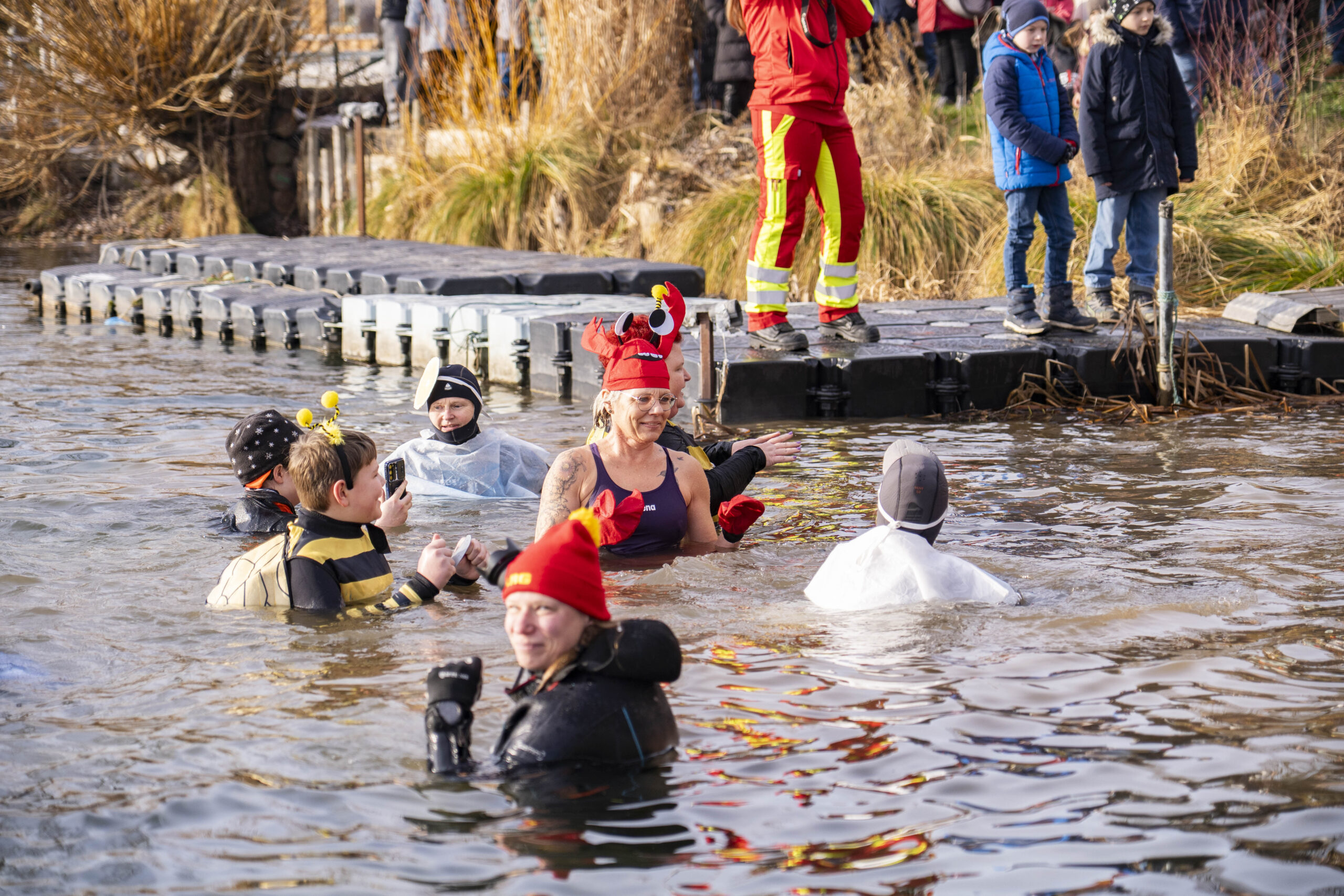 Etwa 45 Menschen stehen schließlich am Ufer bereit. Teilnehmerrekord! Fast alle tragen bunte Verkleidungen: Piraten, Superhelden, Pinguine, Prinzessinnen. Mittendrin eine kleine Abordnung der Karnevalsfreunde Hollenstedt, die das Motto wörtlich genommen haben. Mit Pailletten, Spitzhut und breitem Grinsen trotzen sie Temperaturen, die eigentlich eher nach Heizdecke verlangen als nach Badehose. „Wenn schon frieren, dann mit Stil“, ruft einer von ihnen und bekommt zustimmendes Gelächter zurück.