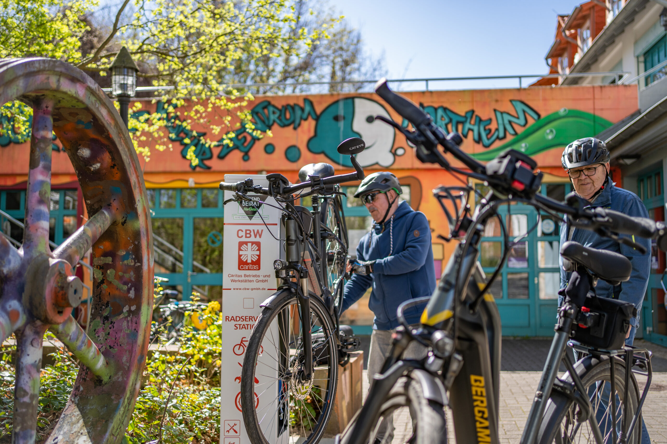 In einem kleinen Turm befinden sich verschiedene Werkzeuge, eine Halterung für Fahrräder und eine Luftpumpe. Gebaut wurde das Gerät von der Caritas Werkstatt in Eschweiler. Die Radservicestation ist frei zugänglich und kostenfrei nutzbar. 2022 haben wir die Anlage mit Radfahrern getestet.