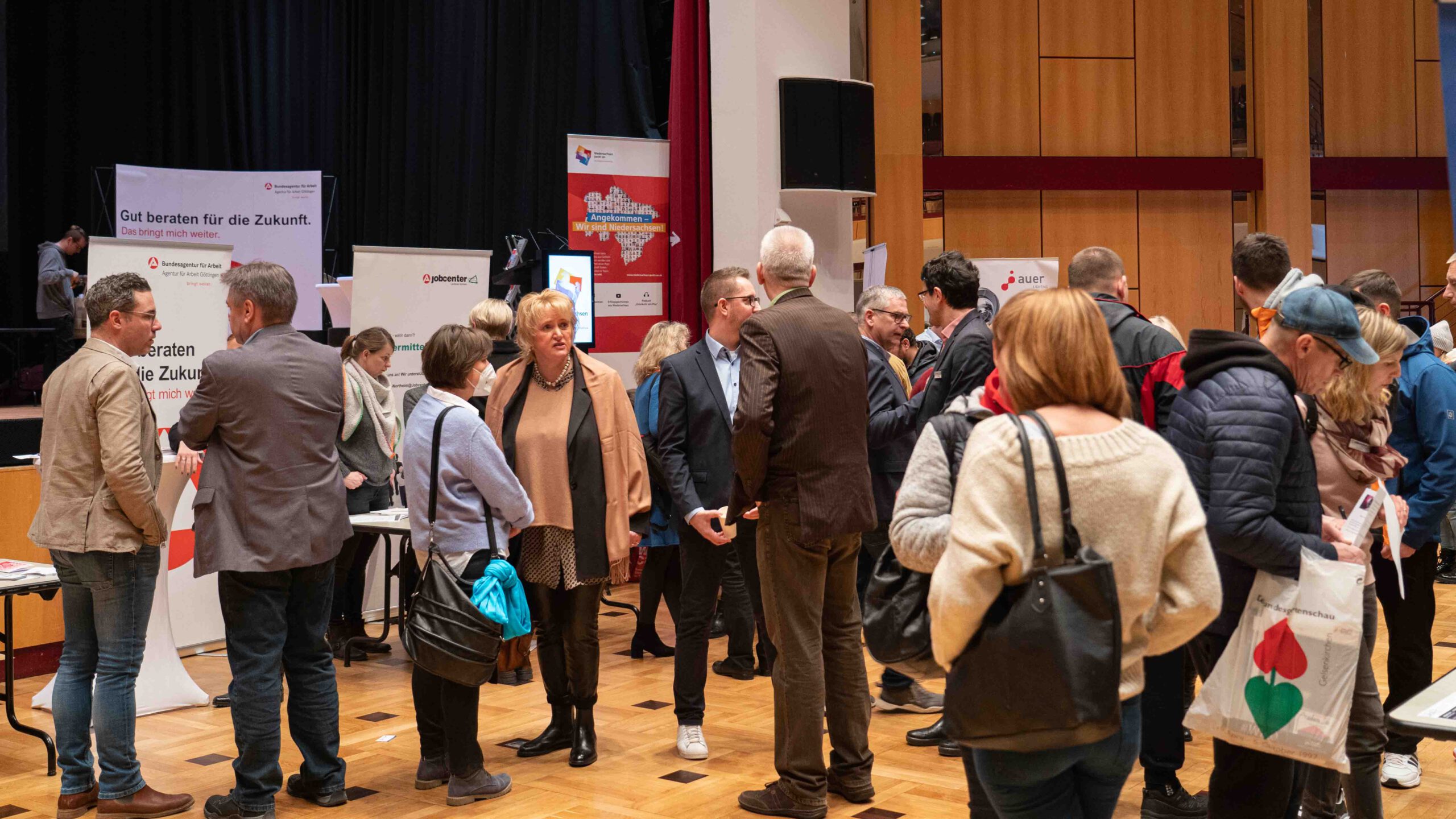 Etwa 30 Unternehmen aus der Region nahmen die Einladung an und waren mit jeweils einem Stand vertreten. Hinzu kommen Vertreter von Netzwerk- und Vermittlungsagenturen sowie Angebote zu Sprachkursen und weitere Informationen für die Geflüchteten. Diese nahmen das Paket gerne an, laut Tobias Broda wurden bis zum Mittag mehr als 400 Besucherinnen und Besucher gezählt. Der Bereichsleiter für Arbeitsvermittlung und Arbeitgeberservice der Agentur für Arbeit in Göttingen zeigt sich überwältigt.