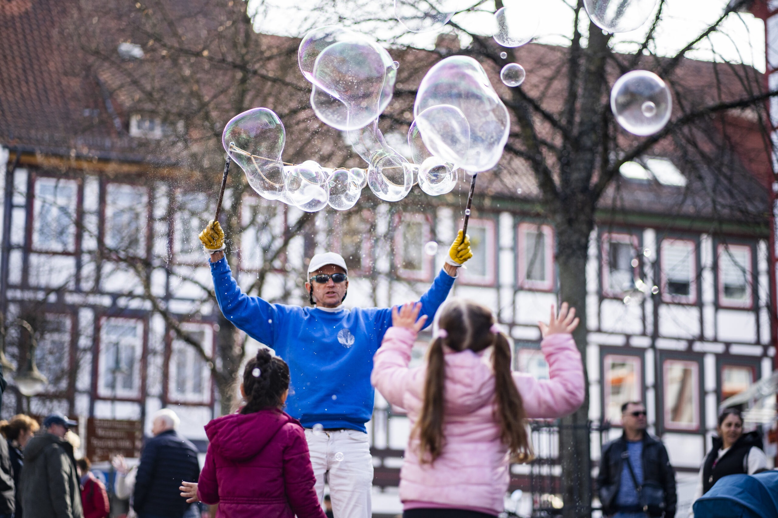 Zu sehen bekamen sie viele Blumen, Leckereien und Kinderspiele rund um Münsterplatz und Breite Straße. Tatsächlich waren in diesem Jahr weniger Ausstellende mit dabei, bestätigt der neue Stadtmarketing-Chef Michael Eilers am Samstag. Einige reisten erst mit Verspätung am Sonntag an, darunter ein Lasertag-Spiel aus Einbeck am Münsterplatz. Am Marktplatz durften Kinder riesige Seifenblasen in die Luft malen, entlang der Breiten Straße duftete der französische Markt alle zwei Meter neu.
