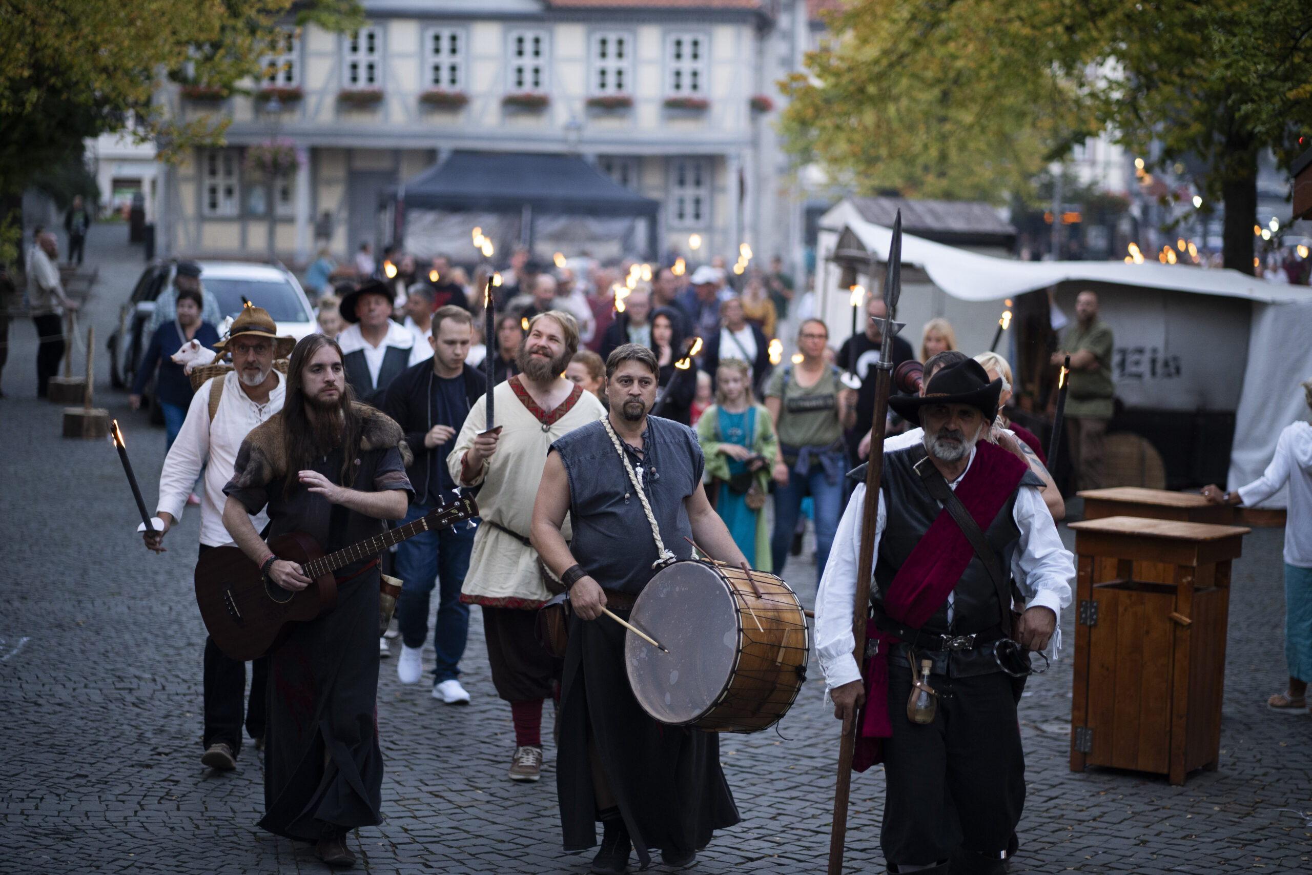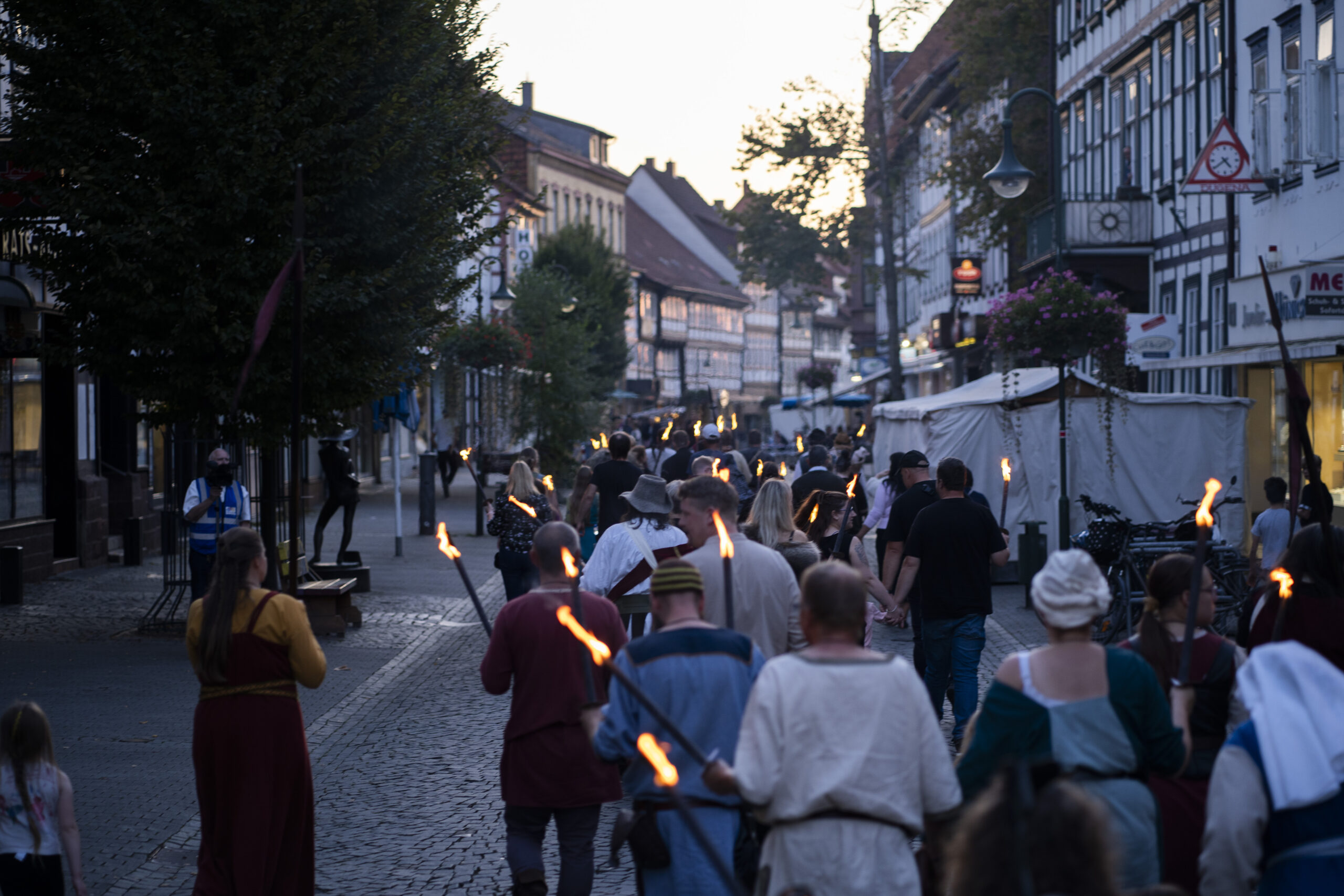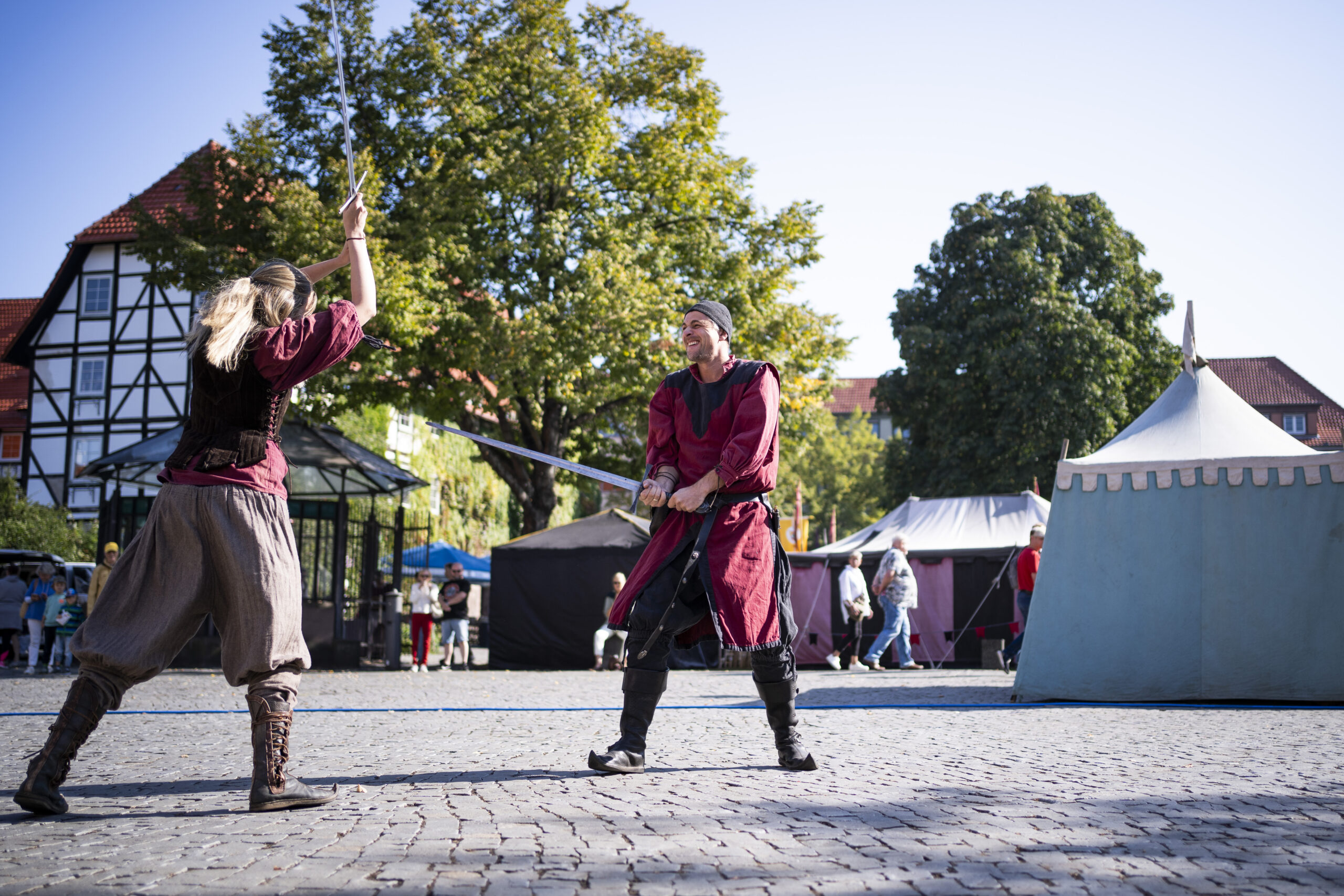 Eröffnet wird das Markttreiben am Samstagvormittag: Um 10.30 Uhr ziehen die Landsknechte mit einem Marsch zum Brauereiturm, begleitet von einem Salutschießen, bevor der festliche Umzug auf dem Münsterplatz ankommt. Dort folgt um 11 Uhr die offizielle Eröffnung, bei der traditionell die Marktordnung verlesen wird. Den ganzen Tag über sorgen Musik- und Tanzgruppen wie „Saltatio Draconum“ oder die „Freyschar zu Bokenrode“ für Unterhaltung, während Schaukämpfe und Vorführungen das Publikum in den Bann ziehen. Am Abend bildet ein großes Konzert auf dem Münsterplatz den Höhepunkt, ehe um 20.30 Uhr ein stimmungsvoller Fackelumzug durch die Altstadt zieht.