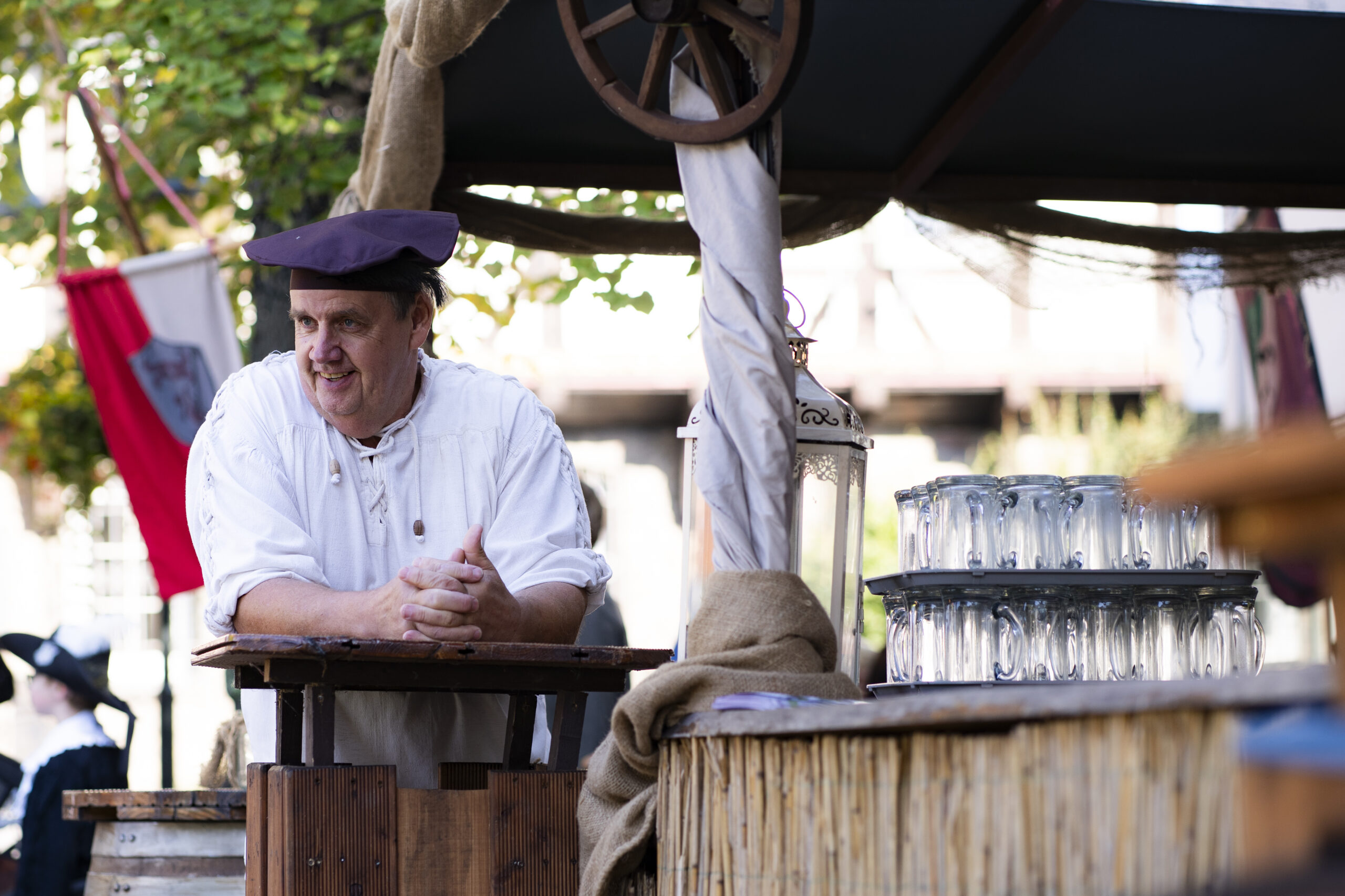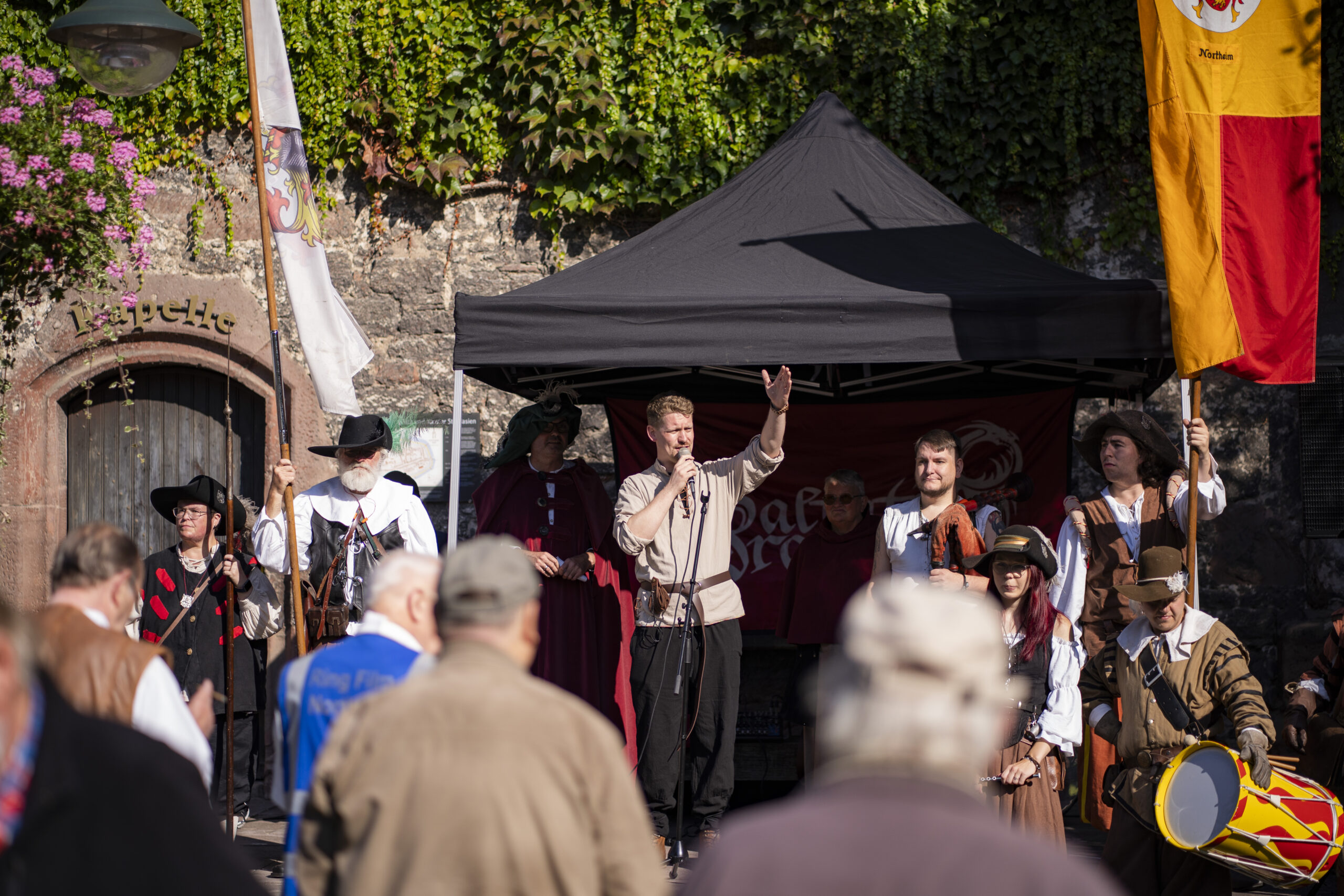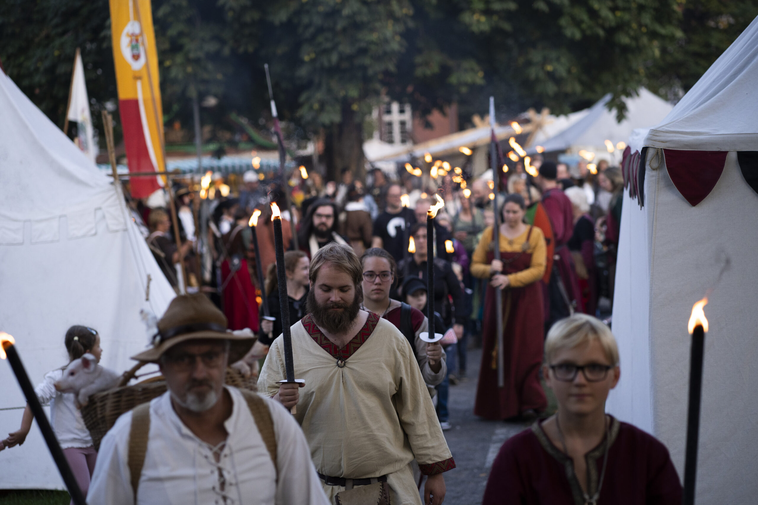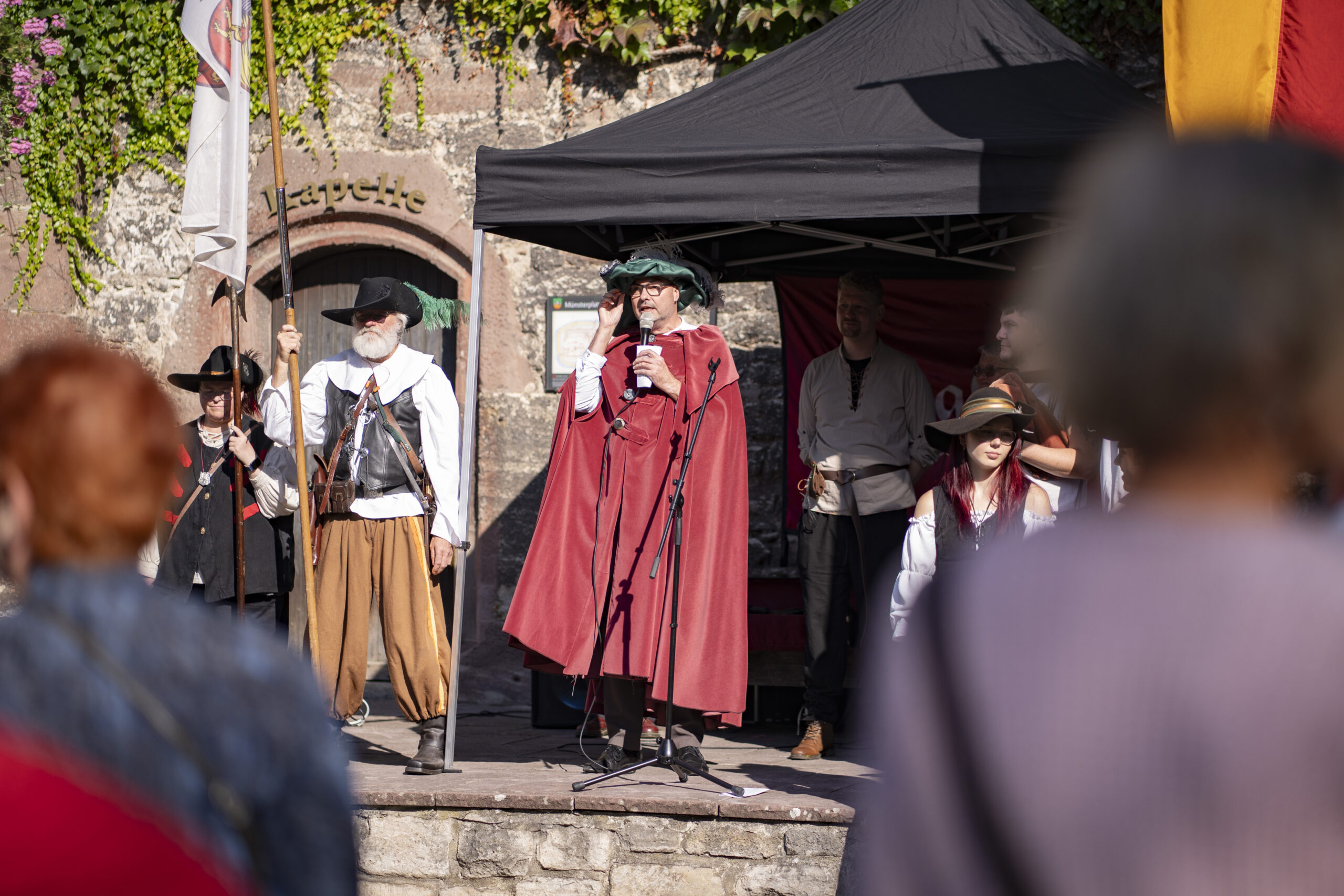 Eröffnet wird das Markttreiben am Samstagvormittag: Um 10.30 Uhr ziehen die Landsknechte mit einem Marsch zum Brauereiturm, begleitet von einem Salutschießen, bevor der festliche Umzug auf dem Münsterplatz ankommt. Dort folgt um 11 Uhr die offizielle Eröffnung, bei der traditionell die Marktordnung verlesen wird. Den ganzen Tag über sorgen Musik- und Tanzgruppen wie „Saltatio Draconum“ oder die „Freyschar zu Bokenrode“ für Unterhaltung, während Schaukämpfe und Vorführungen das Publikum in den Bann ziehen. Am Abend bildet ein großes Konzert auf dem Münsterplatz den Höhepunkt, ehe um 20.30 Uhr ein stimmungsvoller Fackelumzug durch die Altstadt zieht.