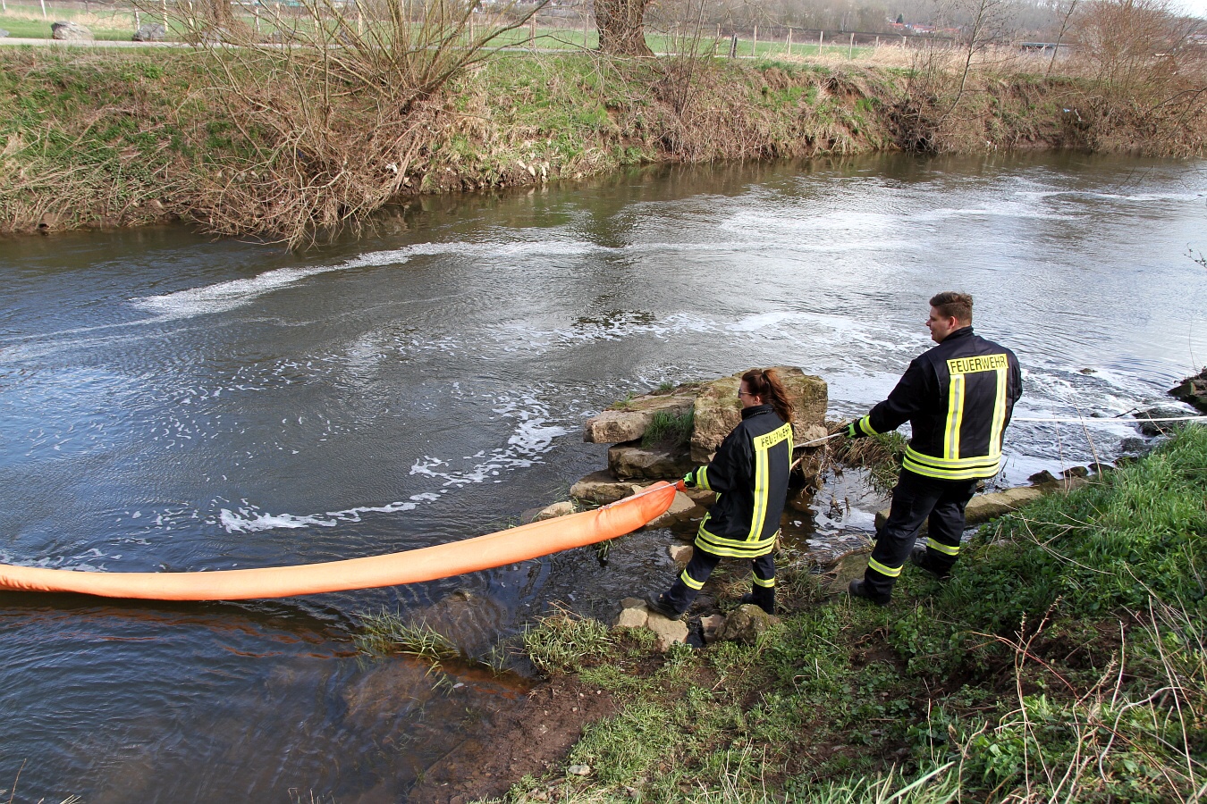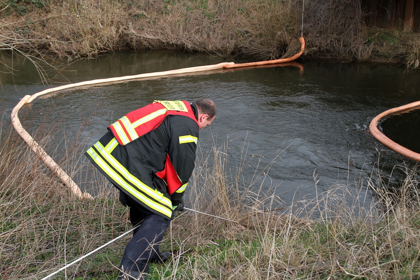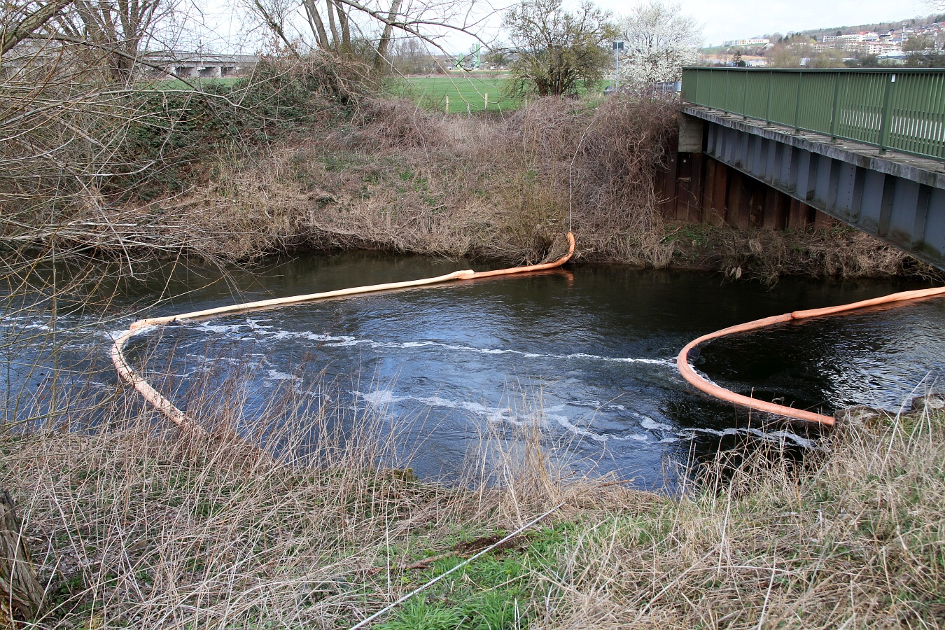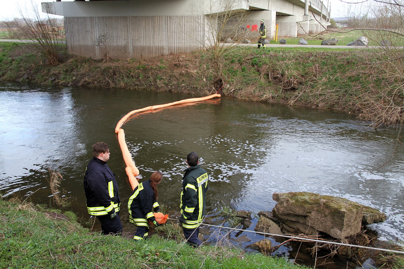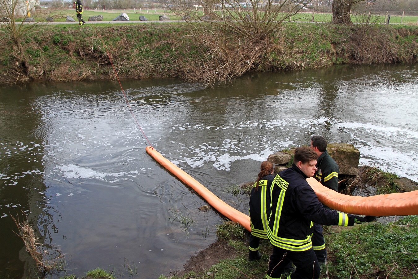 Die Einsatzkräfte legten im Bereich der Kläranlage drei Ölsperren. Mit einem Boot suchten Fachkräfte nach der Ursache. Nachdem die Ölsperren errichtet waren, wurde im Bereich der Langen Brücke Ölbindemittel in die Rhume geschüttet.
