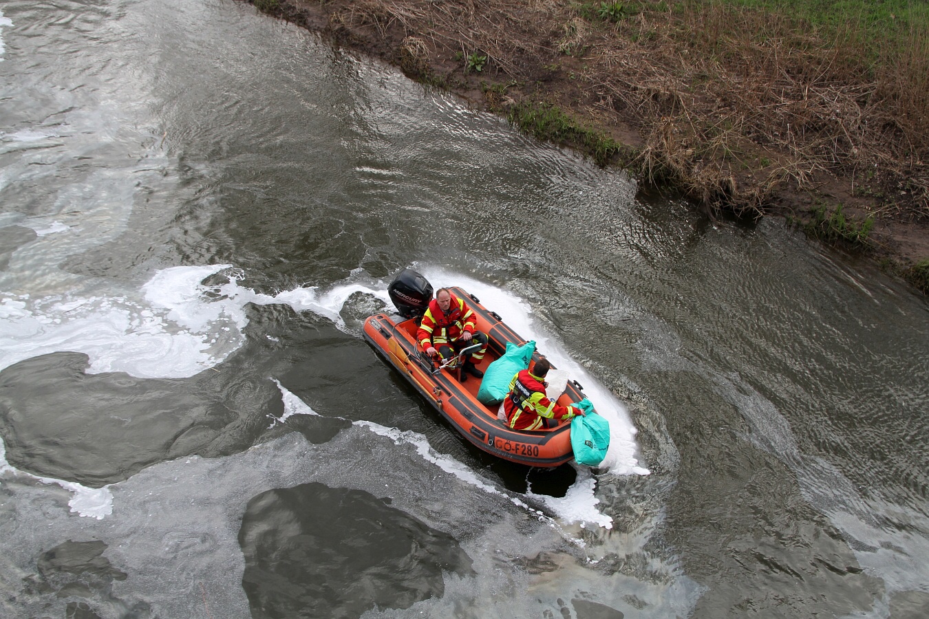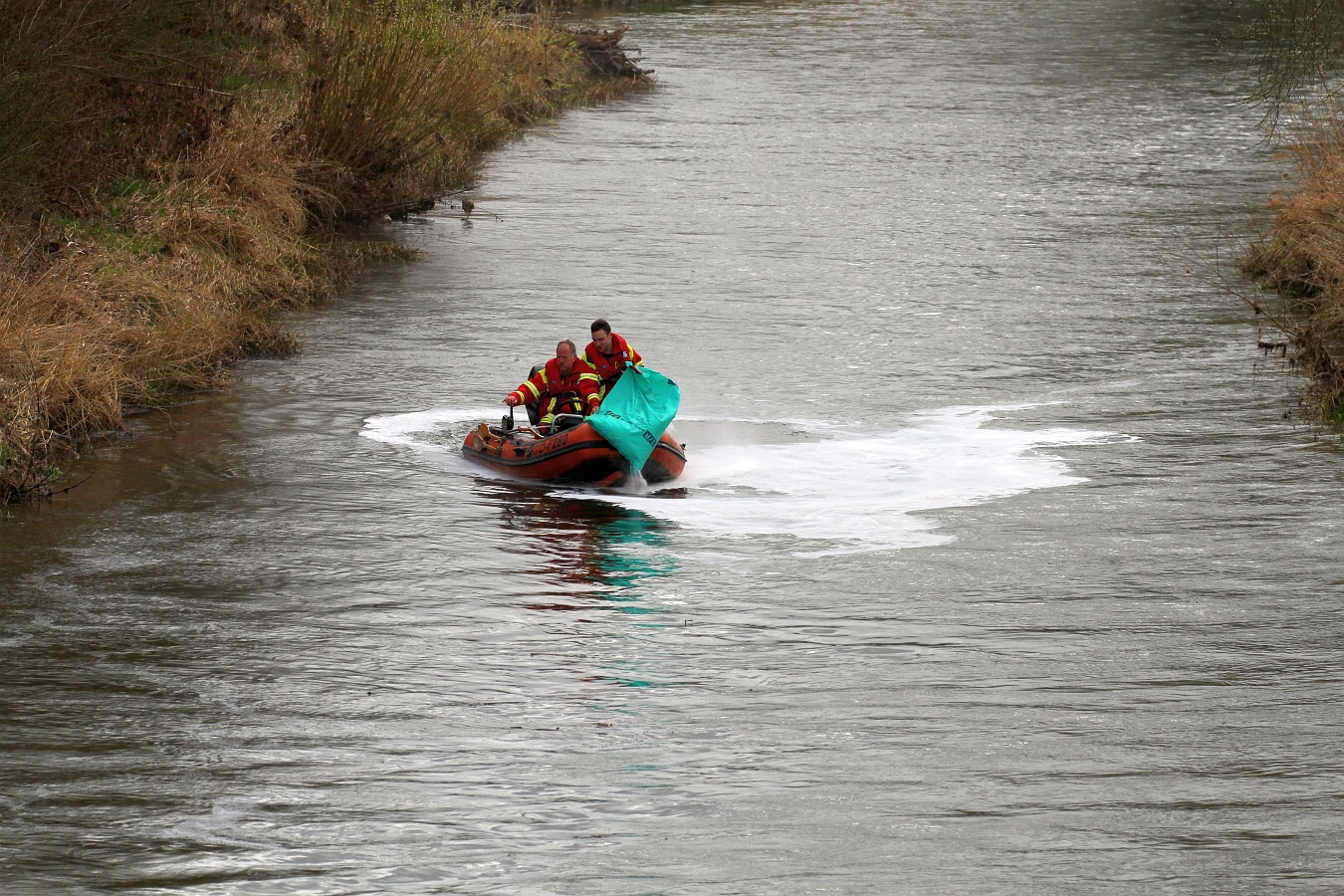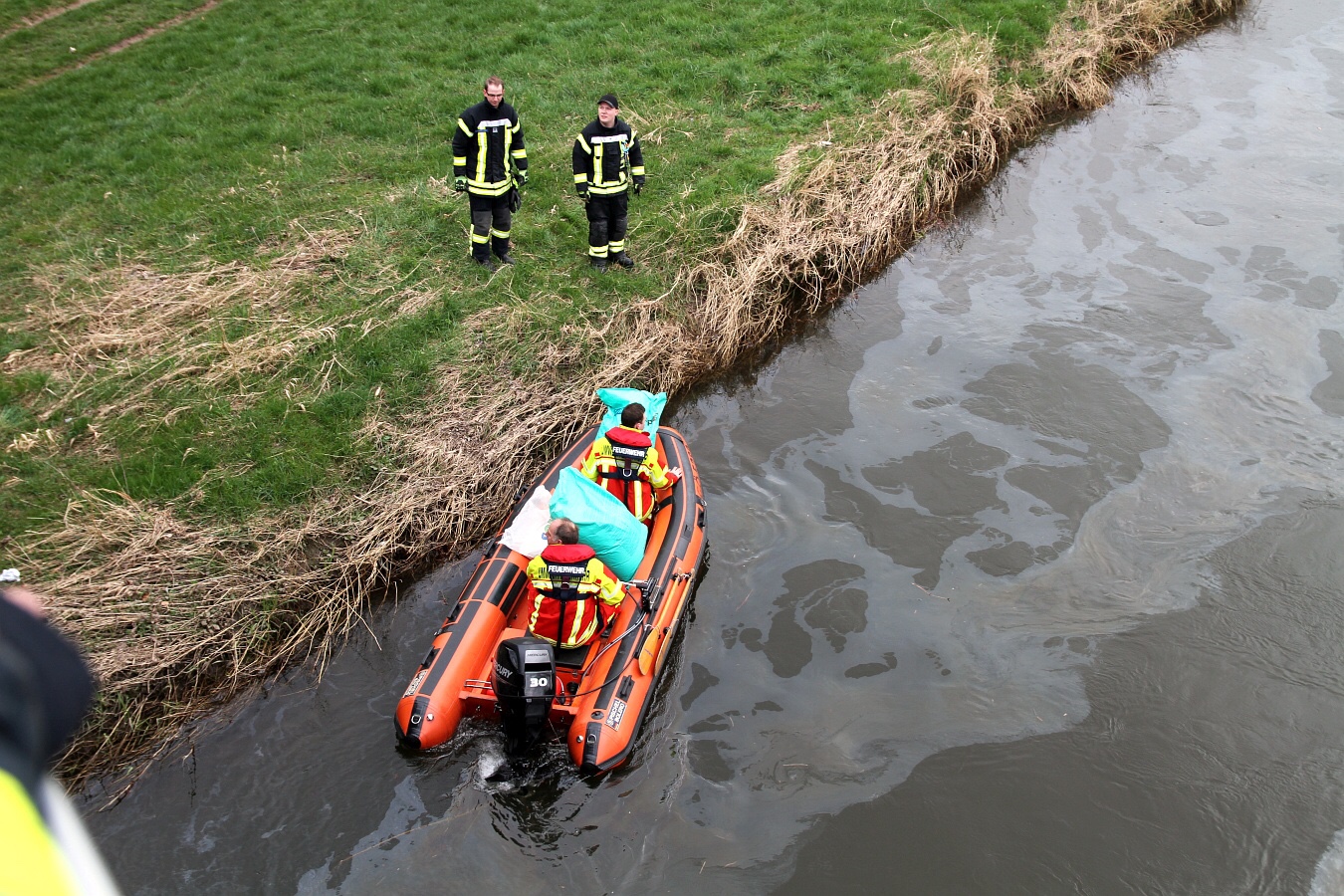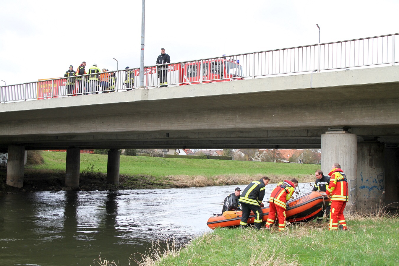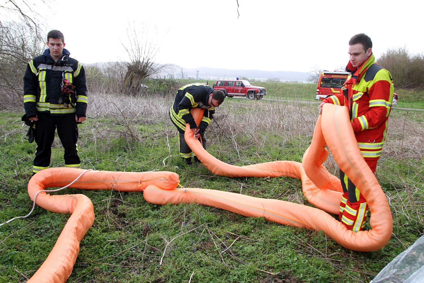 Die Einsatzkräfte legten im Bereich der Kläranlage drei Ölsperren. Mit einem Boot suchten Fachkräfte nach der Ursache. Nachdem die Ölsperren errichtet waren, wurde im Bereich der Langen Brücke Ölbindemittel in die Rhume geschüttet.