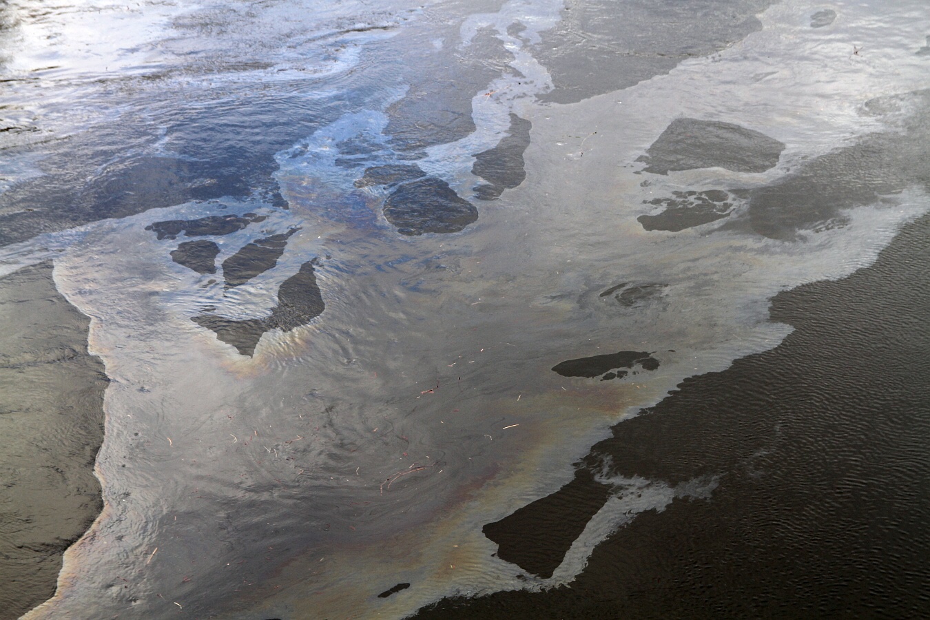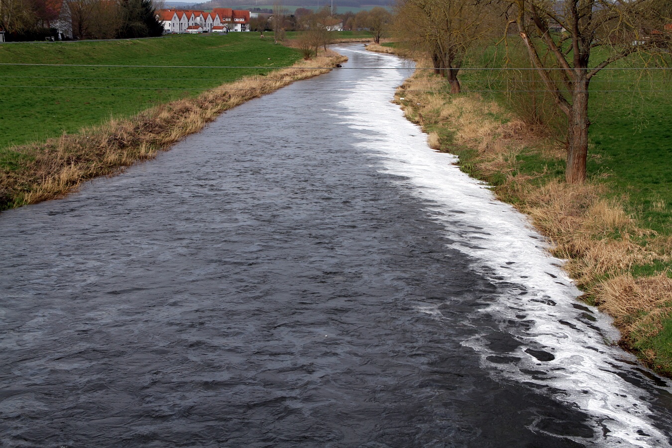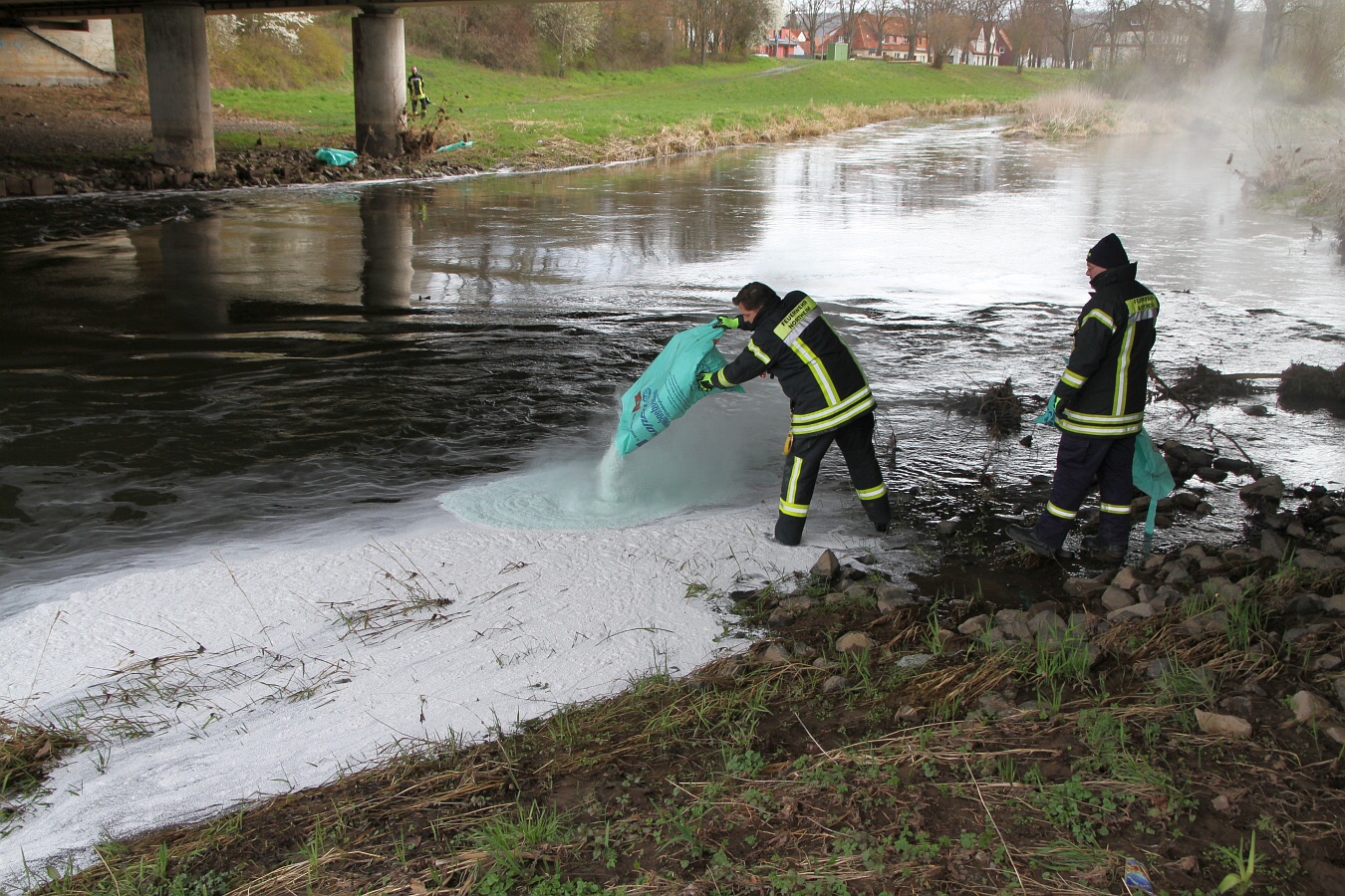 Ein riesiger Ölfilm war am Dienstagmittag auf der Rhume in Northeim zu erkennen. Feuerwehr und Fachkräfte waren stundenlang im Einsatz. Die Polizei ermittelt.
