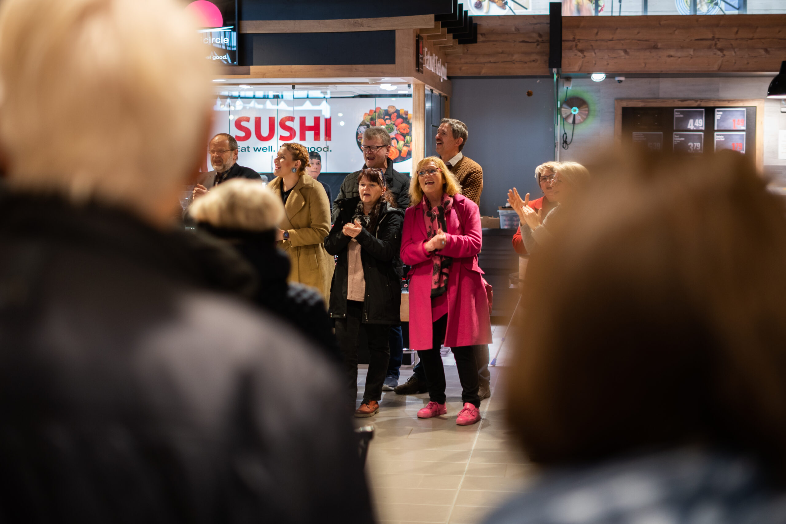 Zunächst spielte Günter Stöfer auf dem Klavier vor, ehe aus alle Himmelsrichtungen und teilweise mit Einkaufswagen die Sängerinnen und Sänger zwischen Kühltheke, Sushibar und Süßigkeitenregal nach und nach zusammenkamen, um gemeinsam eine Stimme zu bilden.